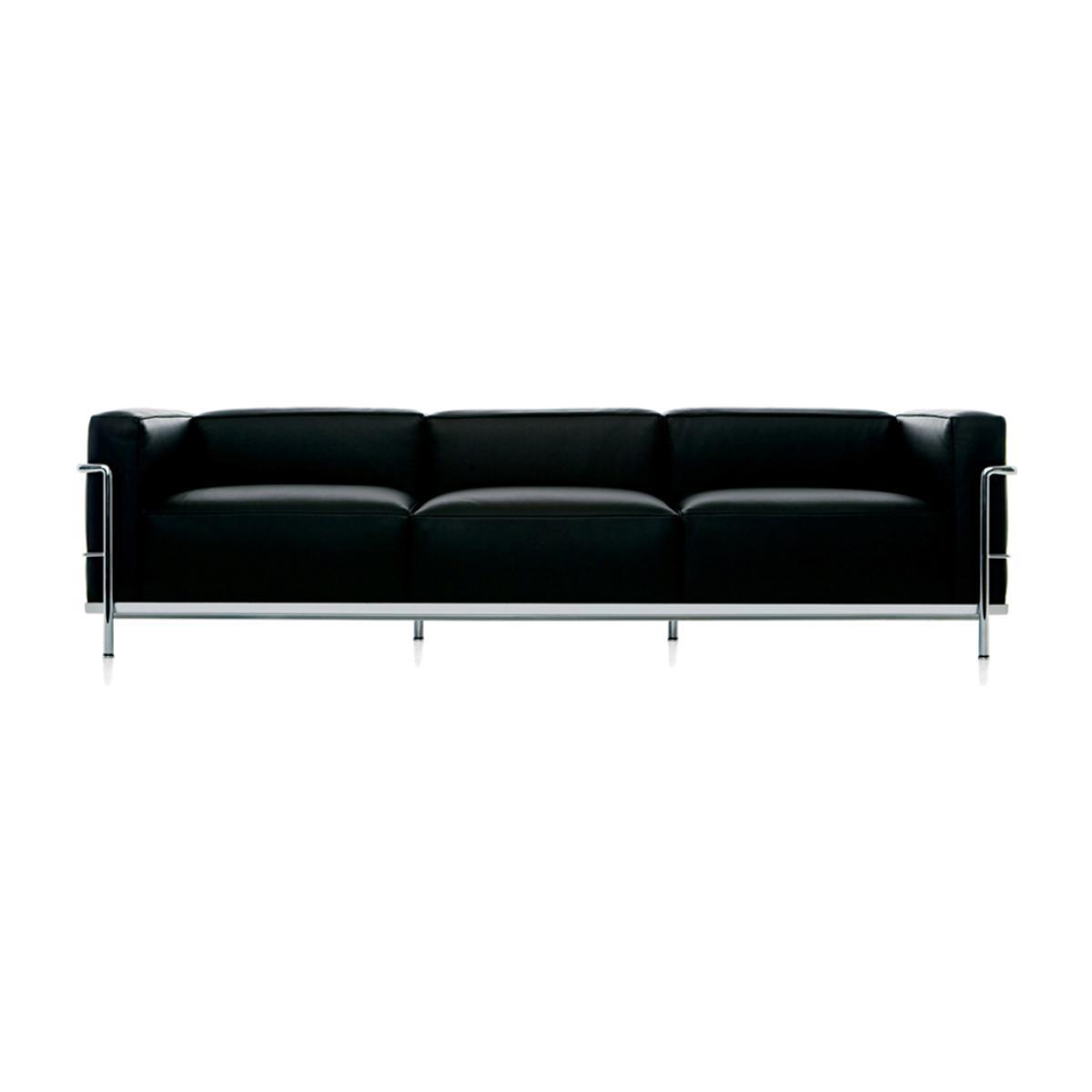 Revive your interiors with the LC3 3-Seater Sofa in polished trivalent chrome plated steel and graphite Scozia leather, a design classic by Le Corbusier, Charlotte Perriand and Pierre Jeanneret for Cassina. Originally designed in 1928, this timeless modernist design has a sculptural shape and comfortable arm rests that ensure this sofa was ahead of its time. Crafted from a chromed tubular steel frame that supports the graphite Scozia leather seats, the LC3 3-Seater Sofa is padded with feathers for optimal comfort. With its machine-age materials and lack of ornamentation, the 1928 LC3 3-Seater Sofa, manufactured by Cassina, is a classic example of the refined functional aesthetic that was embraced by such designers as Le Corbusier, Charlotte Perriand and Pierre Jeanneret. Part of the Cassina I Maestri collection, the LC3 3-Seater Sofa is a certified original design. Each sofa is marked with the designers' signatures and the Cassina I Maestri logo, alongside the production number and identity card.