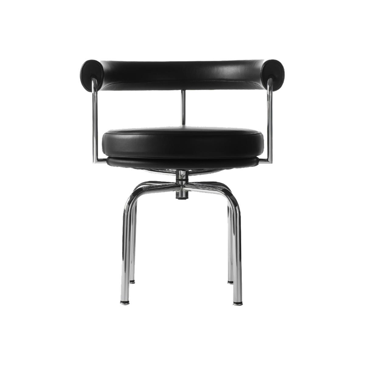 Originally designed by Charlotte Perriand in 1927, the LC7 Armchair in chrome and black leather is crafted by Cassina and is integrated within the collection co-signed by Le Corbusier, Pierre Jeanneret and Charlotte Perriand. Intended for Perriand's apartment in Paris' Place Saint-Sulpice, this compact armchair was first exhibited at the 1928 Salon des Artistes Décorateurs and subsequently at the 1929 Salon d'Automne. Designed to be used as a dining or office chair, the chromed steel and leather chair has a swivel seat that enables the user to turn from side to side to speak with fellow diners or co-workers, without straining their back. Padded with CFC-free polyurethane foam and polyester wadding, this comfortable armchair is sure to lend a touch of contemporary design to any space.