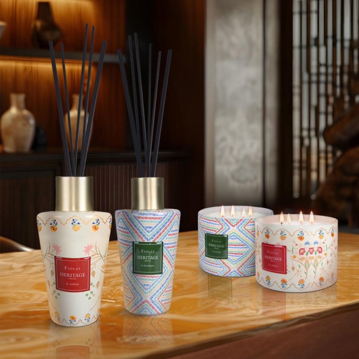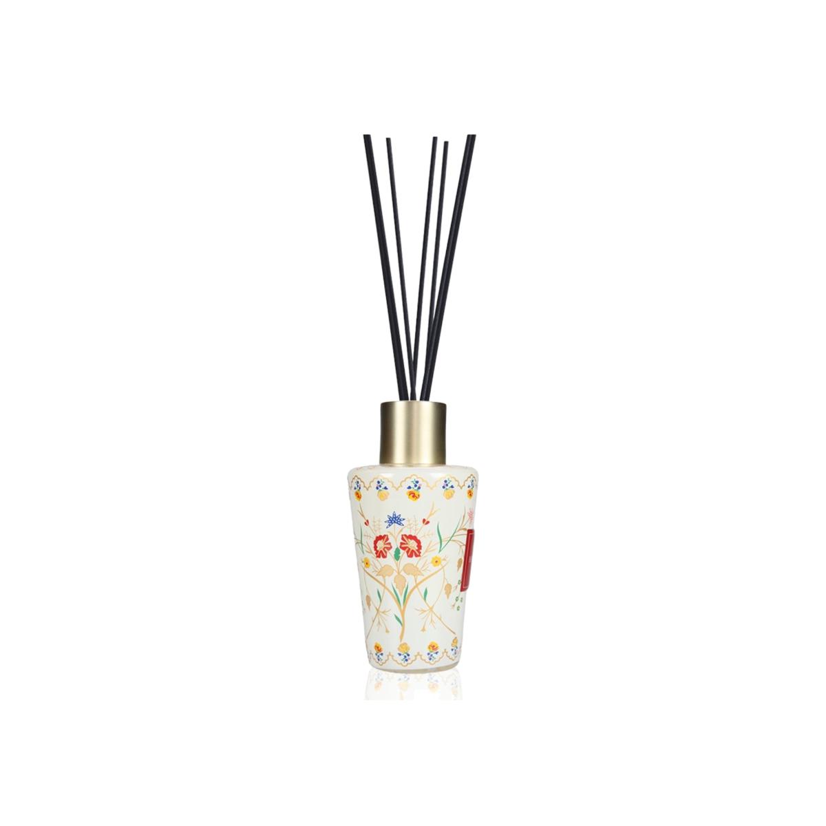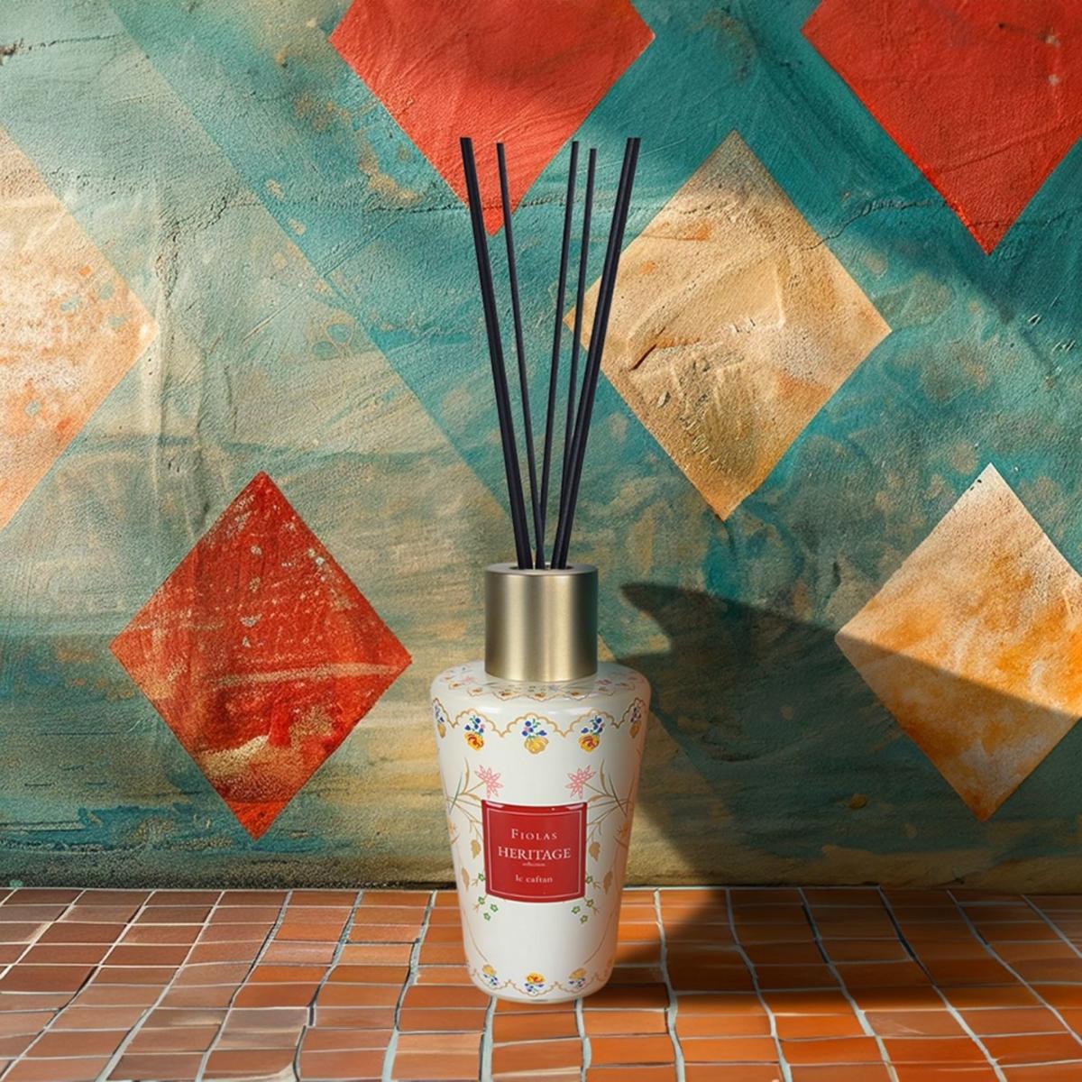 Inspired by the elegant mosaics of centuries-old palaces, this diffuser adds a stunning touch to your space. Blended with bergamot, jasmine, rose, patchouli, sandalwood, and musk, it creates a historic ambiance. Pour the Fiolas Refill into the glass bottle and place the bamboo sticks; the fragrance diffuses within 24 hours. Adjust intensity by adding or removing sticks, flipping them weekly. Made with 100% organic alcohol, the diffuser provides months of long-lasting fragrance. For external use only; avoid contact with hands, face, body, food, and eyes. Keep out of reach of children.