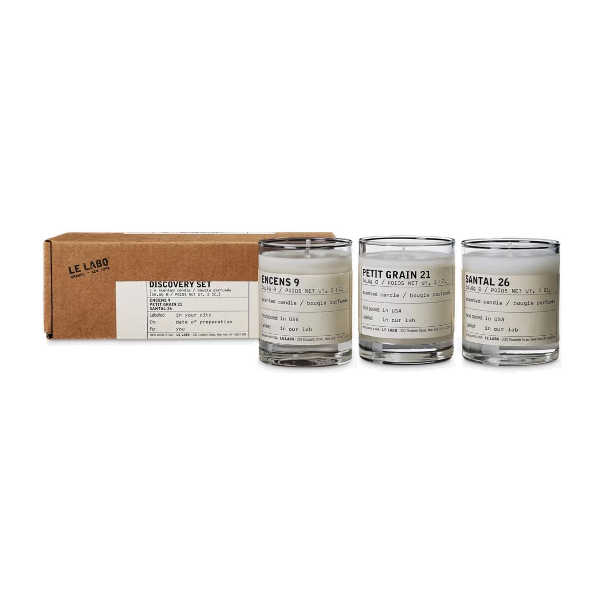 Our candles are developed with a high dose of fragrance oils, a custom blend of waxes, and wicks constructed with natural fibres to ensure a beautiful olfactive experience. Carefully poured by hand in the US, these candles are packaged in glass vessels and tucked into our classic kraft box. Please read the instructions before use and don’t forget to trim the wicks! Set contains: Encens 9, 56.6g Figue 15, 56.6g Santal 26, 56.6g