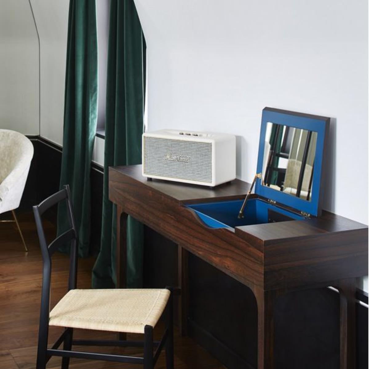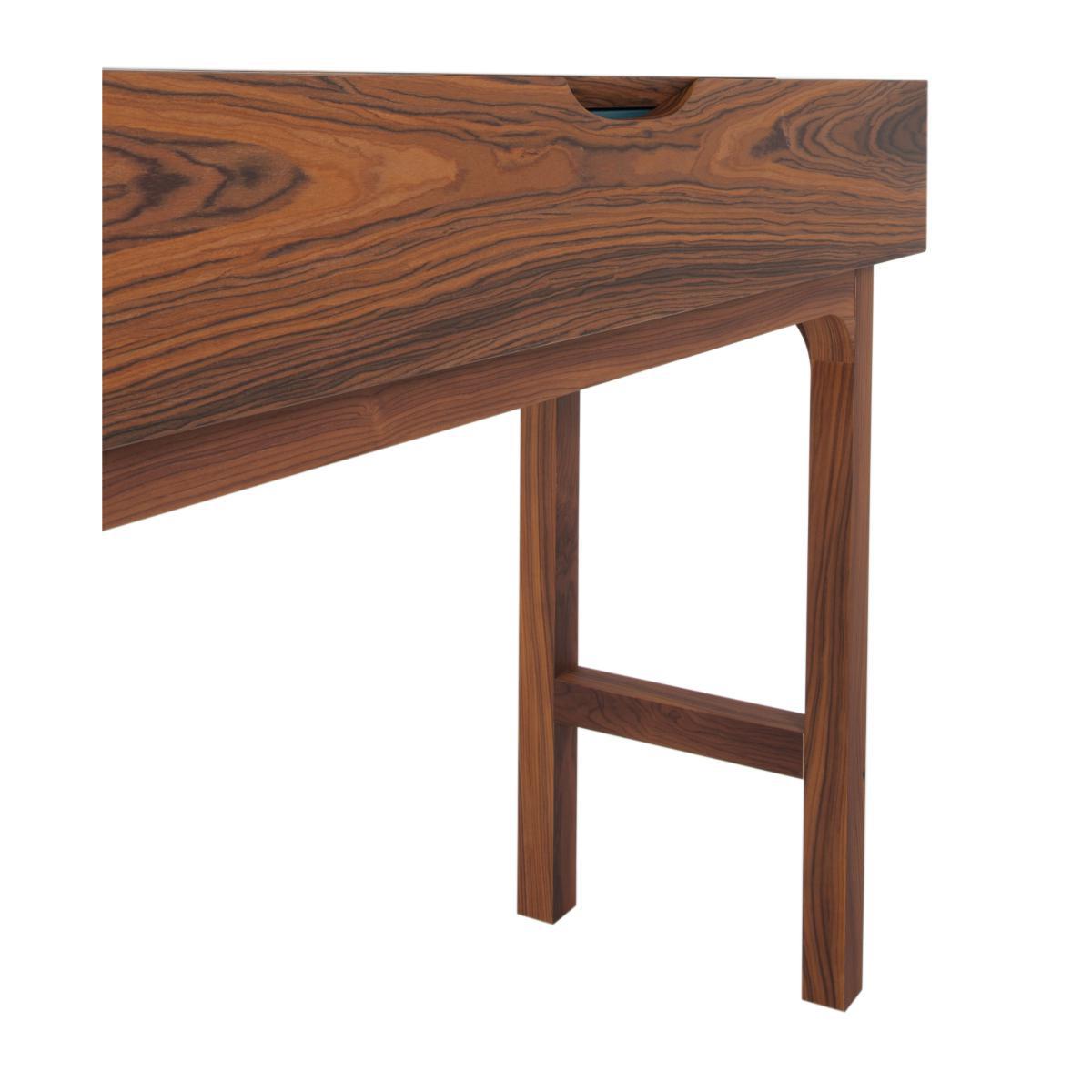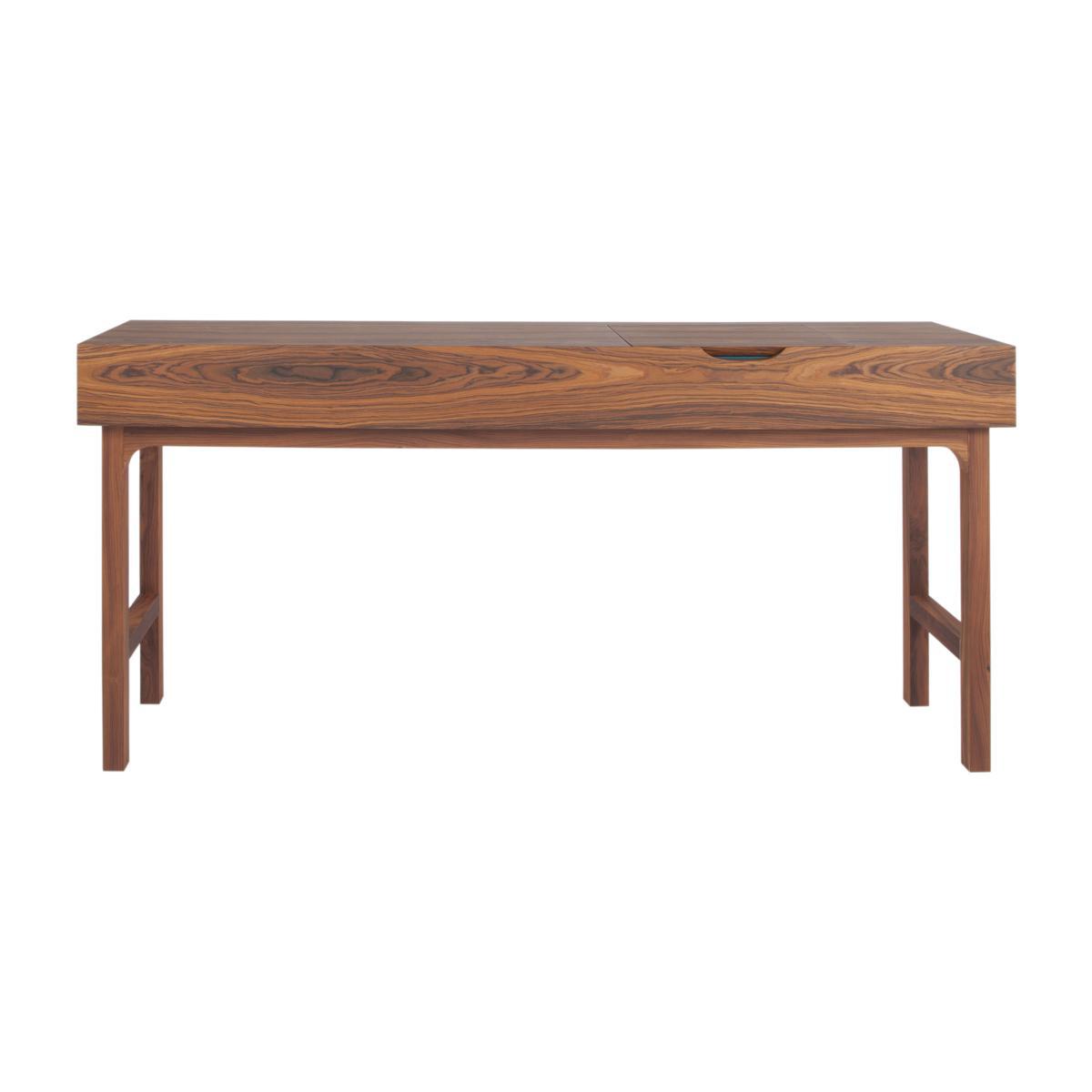 A luxurious and refined console designed originally to furnish the suites of the five-star Le Roch Hotel in Paris. It is made entirely of rosewood veneer. This noble wood has a beautiful dark grain. Wonderfully soft and tactile, rosewood is very sensual to the touch. To the right of the table top there is a panel that when lifted reveals a bright blue lacquered-wood box. The handle hints at a thin strip of blue colour; a contrast in colours and styles that creates a surprising harmony between tradition and modernity. Its practical box is a discrete storage space for personal belongings. There is a mirror tucked under the lid of the box. It is a multifunction item of furniture that can be used as a desk, dressing table or console.