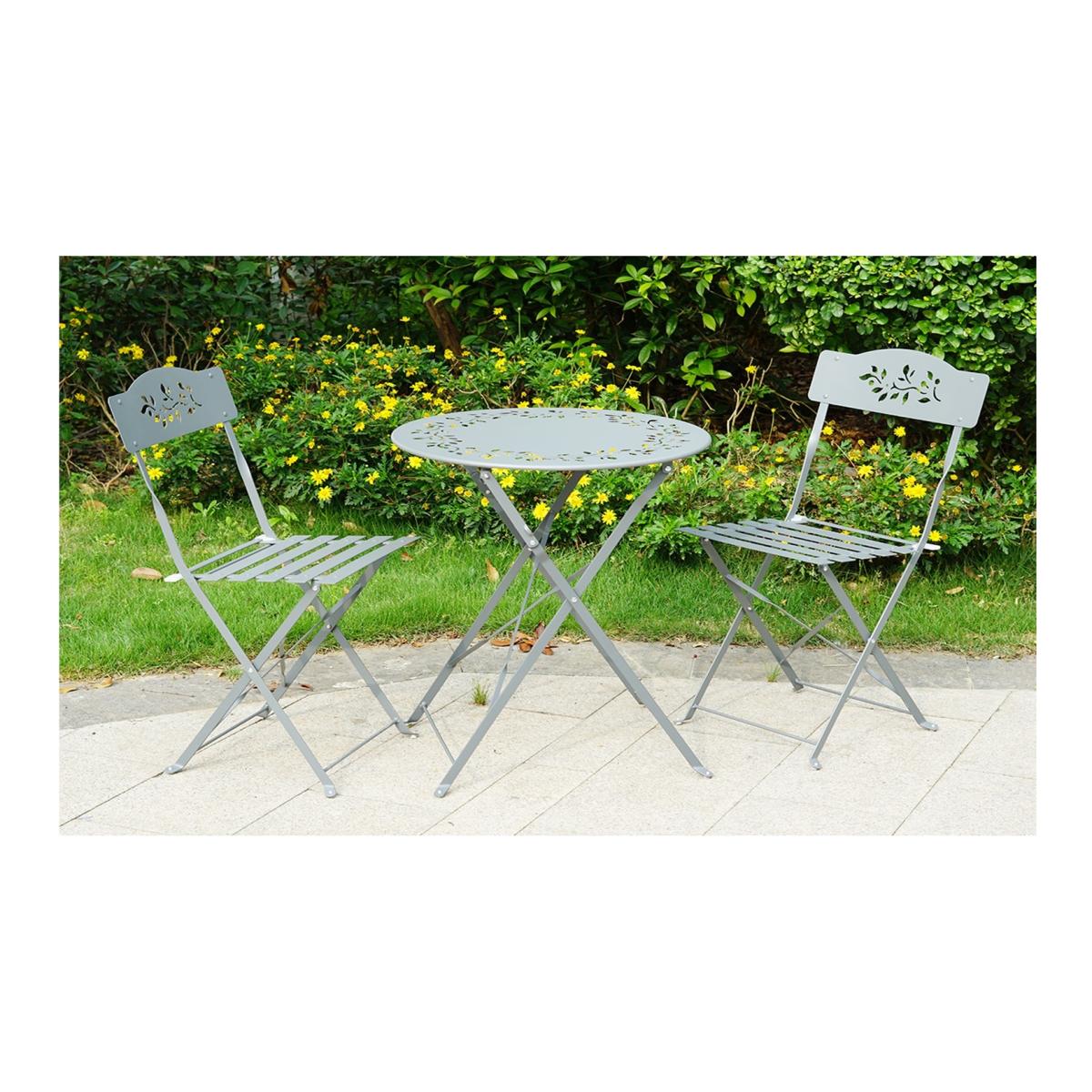Gr8 Garden 3 Piece Grey Metal Garden Outdoor Balcony Patio 2 x Folding Chairs Round Foldable Table Bistro Furniture Set Olive Leaf Design. This metal folding bistro set is a convenient and space-saving outdoor furniture ensemble. This 3-piece set features a foldable table and two chairs, ideal for compact areas. The metal construction ensures durability, while the foldable design allows for easy storage. Enjoy stylish and functional outdoor seating with this stylish and practical Bistro Set. High capacity & Heavy-duty, 1 table and 2 chairs included. Table size: (Height x Diameter) H-71cm x D-60cm. Chair size: (Height x Width x Depth) H-83cm x W-42cm x D-38cm. Thicken Metal material to get a greater bearing capacity. This chair maximum load capacity is 120kg, Durable, Colour: Grey