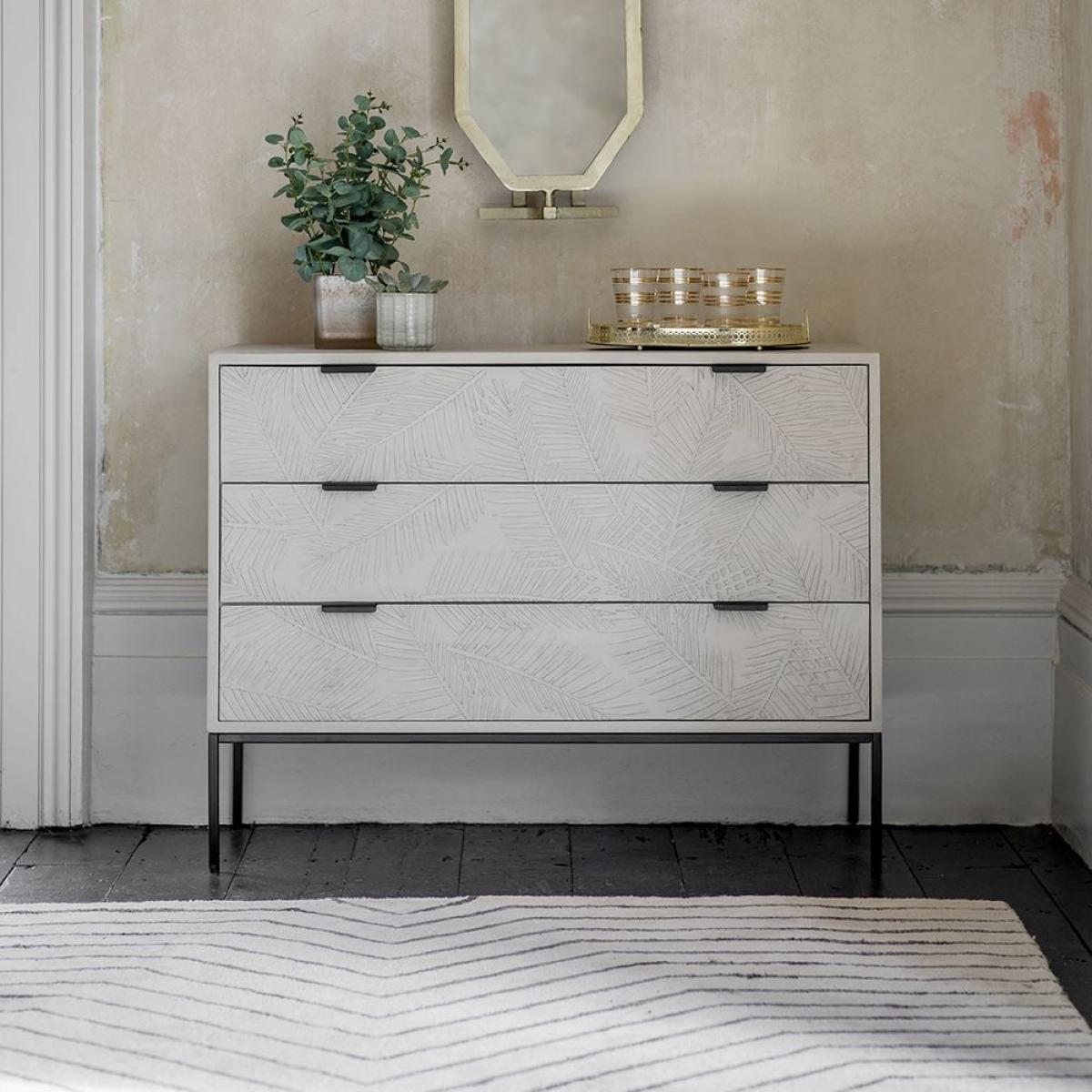 Offering extra storage space in the bedroom or guest room, our new Leaf Chest of Drawers has three spacious drawers for clothes and accessories. The whitewashed mango wood design has an intricate leaf engraving, contrasted with on-trend black metal powder coated legs and handles.