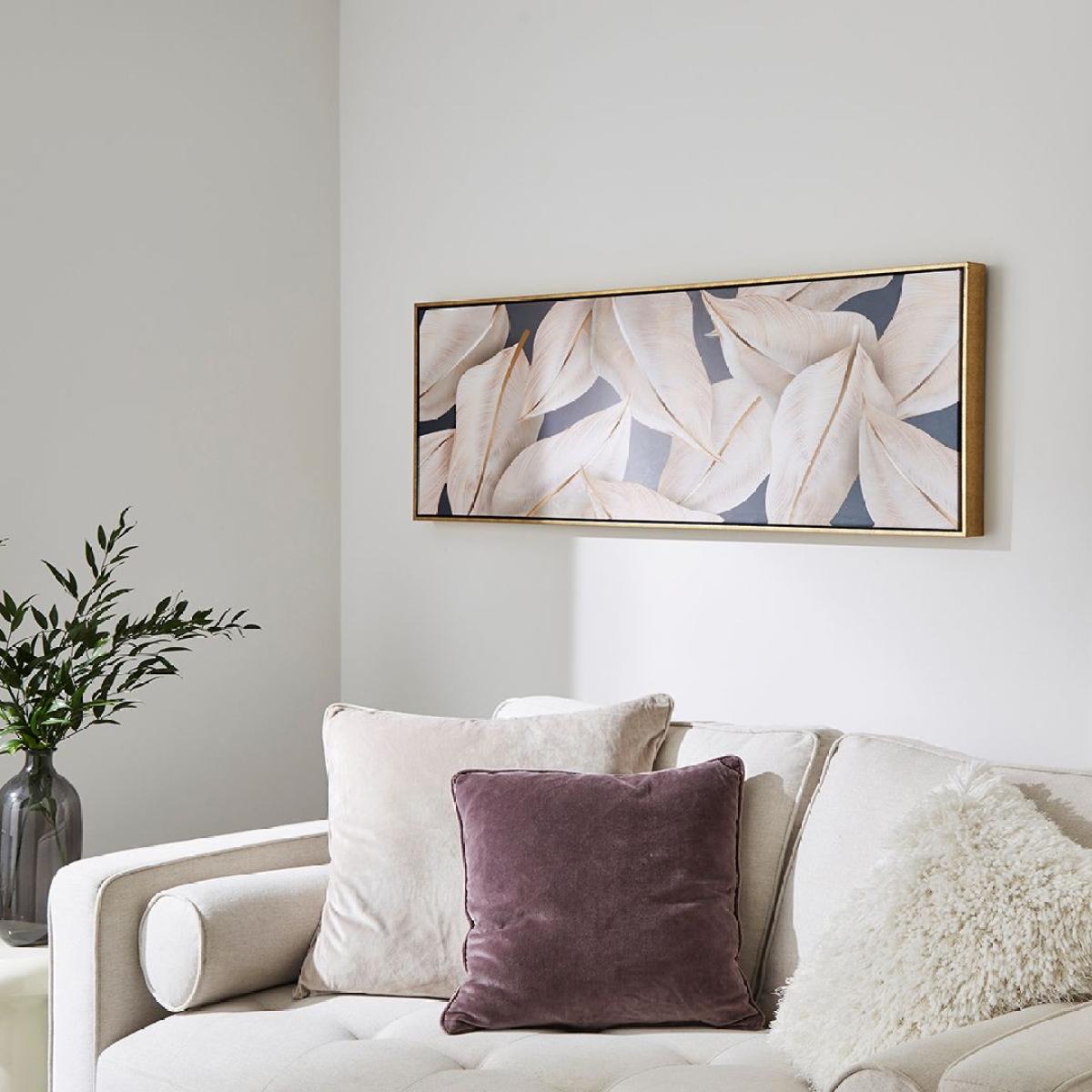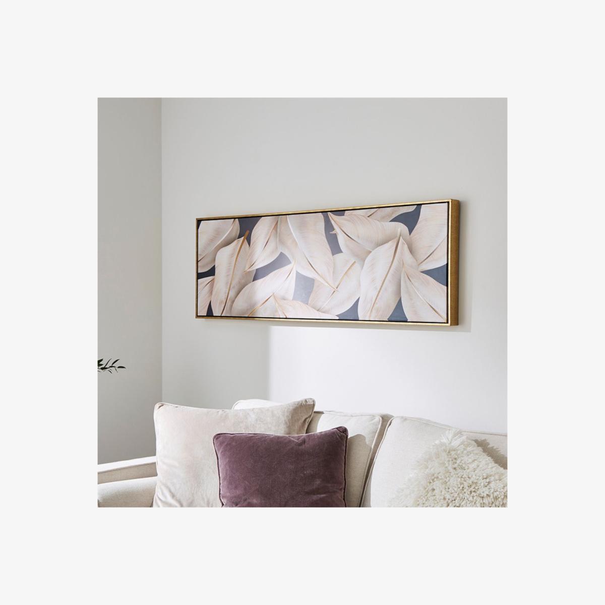 Leaf printed canvas wall art with gold frame. Elegant and understated, the Leaf framed canvas wall art features a long rectangular design and brings a modern botanical feel to your décor. A white leafy design stretches across a rich, dark blue background, creating a striking contrast. Set within a stunning gold frame, the piece adds a touch of sophistication while maintaining a clean, contemporary aesthetic. Ideal for wall spaces needing a pop of personality or as part of a gallery wall, it offers a subtle nod to nature with a stylish, modern twist. Leaf printed canvas wall art with gold frame. Elegant and understated, the Leaf framed canvas wall art features a long rectangular design and brings a modern botanical feel to your décor. A white leafy design stretches across a rich, dark blue background, creating a striking contrast. Set within a stunning gold frame, the piece adds a touch of sophistication while maintaining a clean, contemporary aesthetic. Ideal for wall spaces needing a pop of personality or as part of a gallery wall, it offers a subtle nod to nature with a stylish, modern twist.