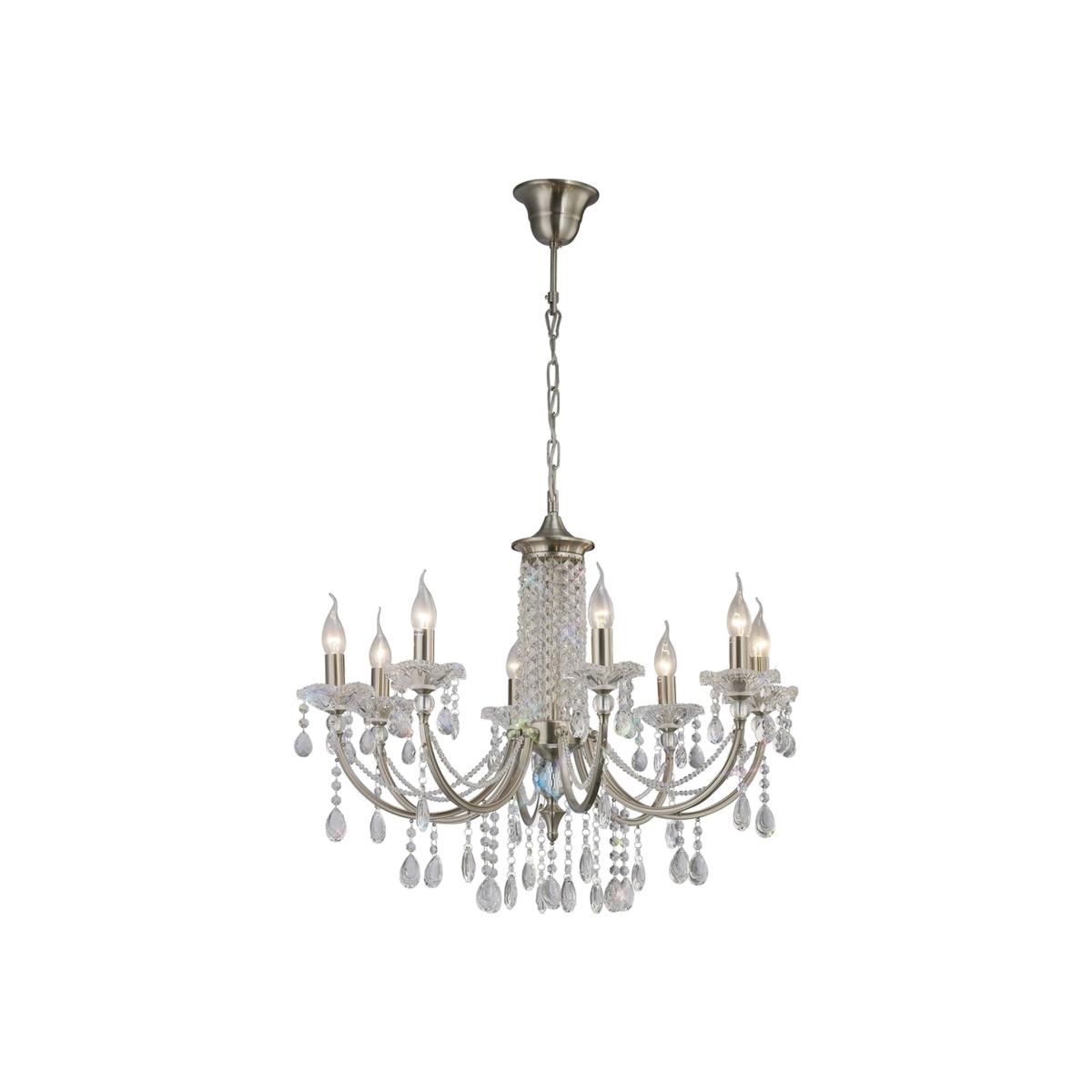 This is a traditional range of chandeliers and a single wall lamp finished in Satin Nickel, designed around vintage inspirations. The fitting brings a modern element in the form of beaded crystal strands paralleled from the centre column along the arms, combined with crystal droplets hanging from the arms and sconces. The substantially sized pendalogue crystals displayed at the bottom of the frame create an eye-catching centre piece.