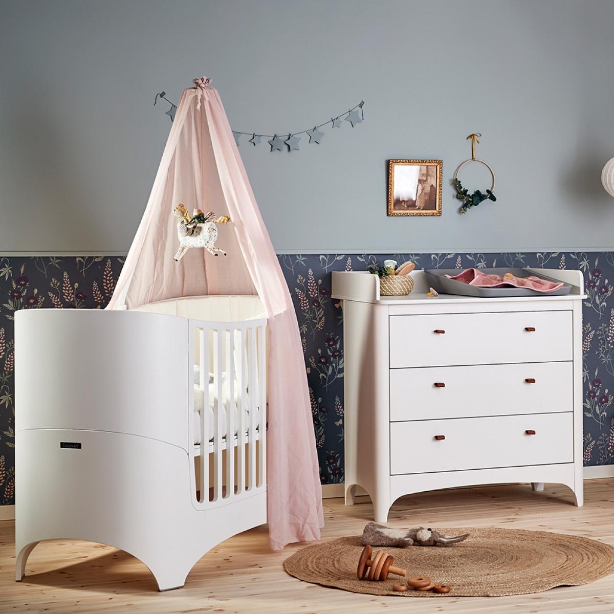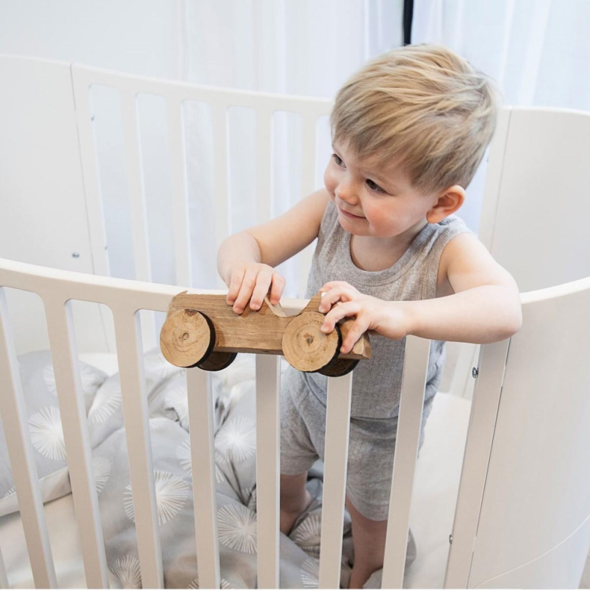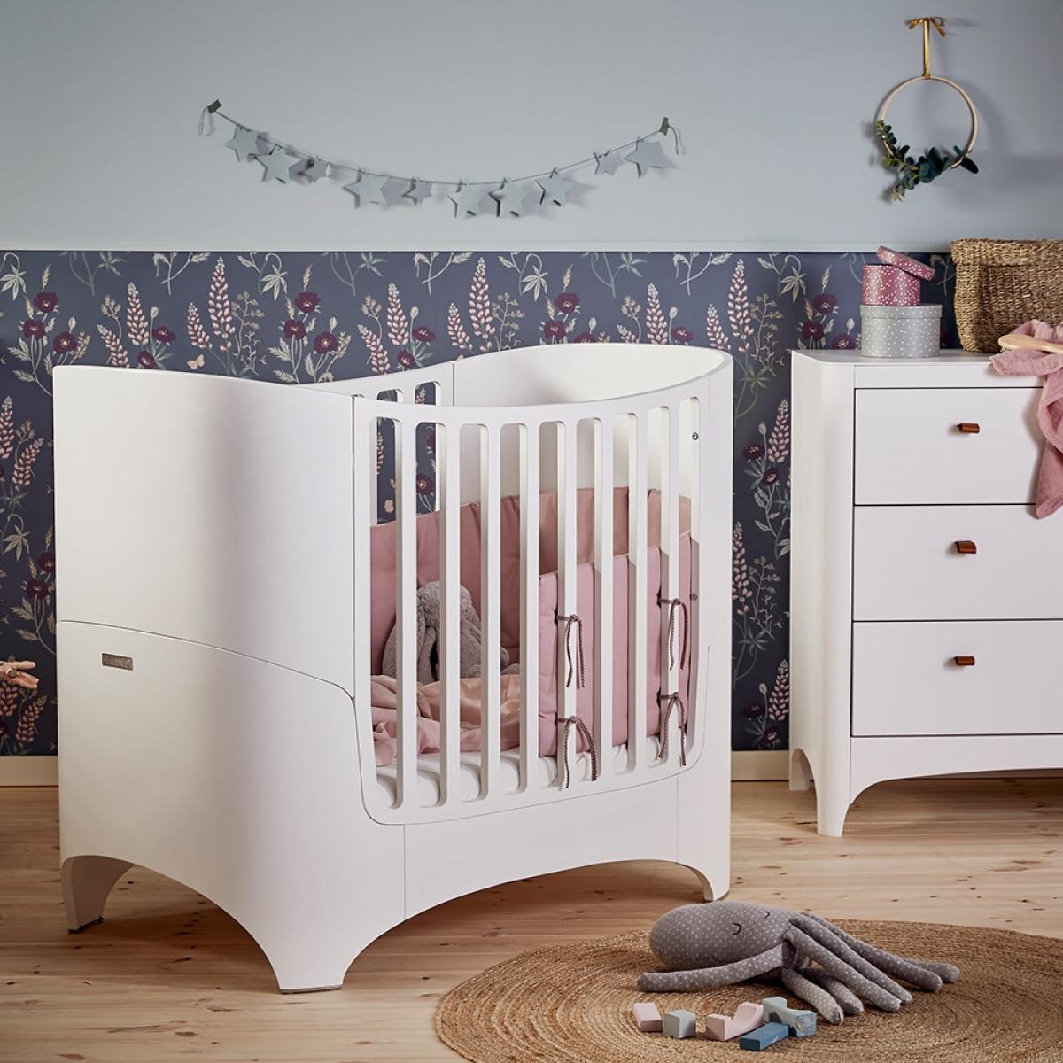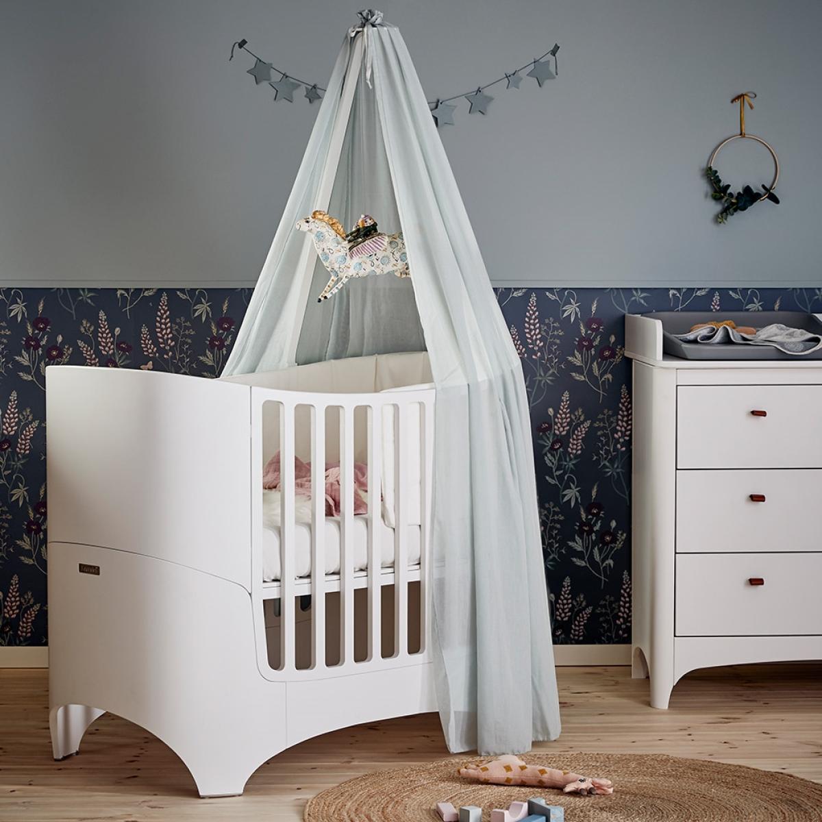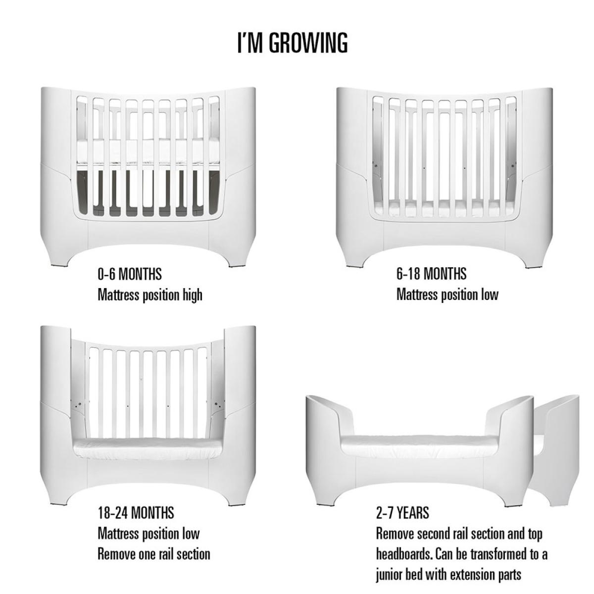 From birth to 7 years, the Leander Cot adapts to suit the needs of your little one. The unique design will stimulate your child's imagination and encourage their development. The compact size makes it ideal for smaller bedrooms and leaves more space for games & activities. The bed can convert into five different designs so it grows with your baby. With the optional conversion kit, the designer baby bed can extend into a stylish single bed. Both the unique cot and junior bed have the Leander rounded shape. The Baby Bed has been manufactured using moulded European Beech Wood and finished with water based lacquer. Available in four different colour options; Whitewash, Grey, White or Walnut there is a Leander cot for every nursery!.