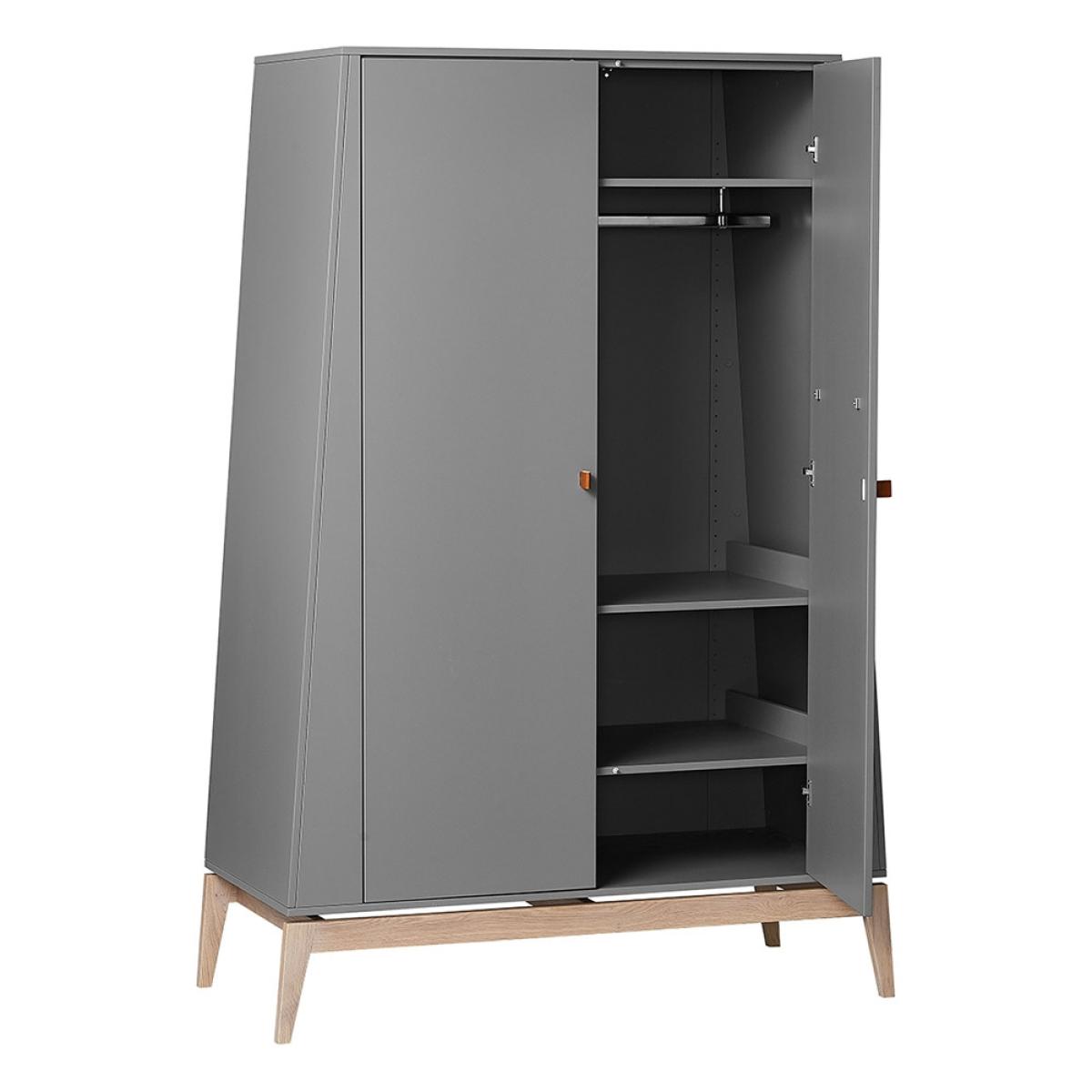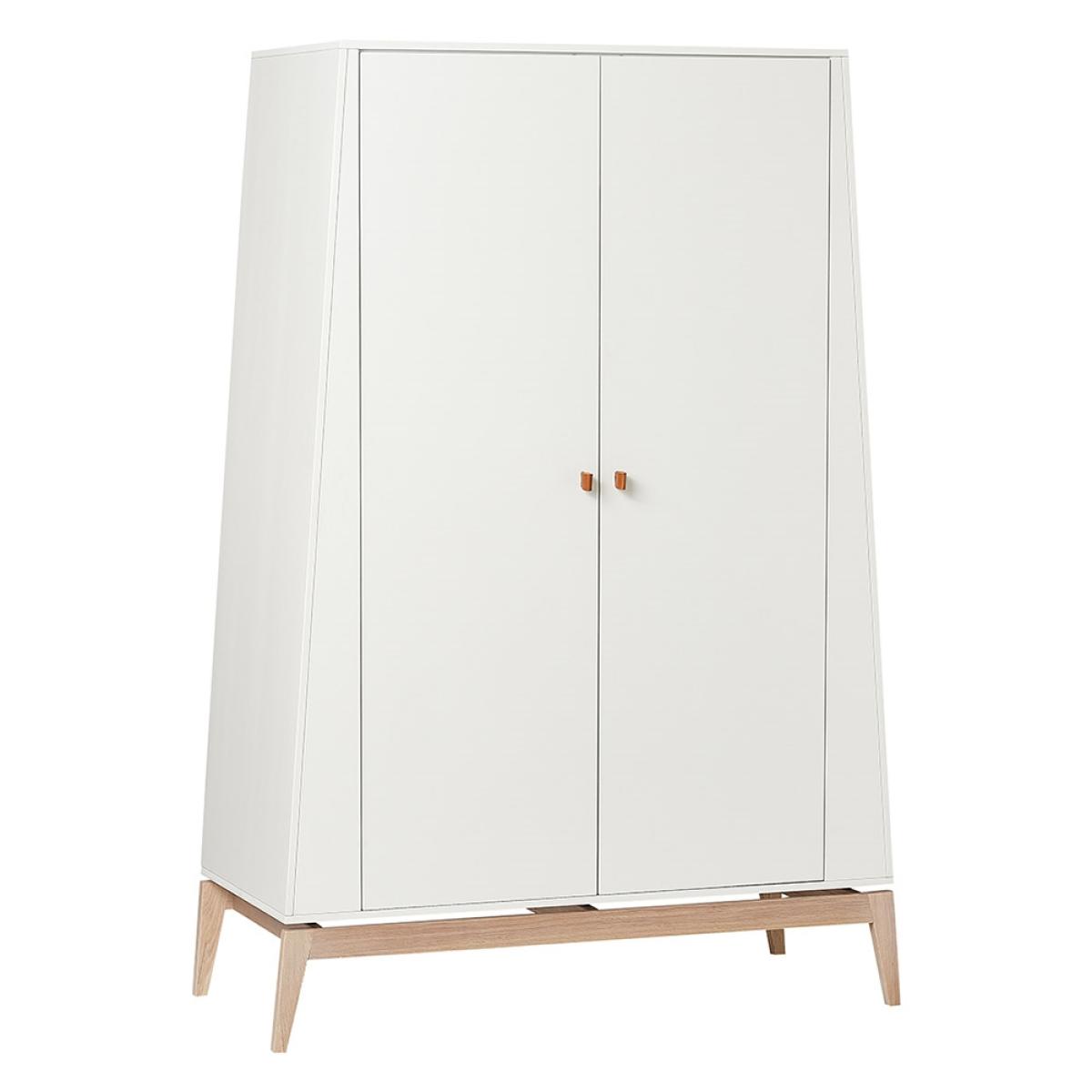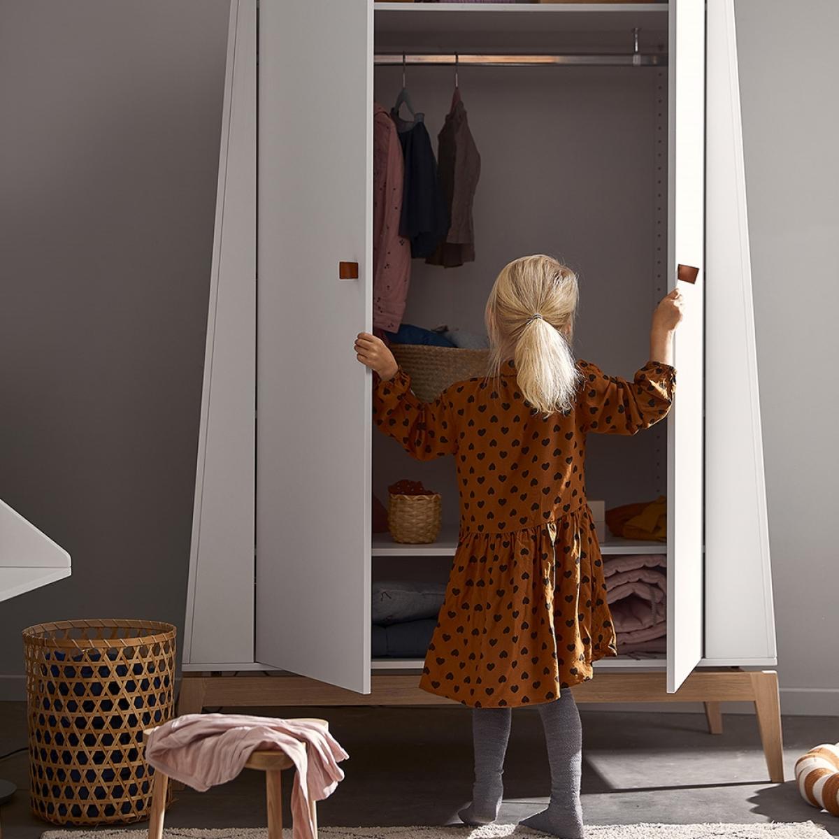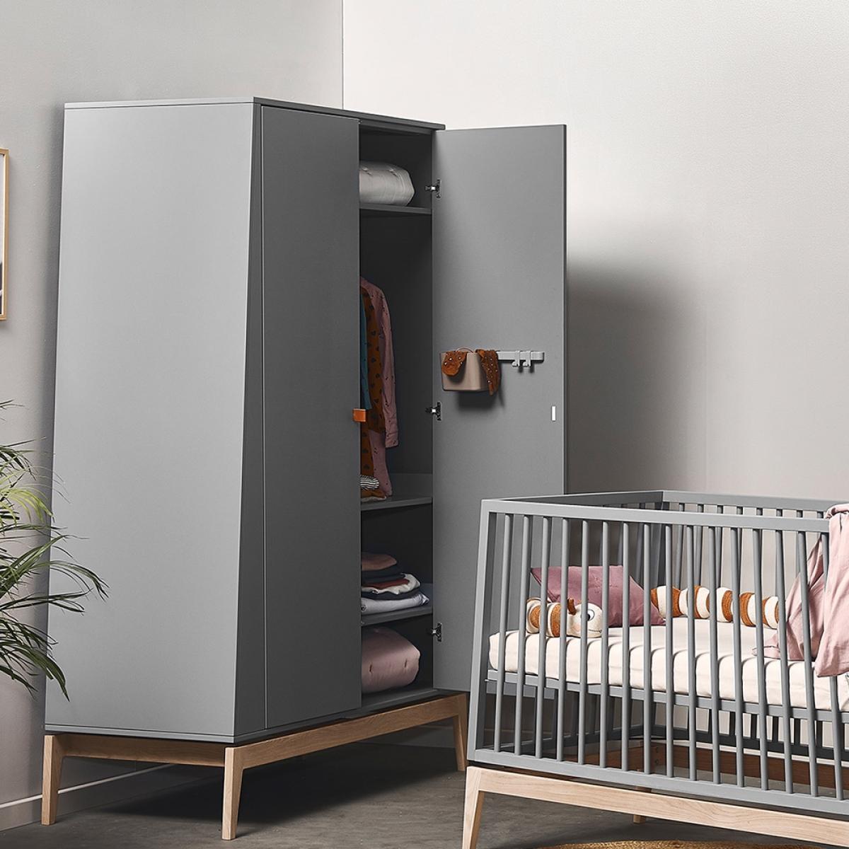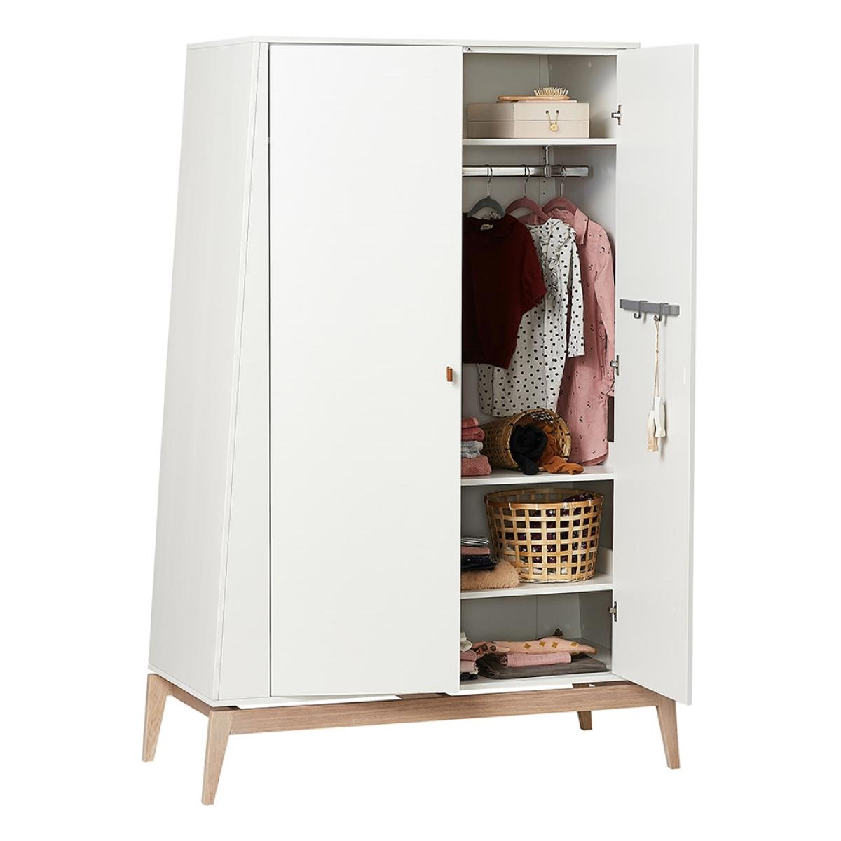 The gorgeous Leander Luna Large Wardrobe with 2 Doors is the perfect storage solution for your child's room. Its solid oak legs create a lightness to the design as the wardrobe appears to almost float above. With a large hanging rail and three movable shelves, there will be heaps of storage for all of those gorgeous outfits and treasured cuddly toys and games. Why not add a few storage boxes to tidy away all your little ones many loved bits and bobs. The wardrobe will be perfect as your little one grows and the soft leather handles are ideal for little hands, when they wake up in the morning they can pick out their favourite outfit to wear. Although be warned this may include that beloved princess dress or superhero outfit!. Features and Benefits:.