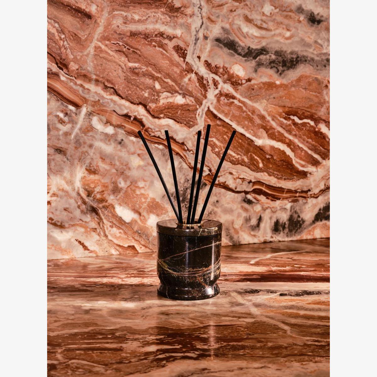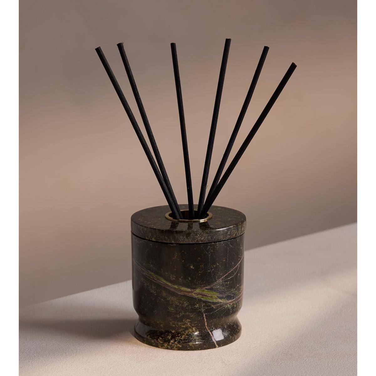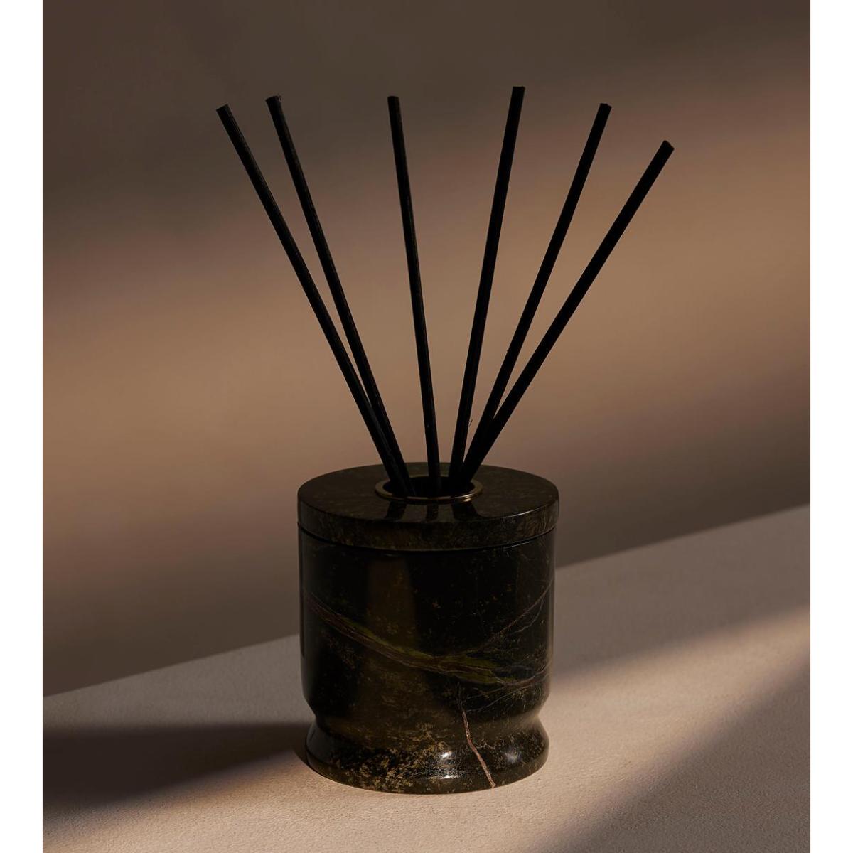 Notes of sandalwood, patchouli and oud create a smoky, aromatic scent in a marble holder. Rich, woody notes of oud and patchouli give way to a warm sandalwood base for this smoky, aromatic fragrance. Its unique, Forest Green marble vessel is filled with 6 reeds that will fragrance your home for up to 12 weeks. Top notes:Oud, Heart notes: Patchouli, Base notes: Sandalwood