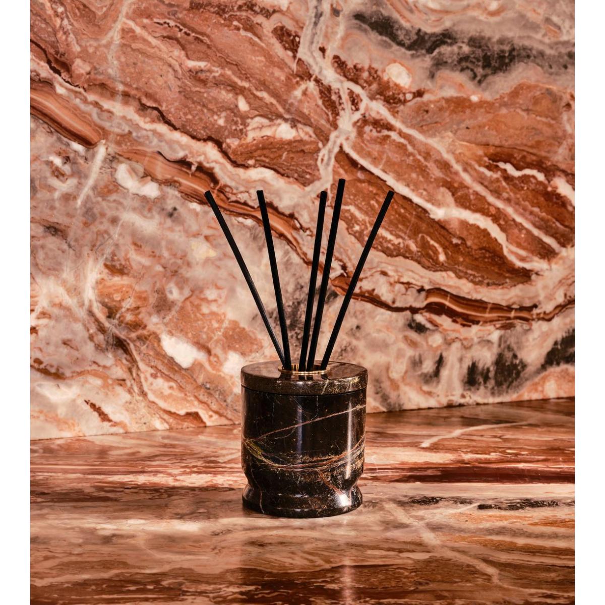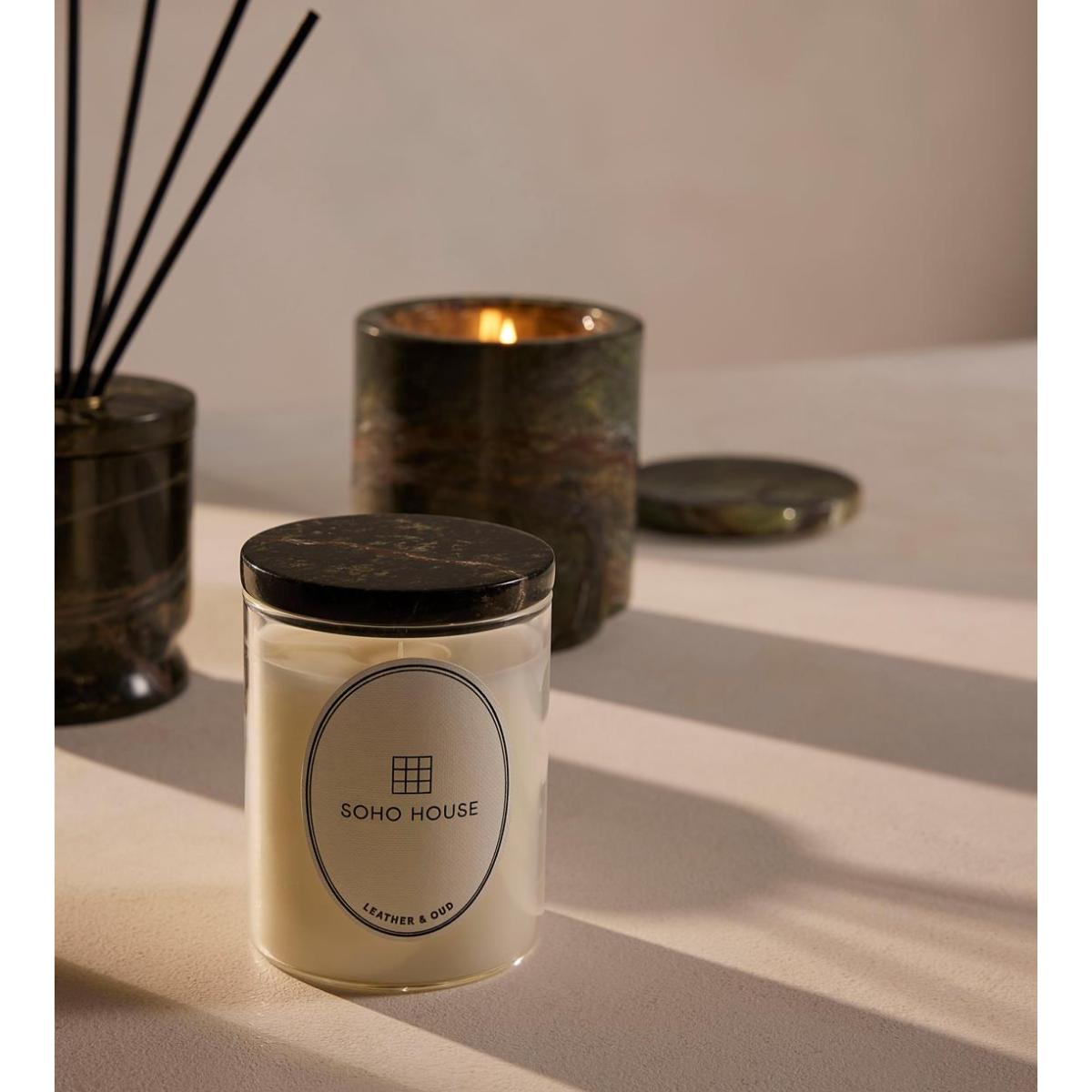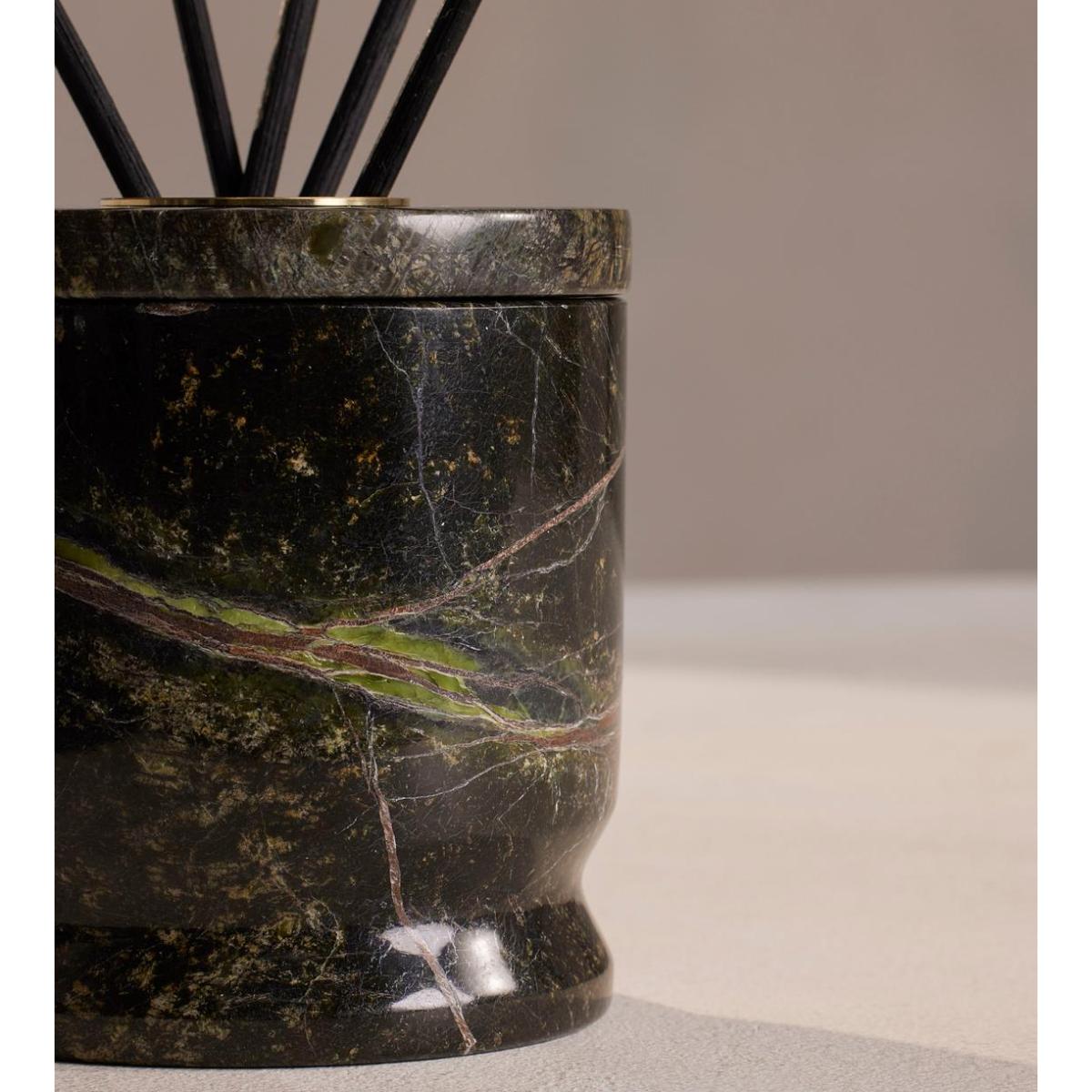 Notes of sandalwood, patchouli and oud create a smoky, aromatic scent in a marble holder. Rich, woody notes of oud and patchouli give way to a warm sandalwood base for this smoky, aromatic fragrance. Its unique, Forest Green marble vessel is filled with 6 reeds that will fragrance your home for up to 12 weeks. Top notes:Oud, Heart notes: Patchouli, Base notes: Sandalwood