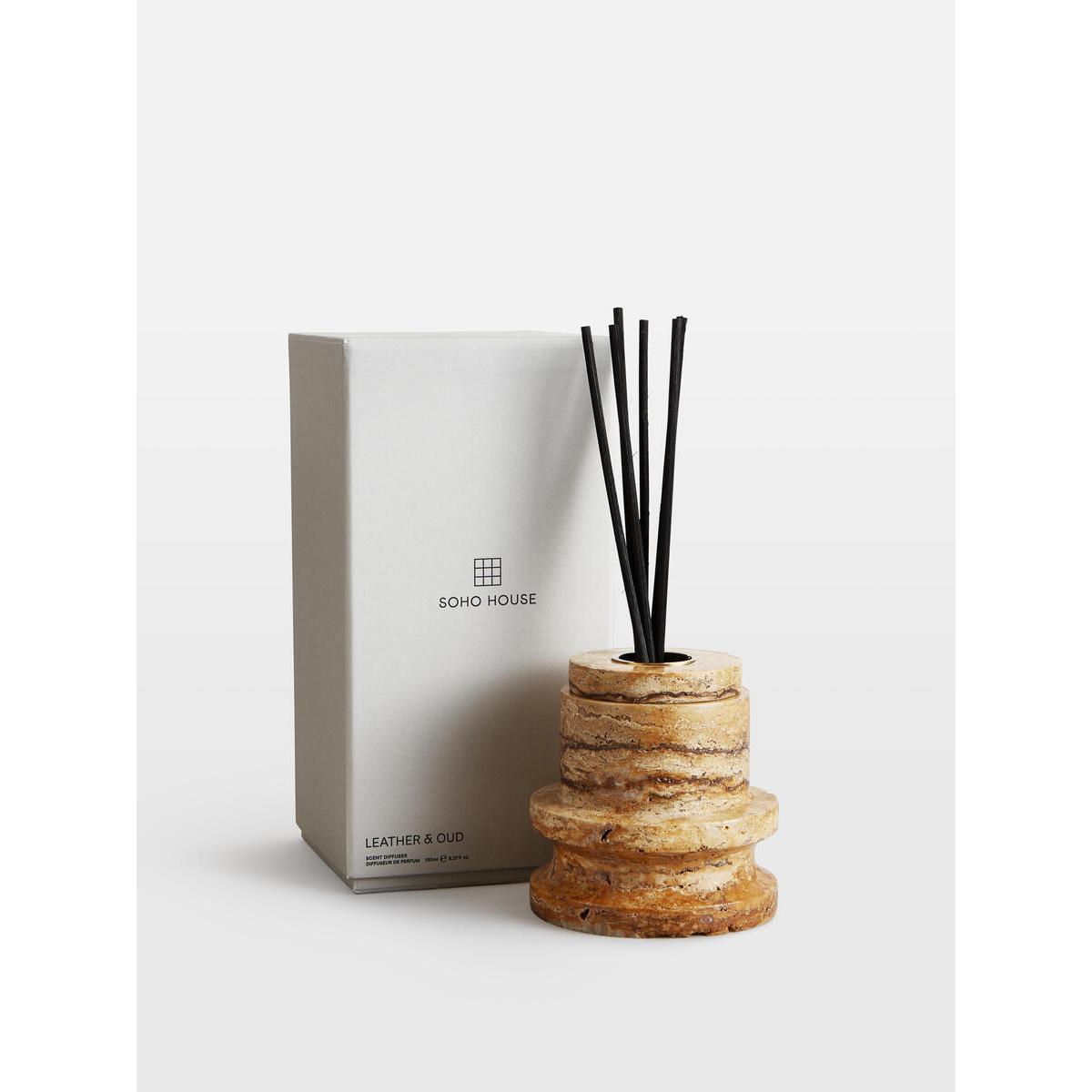 Handcrafted from French gold marble, with unique variations inthe stone, our Leather & Oud fragrance is reminiscent ofnightcaps at Soho House Hong Kong. The deeply aromatic scent ofworn Leather and Oud creates a warming evening mood. Each candle ishand poured in England using a blend of mineral and vegetable waxthat provides a clean burn and long-lasting scent release. Scent notes. Top: Oud. Middle: Patchouli. Base: Sandalwood. Large candle. Leather & Oud fragrance. Hand poured in England. Solid marble vessel with natural variations that make each oneunique. Reusable vessel with lid. Vegan-friendly blend of mineral and vegetable wax. Bespoke fragrance created by an expert perfumer for Soho. House. Inspired by Soho House Hong Kong.