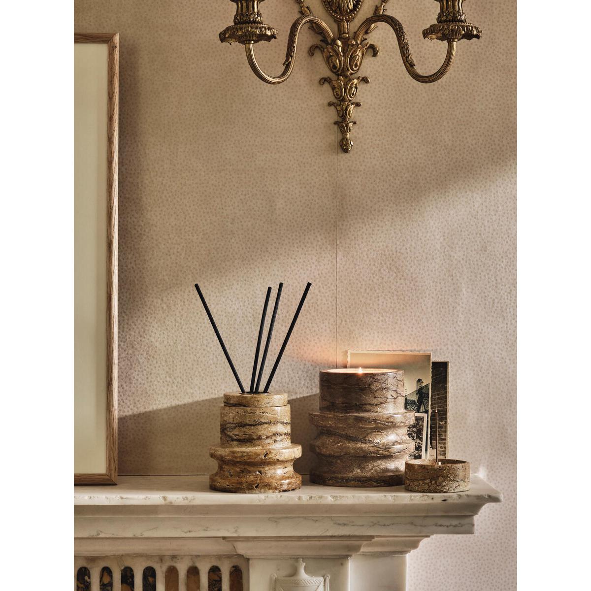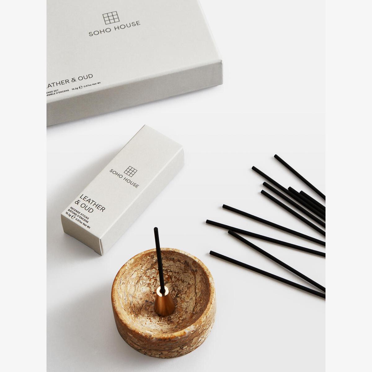 The Trento incense holder is crafted from French gold marblewith natural variations in the stone, making each one unique. Itincludes 30 of our Leather & Oud incense sticks, reminiscent ofnightcaps at Soho House Hong Kong. The deeply aromatic scent ofworn Leather and Oud creates a warming evening mood. Scent notes. Top: Oud. Middle: Patchouli. Base: Sandalwood. Trento incense holder with 30 incense sticks. Infused with our Leather & Oud fragrance. French gold marble vessel with natural variations that makeeach one unique. Each incense stick lasts approximately 20 minutes. Bespoke fragrance created by an expert perfumer for Soho. House. Inspired by Soho House Hong Kong.