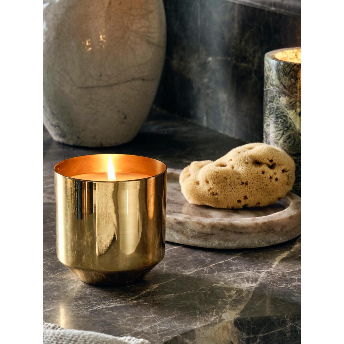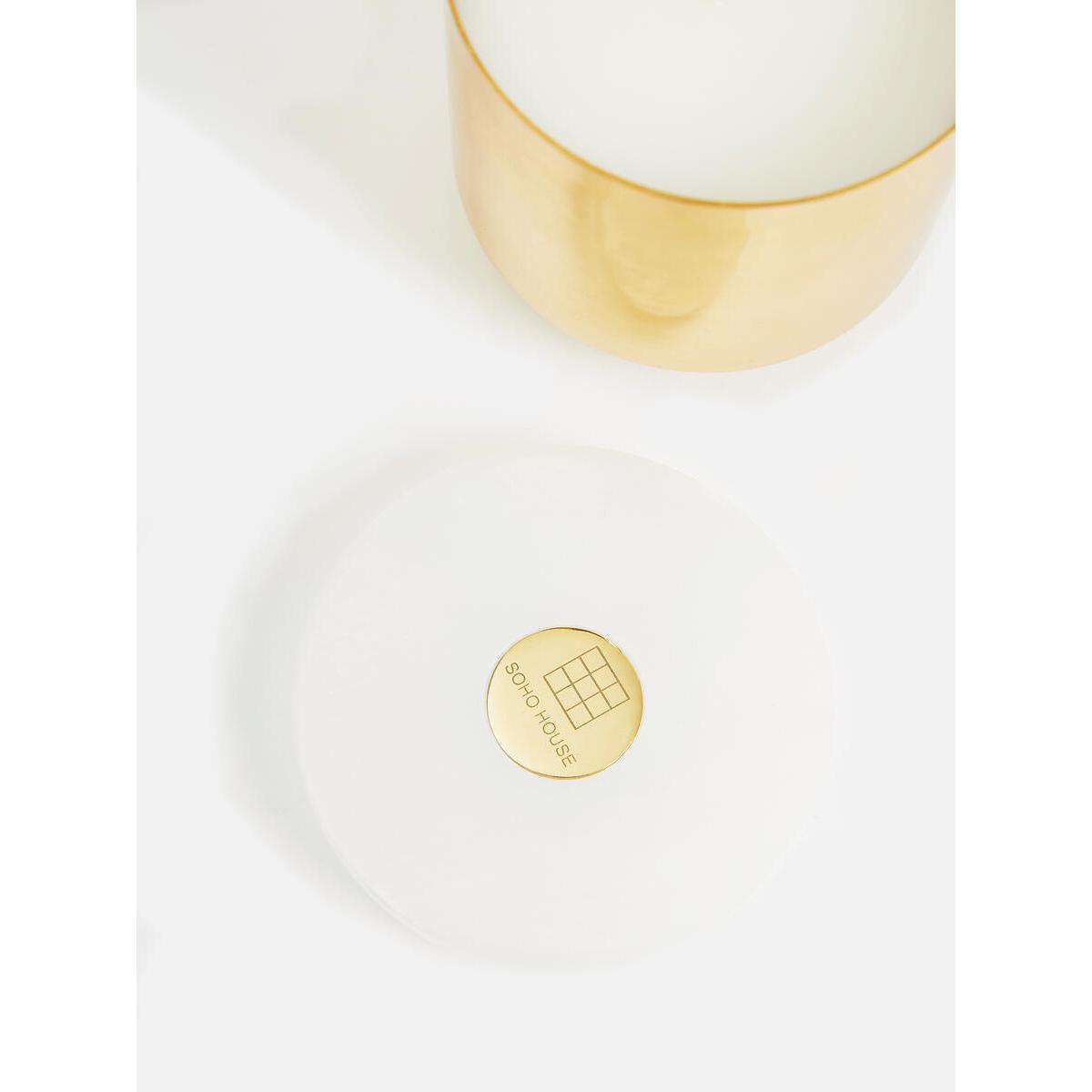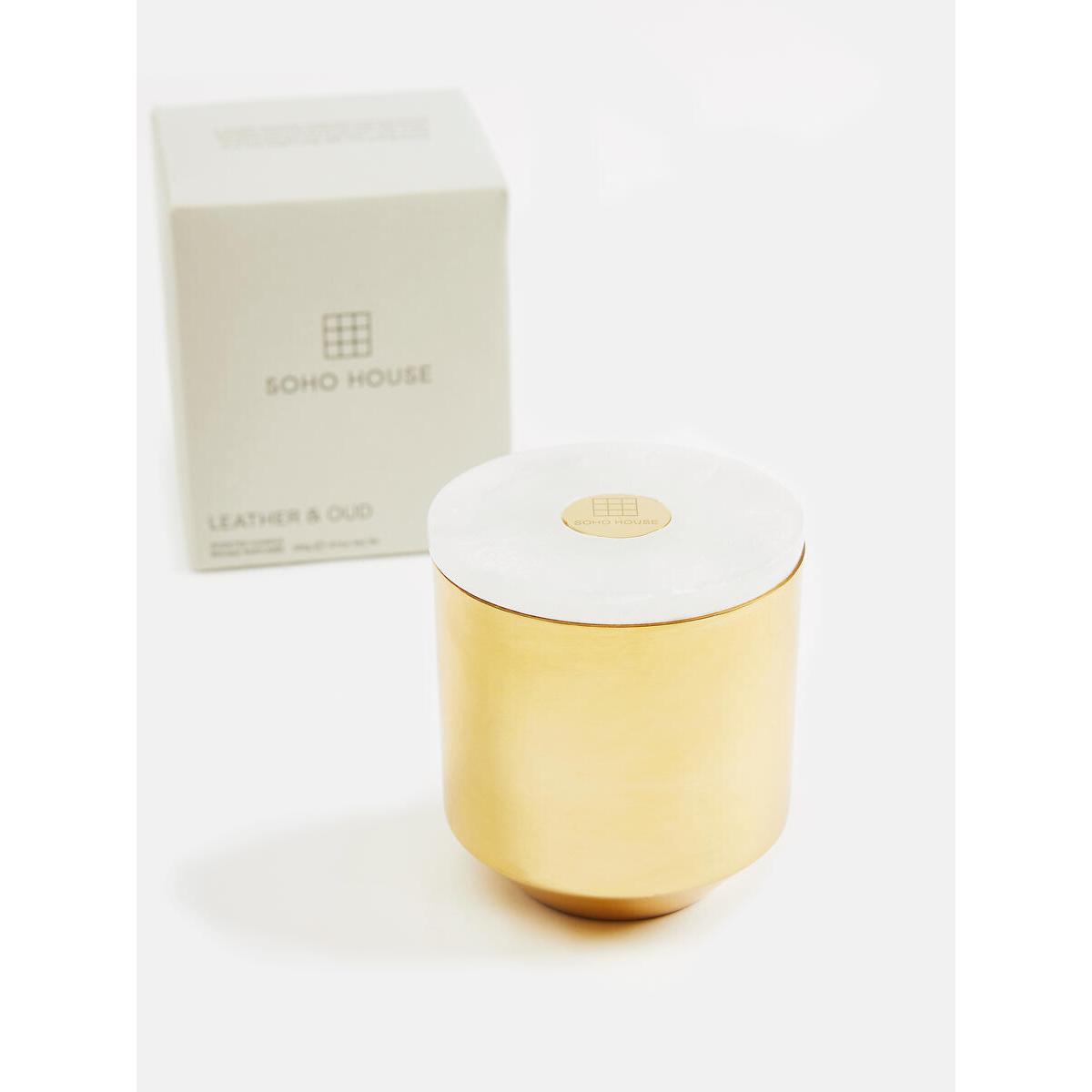 The Leather & Oud fragrance is reminiscent of nightcaps at Soho House Hong Kong, with the deeply aromatic scent of worn Leather and Oud to create a warming evening mood. Handcrafted by artisans in India, the scented wax is poured into a solid brass and alabastar vessel with gold lining to create a luminous glow when the candle is lit. The natural variations in the stone make each piece entirely unique. Scent notes Top: Oud Middle: Patchouli Base: Sandalwood Small candle with Leather & Oud fragrance Solid brass vessel with antique finish Alabastar lid with natural variations Vessel handcrafted in India Candle hand-poured in England Vegan-friendly blend of mineral and vegetable wax Vessel can be reused as storage once empty Inspired by Soho House Hong Kong