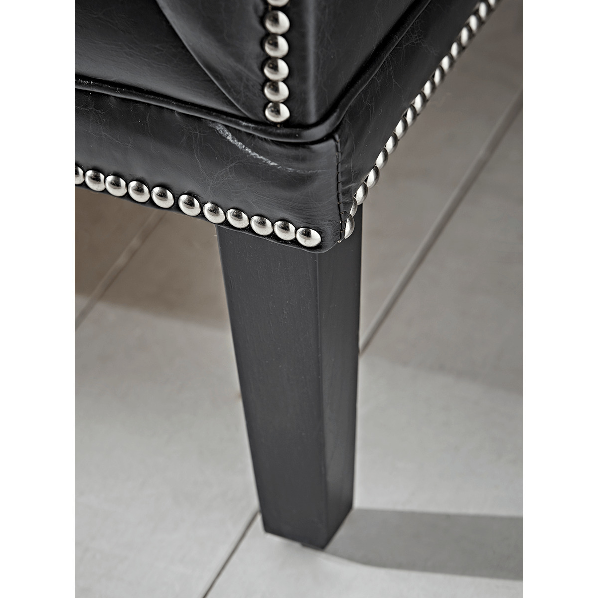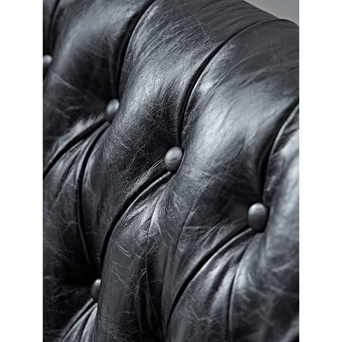 Our Leather Buttoned Sofa has a timeless design which would transit easily between a classic or a contemporary home. A fixed buttoned back and stately shaped arms set a luxe tone, whilst a slender frame and legs pare back beautifully. The traditional upholstery detail of a stud trim lines the full frame, here in contemporary chrome, which in contrast to the rich toned leather makes for a striking finish. Two sumputously filled cushions form the seat to this most generous and comfortable sofa, with all the qualities of a statement piece. See our Leather Buttoned Armchair for the companion armchair.