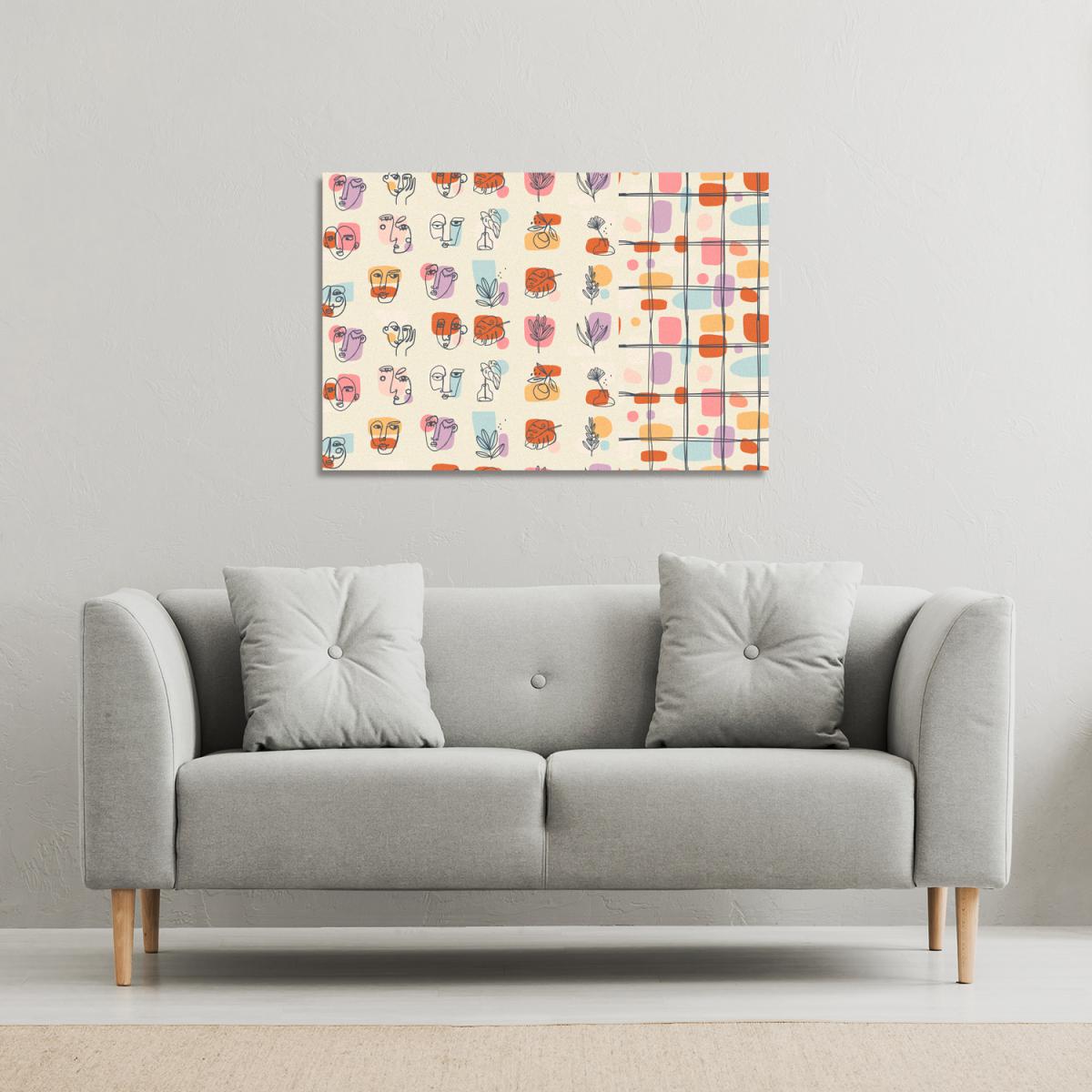 I love this abstract floral print for its bold use of orange and playful shapes - it injects vibrancy and energy into a space. It works particularly well in contemporary or modern interiors, adding colour to neutral schemes without overwhelming them. To style it effectively, consider pairing it with minimalist furnishings, keeping other accessories simple and understated. Position it above a sofa or sideboard to create a focal point, and if the space allows, incorporate complementary accents in similar warm tones or subtle pastels to create a cohesive look. Its sizeable dimensions make it ideal for larger walls, so it’s perfect for making a statement in living rooms or even open-plan spaces.