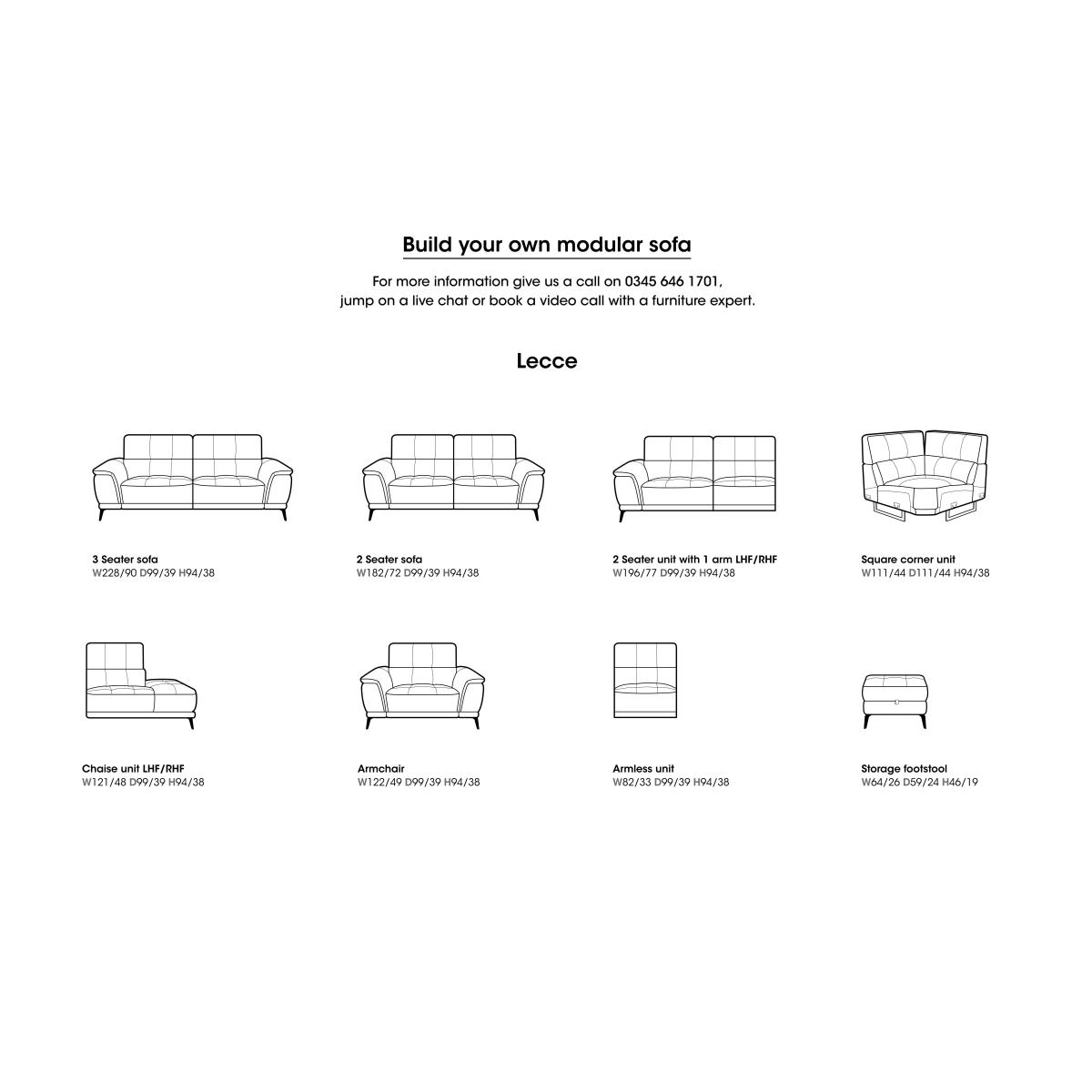End to end and inside and out, our Lecce power sofas and armchairs promise complete relaxation. And because they're handcrafted in Italy, they look fabulous too. Deep cushioning, modern buttoning and black nickel-finish legs all add up to a cool and confident vibe that suits both modern and contemporary homes. And with power recliners and perfect-positioning power headrests as standard, it’s so easy to get comfy – especially as the integrated USB charging means you can lounge for longer while browsing your socials or watching TV. Lecce range sofas and chairs are available in both 100% leather and soft fabric in a wide range of colours. A Furniture Village exclusive. This stylish leather storage footstool makes any living space more elegant. And you’ll love its versatility – along with providing extra storage space, it also makes a comfortable extra seat. Why you’ll love it Luxurious Italian lounging for discerning comfort-seekers. Storage footstool brings elegant style to your living room. And the hidden storage space is so useful. Minimal and modern decorative buttoning. Slender metal legs have a black nickel finish. Upholstered in 100% leather in a choice of colours. Beautifully handcrafted in Italy and exclusively available at Furniture Village. The Lecce range is modular. This leather storage footstool is part of our Lecce range. What you need to know Cushioning: foam. Leather has unique marks and characteristics with variation in colour and texture. Leather softens with use. Smoothing the tops of leather cushions prevents signs of visual comfort. Please read our upholstery care guide for more advice. for more advice.