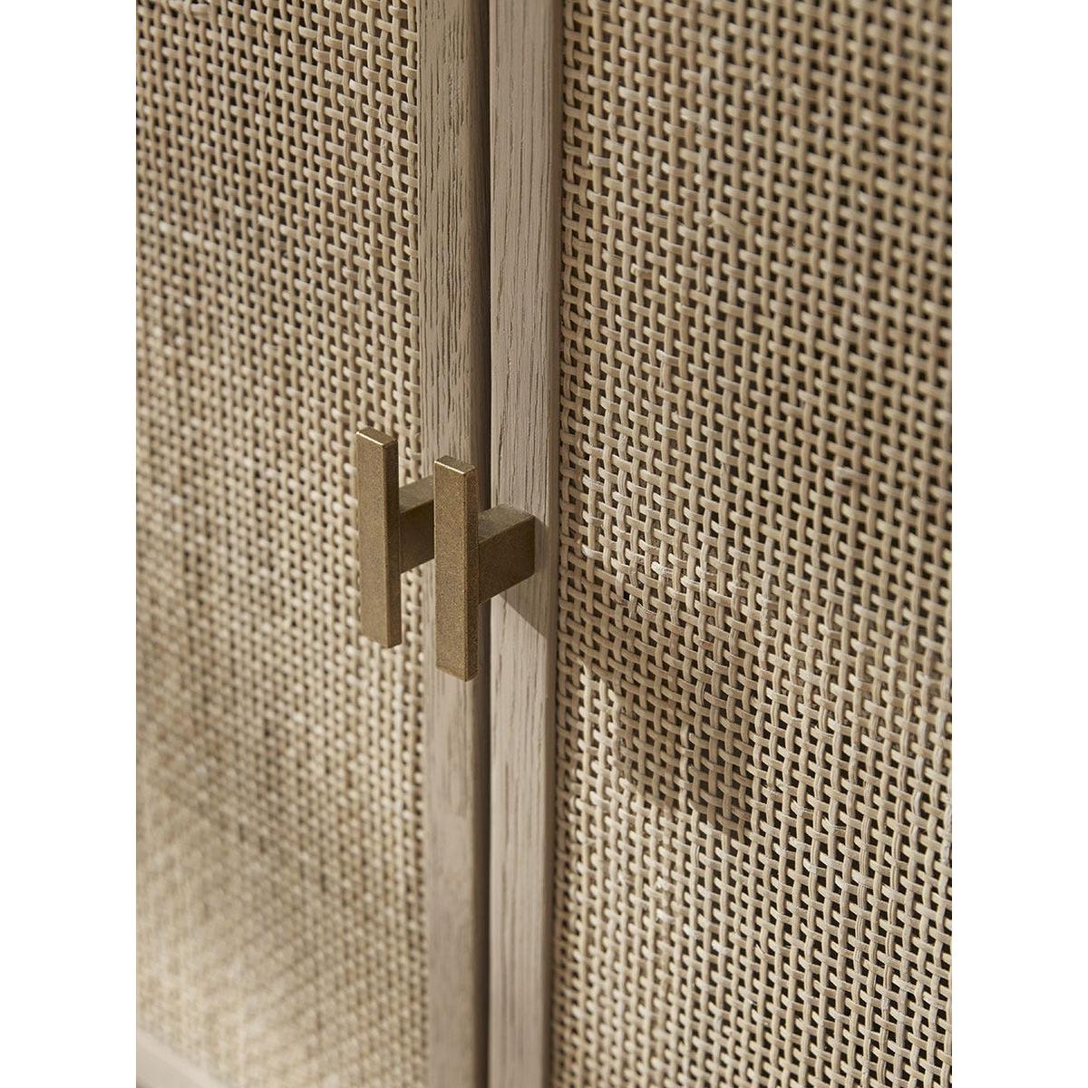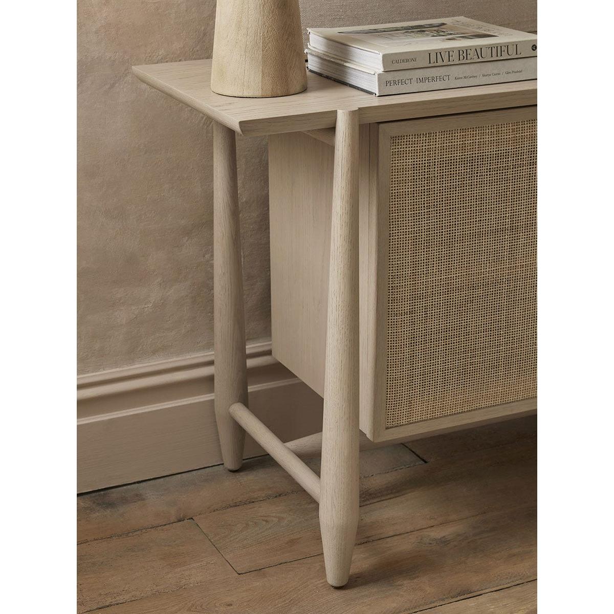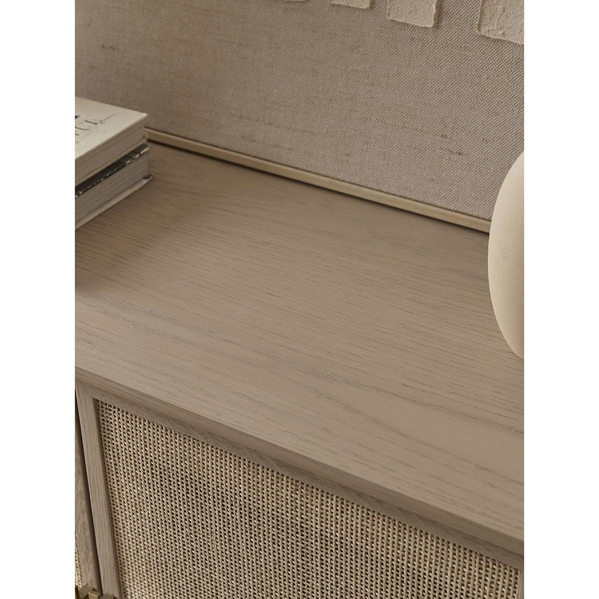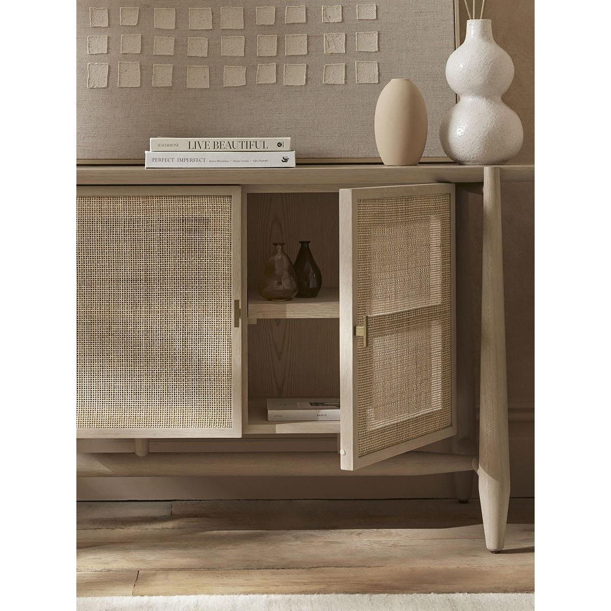 Crafted from a blonde oak, cylindrical tapered legs support a table top which holds a cupbaord with rattan fronted doors that communicate a natural and warming feel. Finished with gold toned handles that add an elevated look, our Lecce Sideboard has an internal shelf ideal for storing items and keeping clutter at bay, whilst blending seamlessly into a minimalist interior.