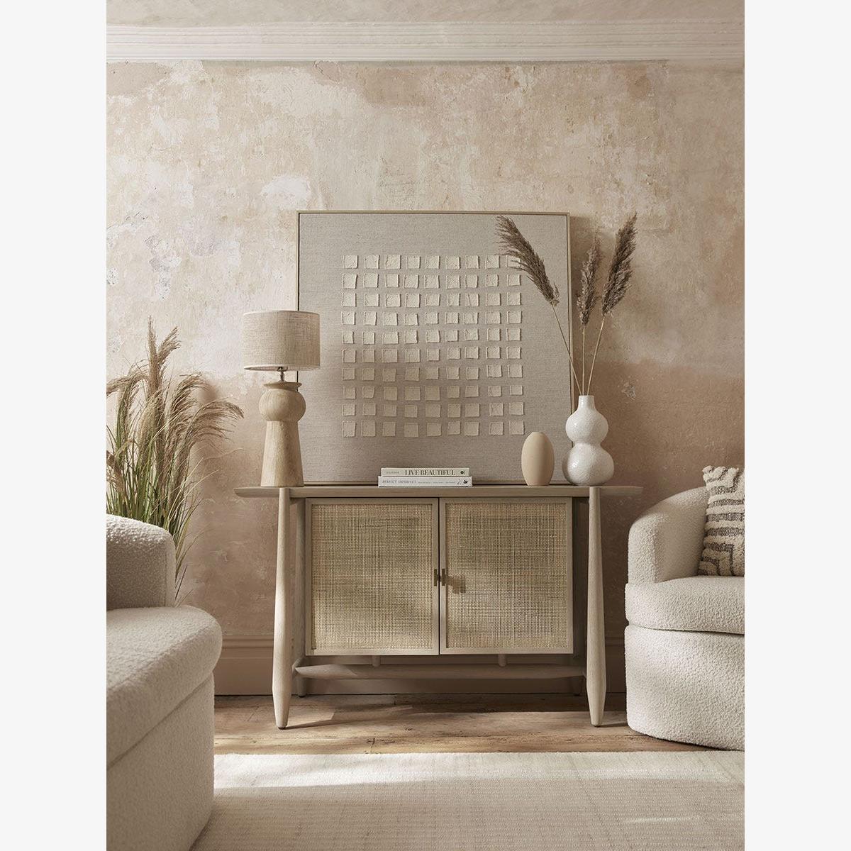 I’m a fan of the Lecce sideboard for its clean lines and mixed-material appeal - the rattan-effect fronts add texture without overwhelming a room. It works equally well in a pared-back Scandi living space or a relaxed coastal scheme, bringing in warmth through its muted timber finish. For styling, I’d keep the top relatively uncluttered: a sculptural lamp at one end, a small stack of art books and a couple of ceramic vases or a low greenery arrangement at the other. Behind its doors you get discreet storage for everything from remotes to table linens, so you can maintain a neat, lived-in look.