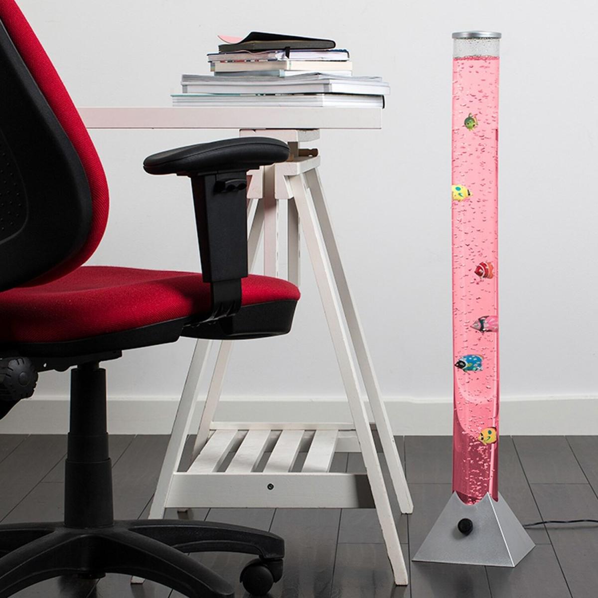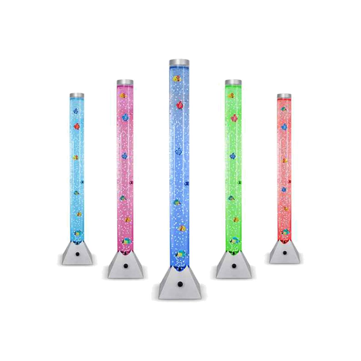 Novelty 90cm bubble lamp with silver base. The colour changing LED lights illuminate and send a steady stream of bubbles up the tube, which in turn creates oscillation and the fish appear to 'swim' up and down. Makes a great feature in homes, schools, sensory rooms and workplaces. This lamp can easily be the centre of attention or just part of the background, as it creates wonderful mood lighting in whichever room you place it. It is important that this product is placed on a level surface and where it will not be knocked over. To keep the lamp clean, use mild soap and water do not use any abrasives. Only clean with distilled water should be used for cleaning as other types will affect the function of the product and may cause algae growth. 6 plastic multi-coloured artificial fish are supplied.