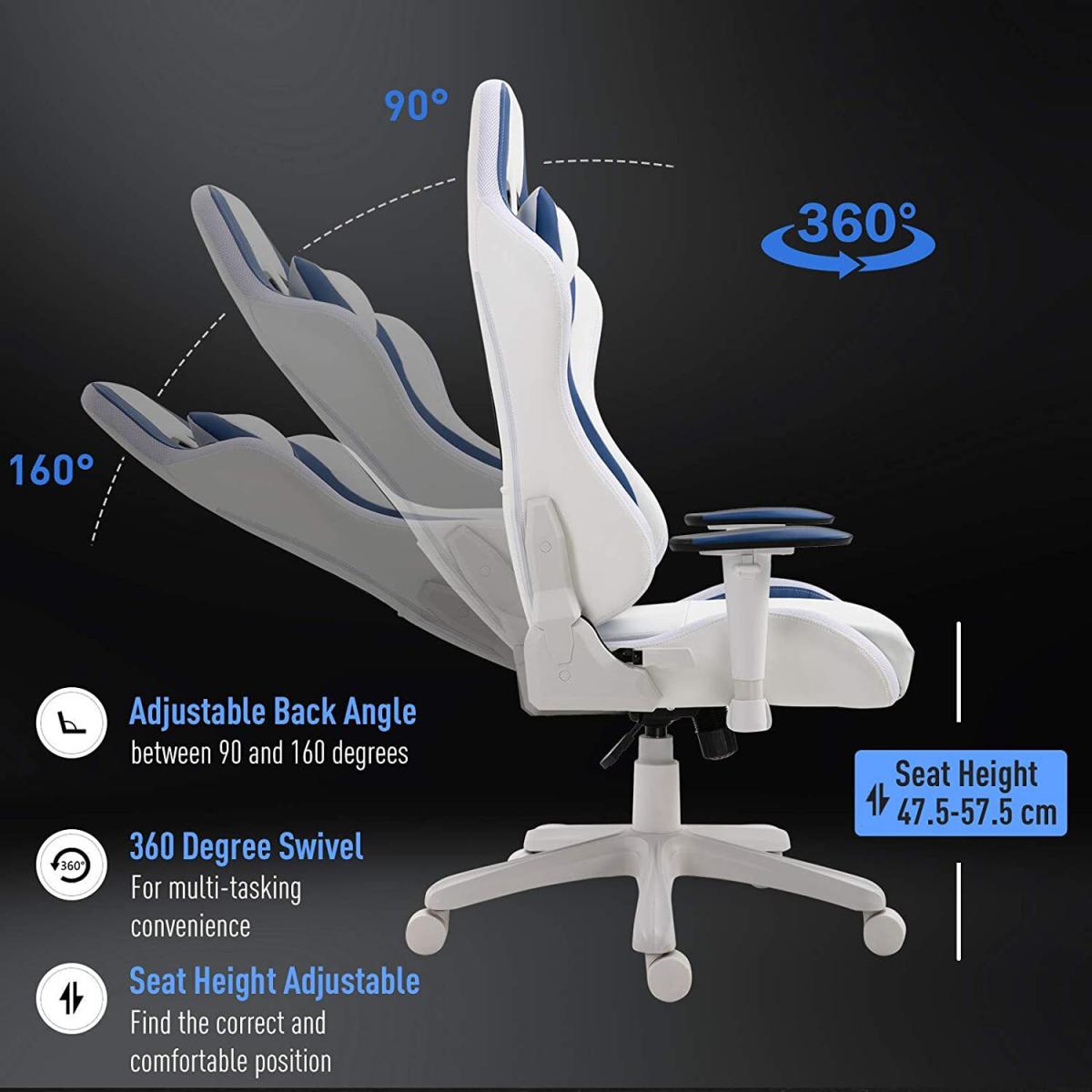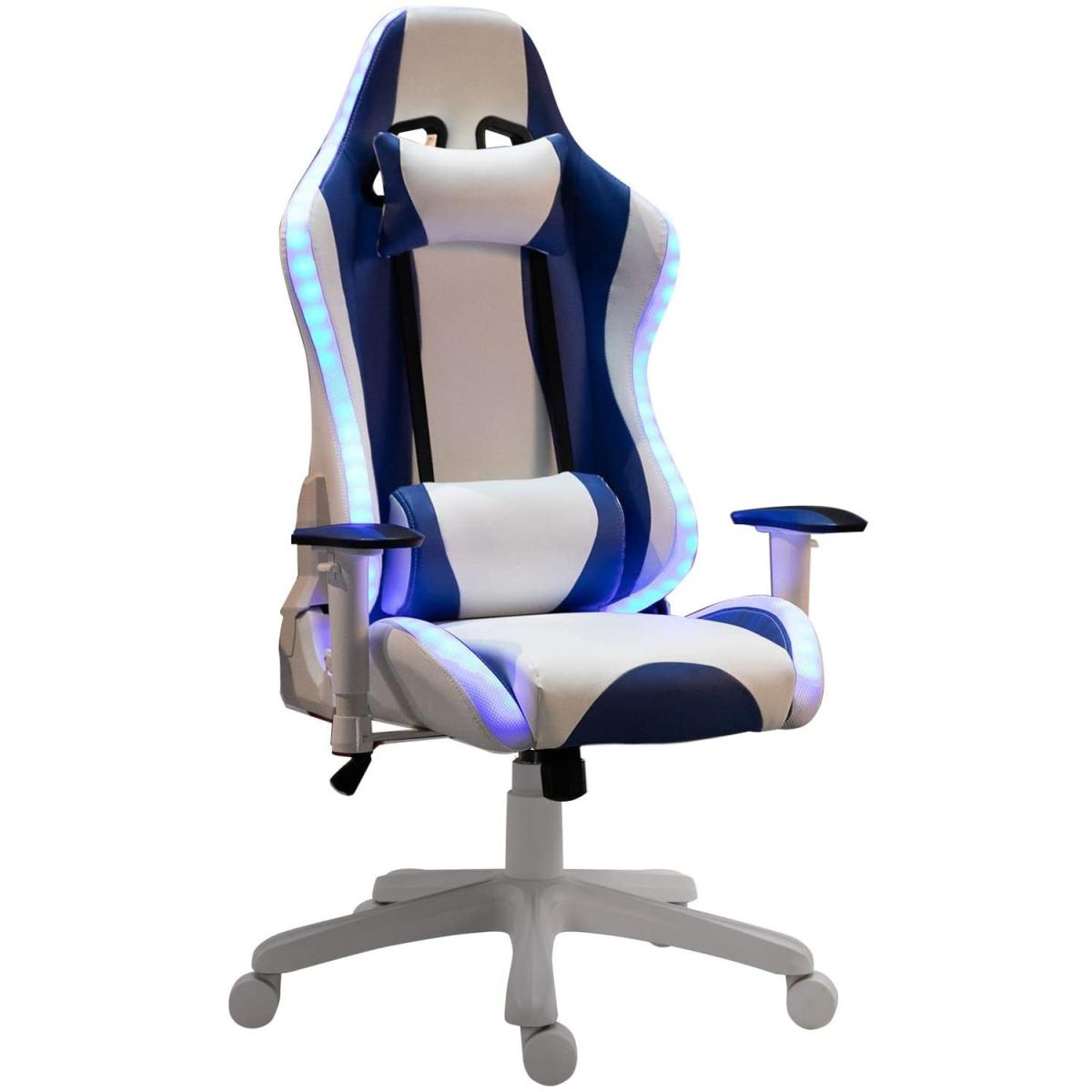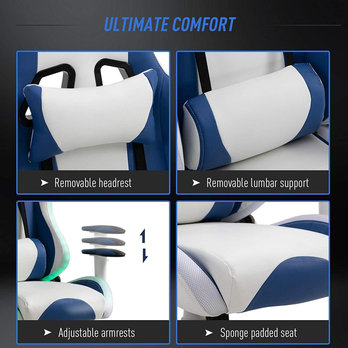 Take your gaming experience to the next level with this light-up chair from Vinsetto. Ergonomic features include adjustable height, a 160 reclining back, adjustable armrests and thick cushion padding all over, ensuring you'll be sitting comfortably for long periods. PU leather upholstery is smooth to the touch and easy to clean, with a removable head and back cushion for extra support. The LED lights on the edges blend into seven different colours for a fun experience. It is finished with five castor wheels so you can move around easily when seated.