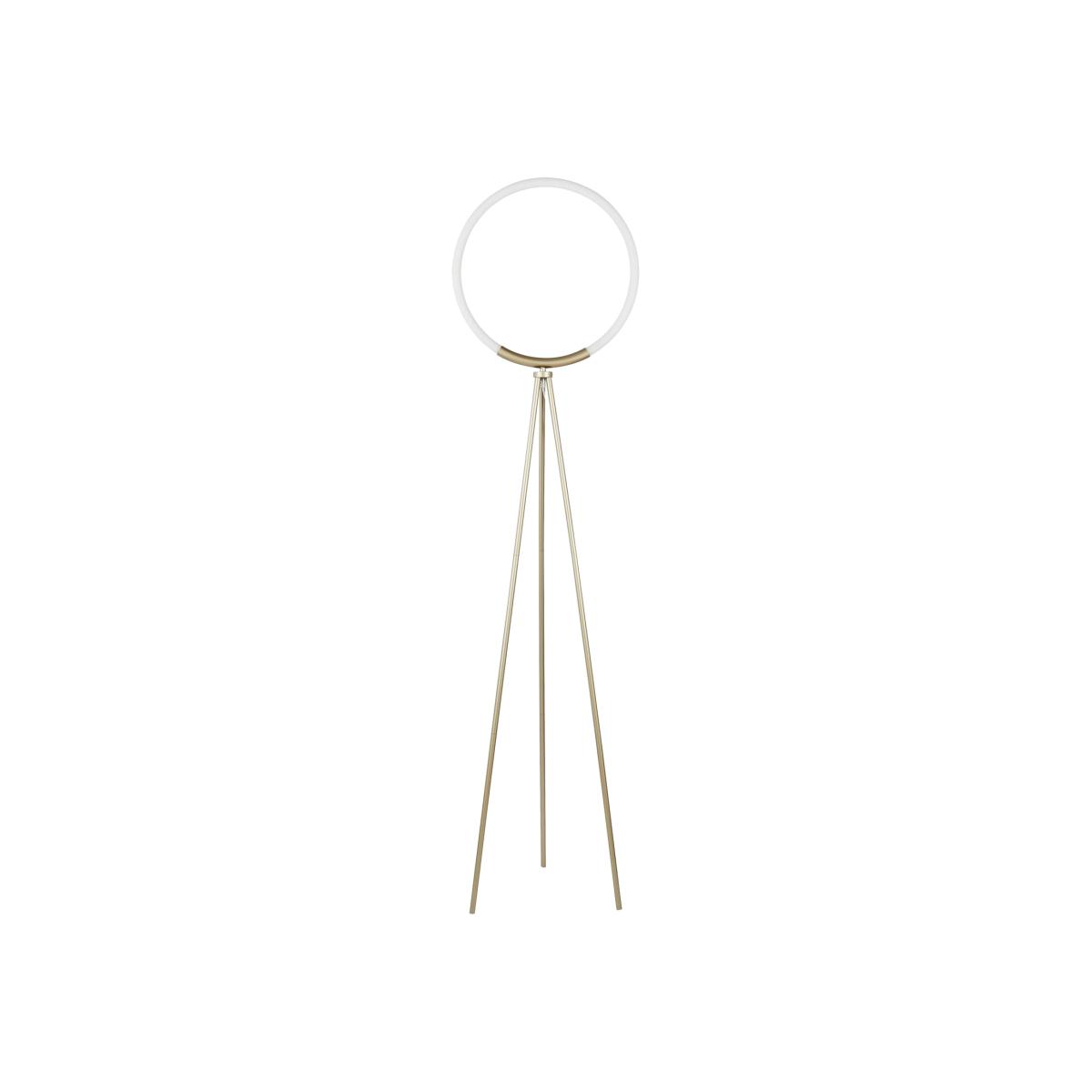 This minimalist, Modern floor lamp will be a stylish addition to any living area. With a frosted Led Hoop sitting on Top of a Matt Gold Tripod,