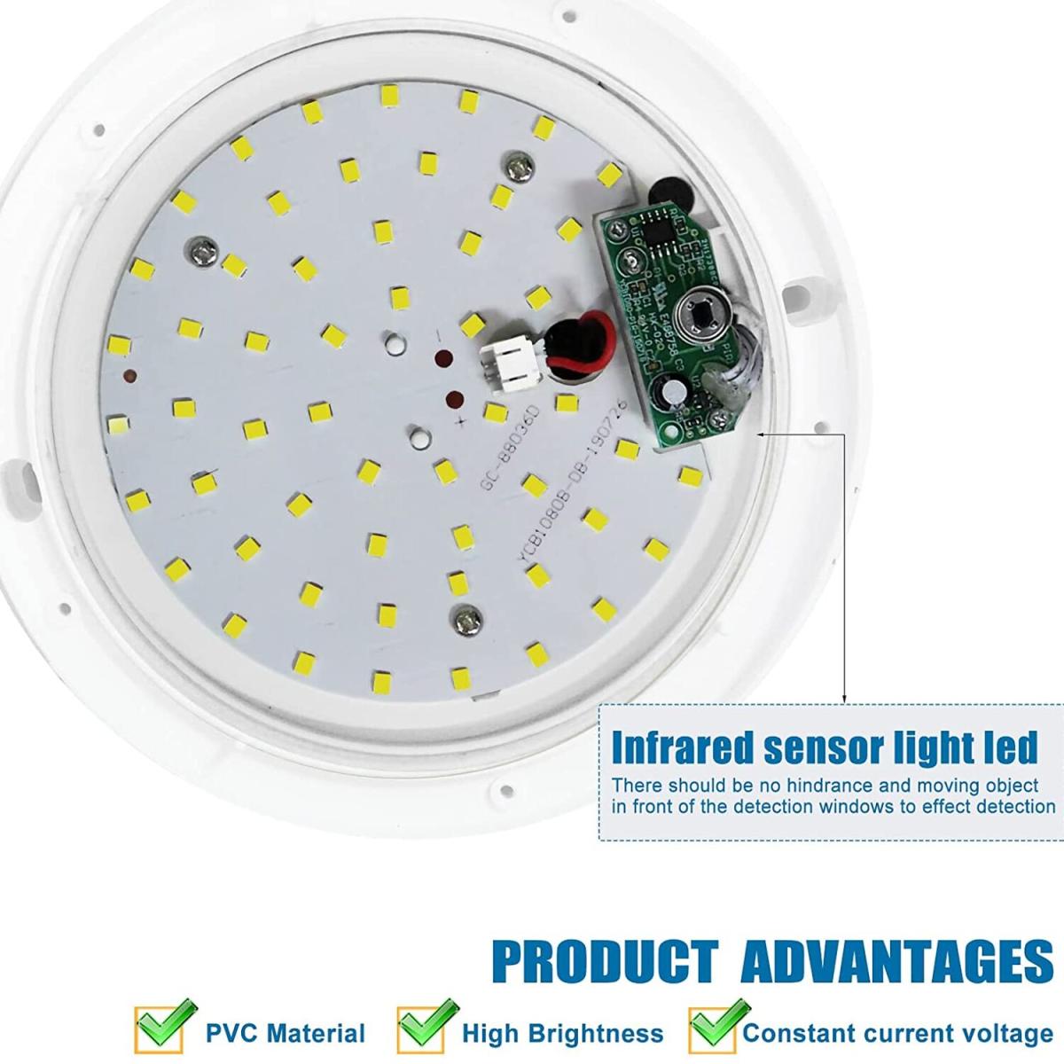 Our LED ceiling light adopts an advanced PIR infrared motion detector in a dusk to dawn sensor, IC and SMD technology, which can instantly turn on when it detects motion up to 8. M (26ft) away. Automatically turns off with a 30-second delay after a period of inactivity. 15W LED ceiling light is equivalent to the traditional 120W incandescent bulb, and the extremely long service life can reach up to 25,000 hours which helps you to effectively save more on electric costs. This LED Panel Ceiling lamp adopts high-quality 2835 led SMD chips, which provide with 1200 Lm brilliant cold light, much brighter than most other ceiling lights of this size. Made of PVC and Acrylic board, it's durable and reliable for long-term use.