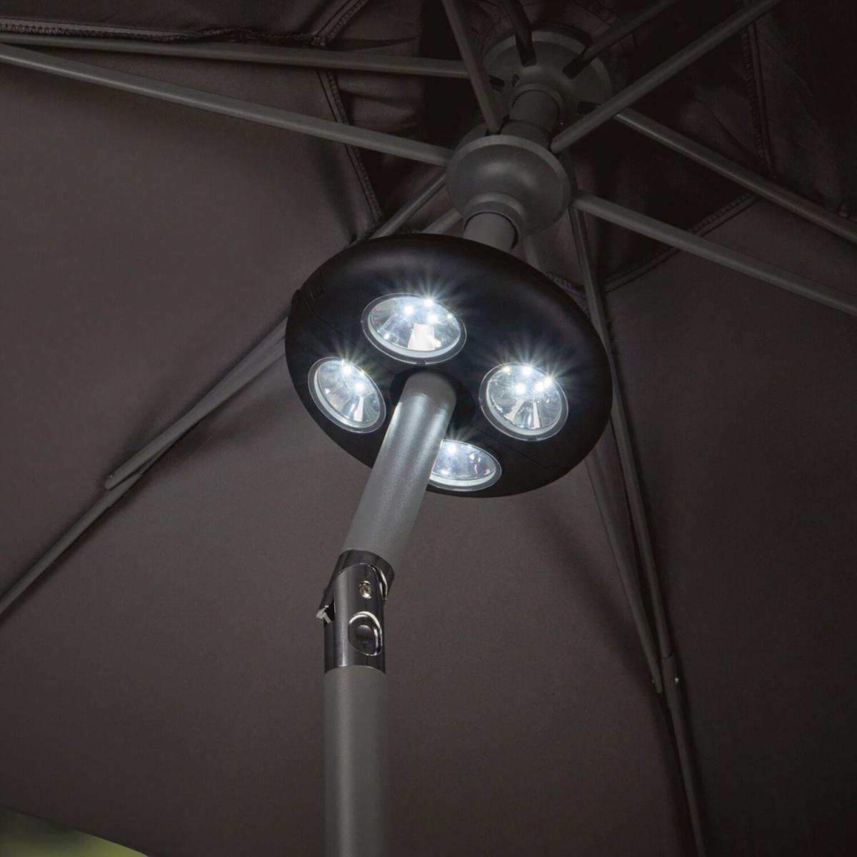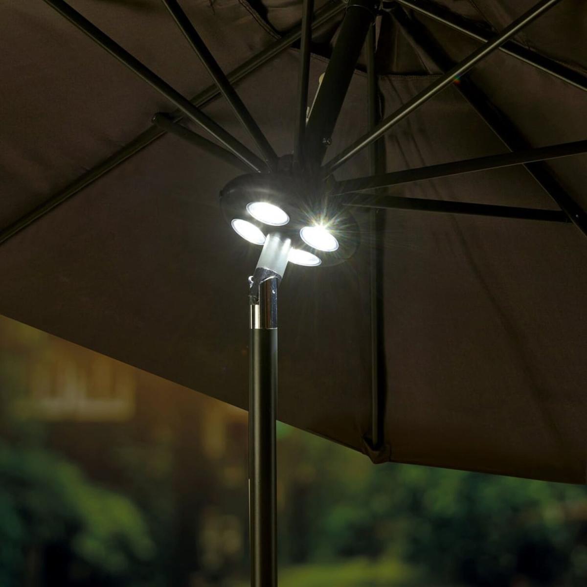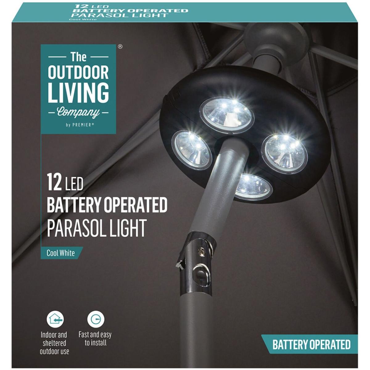 Premier battery operated parasol light cool white. Add a touch of elegance whilst creating a warm and welcoming feel to your favorite garden spot with this cool white battery operated parasol light. Designed indoor and sheltered outdoor use, this decorative universal light can grip the parasol pole or be hung directly underneath the parasol canopy from the frame. It is suitable for 30-45cm parasol poles and is easily fitted with its easy push button opening feature. The light features 12 cool white LEDS, and require 4 x AA batteries to power. (Not included). Overall, the light measures approximately 20cm in diameter and 4.5cm in height. This parasol light is the perfect solution for creating the perfect ambience for any occasion, from a romantic meal for you and your partner, a family BBQ or a garden party with all your friends. A simple set of lights for everyone to enjoy.