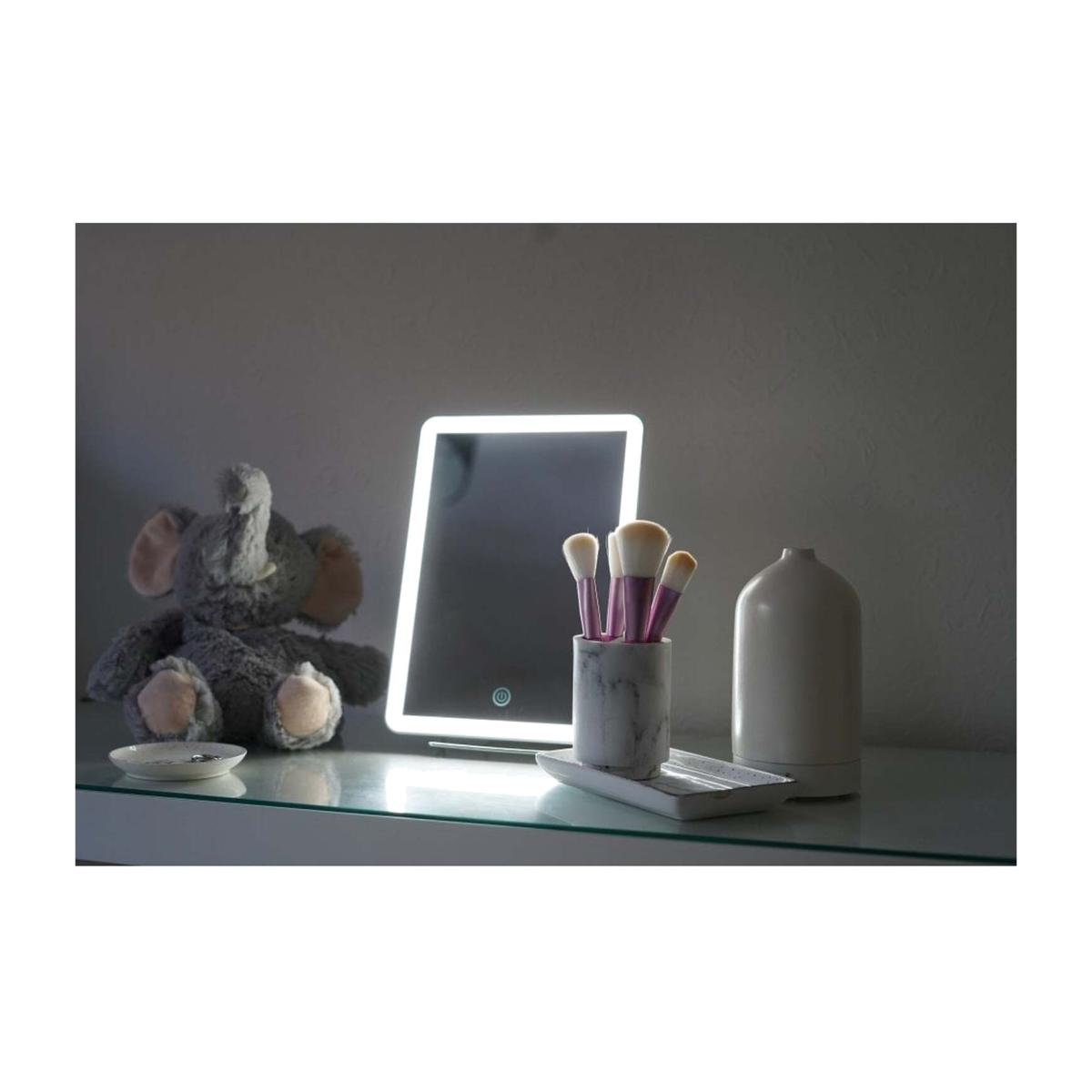 This unique L.E.D. Tablet Mirror offers strip lighting with several brightness settings, to ensure your makeup is applied flawlessly. With its easel frame and handy smartphone holder at the bottom, you can follow along with your favourite tutorials. The mirror also offers a zero distrain 1x magnification setting, to ensure your make-up is on point! Battery or USB powered - USB included (batteries not included).