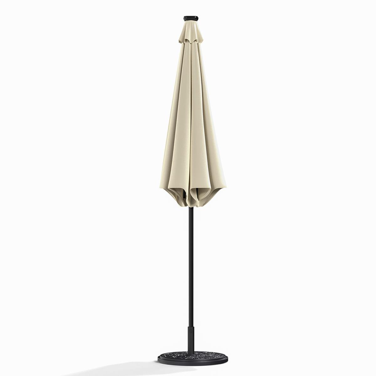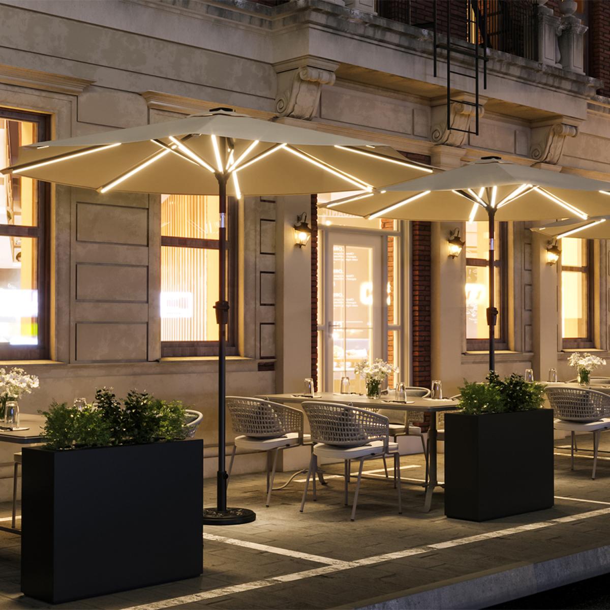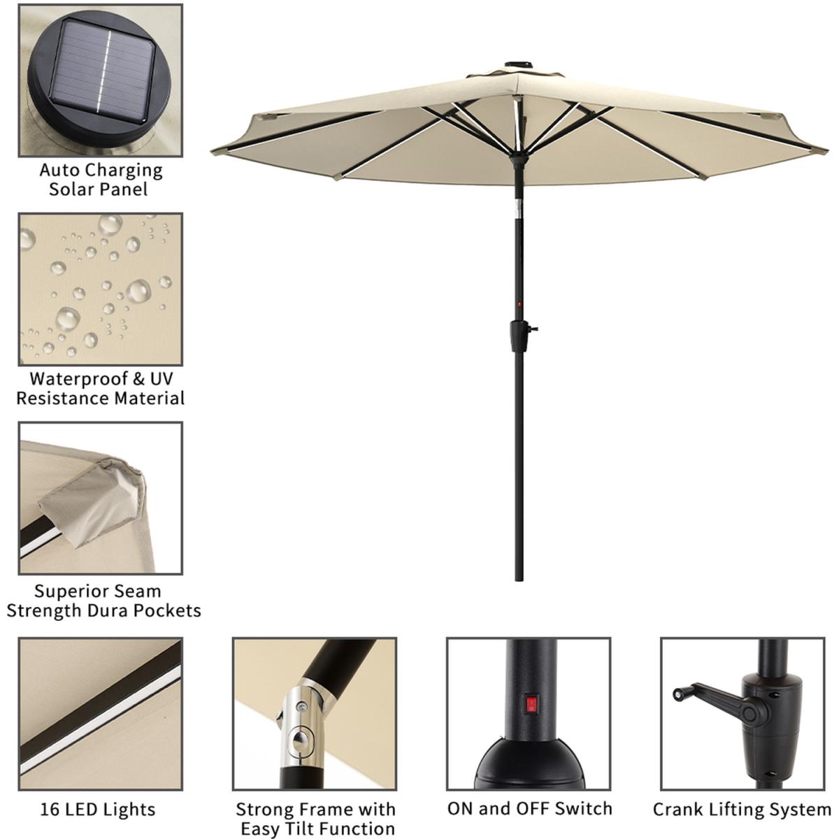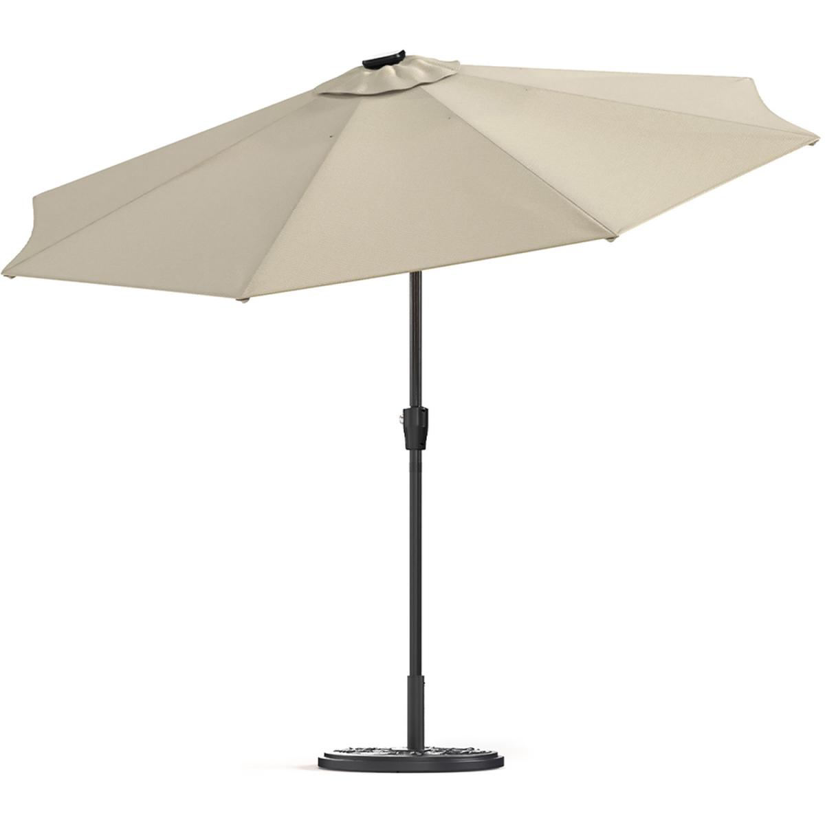 The Patio Parasol with LED Strips uses a hand crank to easily open its canopy to keep your guests and family cool and protected from the sun's harsh UV rays, or your table illuminated after dusk. This attractive umbrella features LED strips powered by a solar panel that recharges the included battery pack. It complements any outdoor setting in an elegant fashion with its lovely warm earth-tone and clean lines.