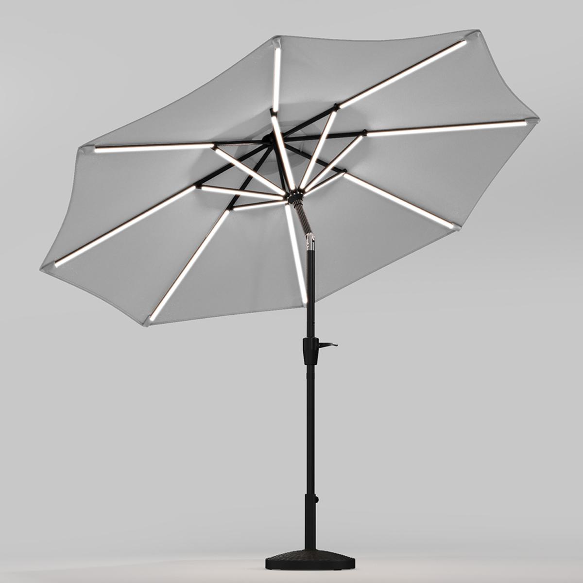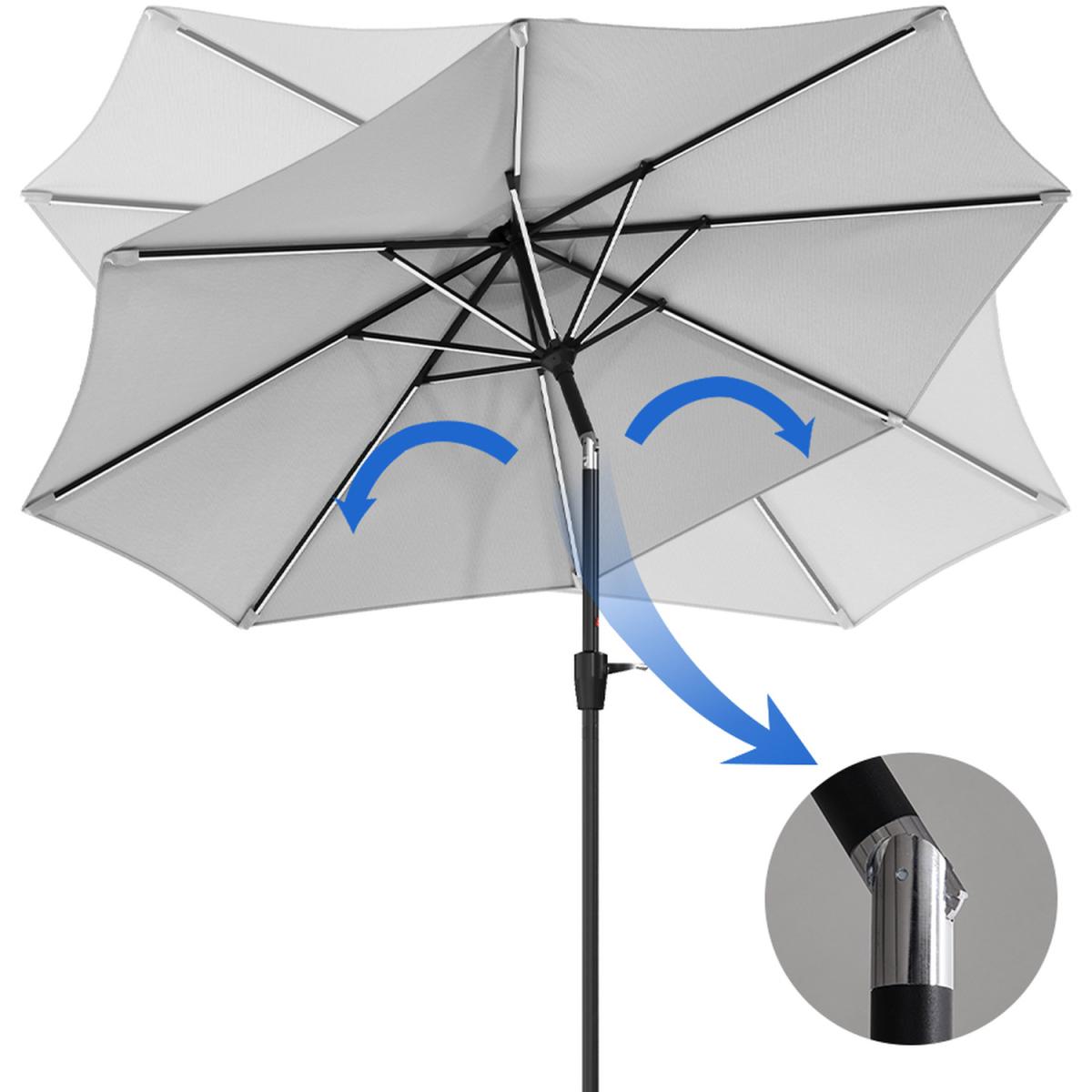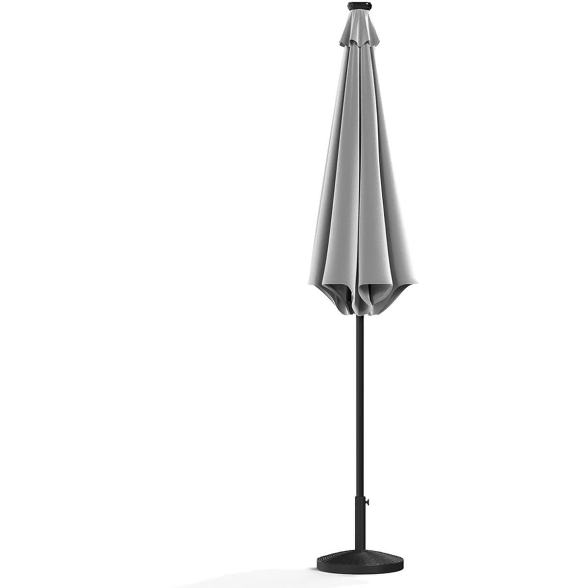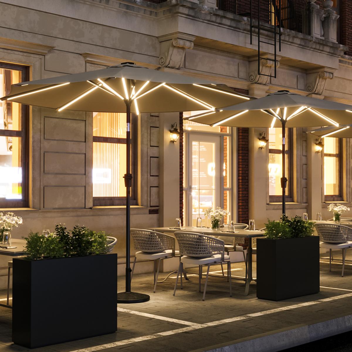 The Patio Parasol with LED Strips uses a hand crank to easily open its canopy to keep your guests and family cool and protected from the sun's harsh UV rays, or your table illuminated after dusk. This attractive umbrella features LED strips powered by a solar panel that recharges the included battery pack. It complements any outdoor setting in an elegant fashion with its lovely warm earth-tone and clean lines.