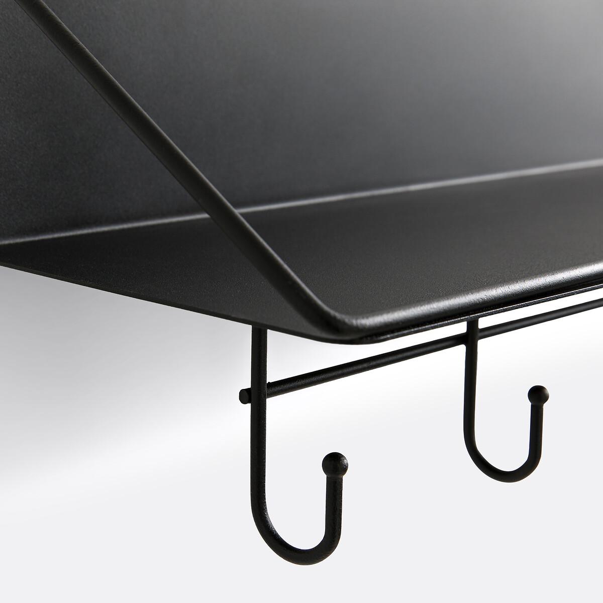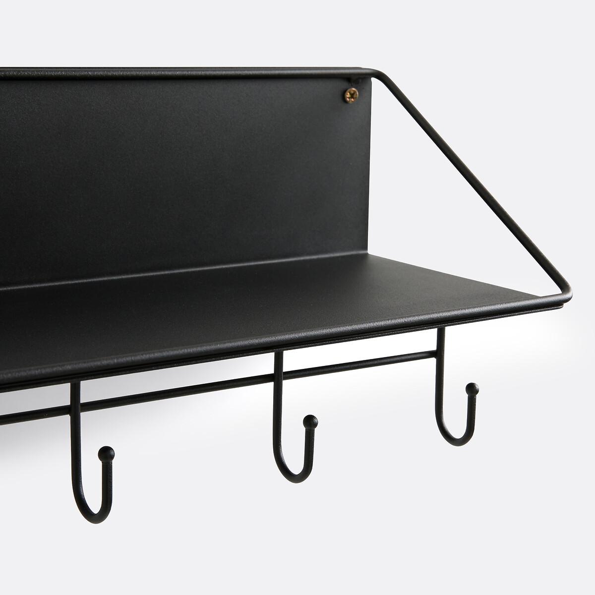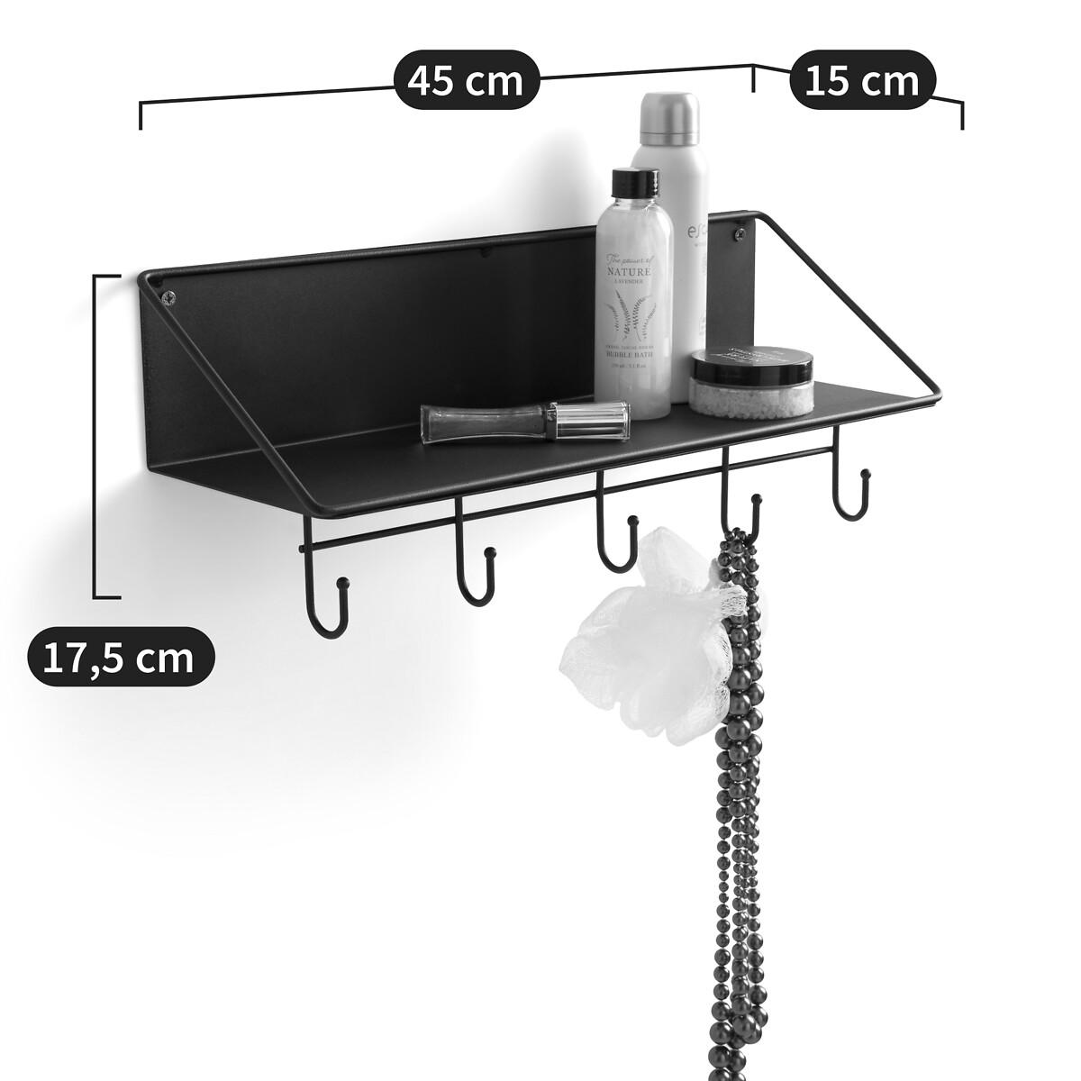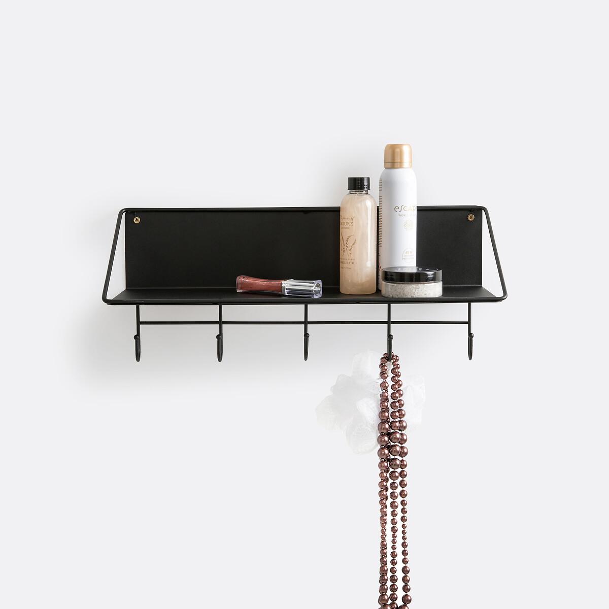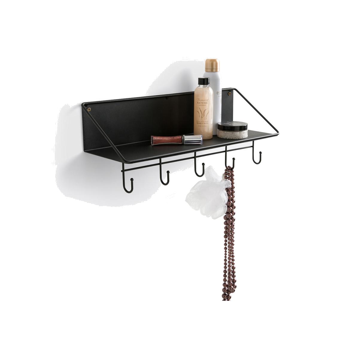 The Leddy metal wall shelf with 5 hooks is ideal for for hanging bags, jewellery, towels, utensils, etc... A simple and practical shelf to place in any room of the house. Product Details • In black tinted steel, epoxy finish • 5 thin hooksDimensions. Total: • Width: 45cm • Height: 17.5cm • Depth: 15cm. Usable dimensions: • Weight: 1.18kgDelivery:. Sold pre-assembled. Available for home delivery. Dimensions and weight of parcel1 parcel • L49.8 x H19.5 x D20.2cm. 1.58kg