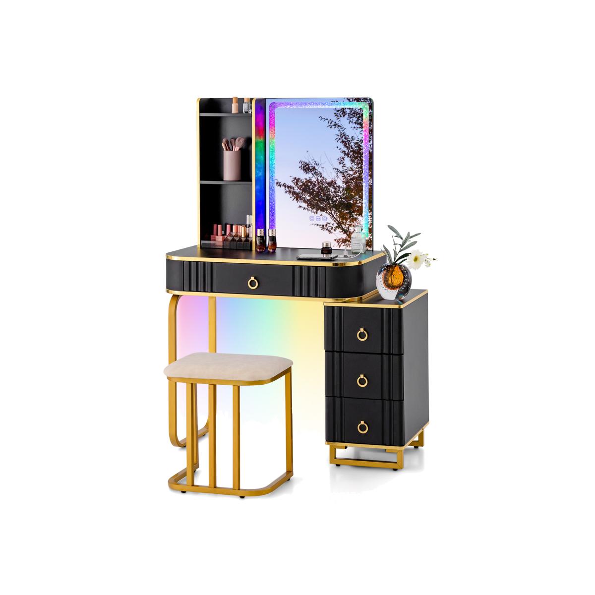 This modern vanity set with LED lights will be a fashionable addition to your bedroom! The vanity desk comes with an LED lighted mirror, a side storage cabinet and a comfortable cushioned stool. The twinkling diamond mirror edge plus RGB LED lights make the dressing table look gorgeous. And you can change the light colour, brightness and speed easily via the touch switches and the remote control.