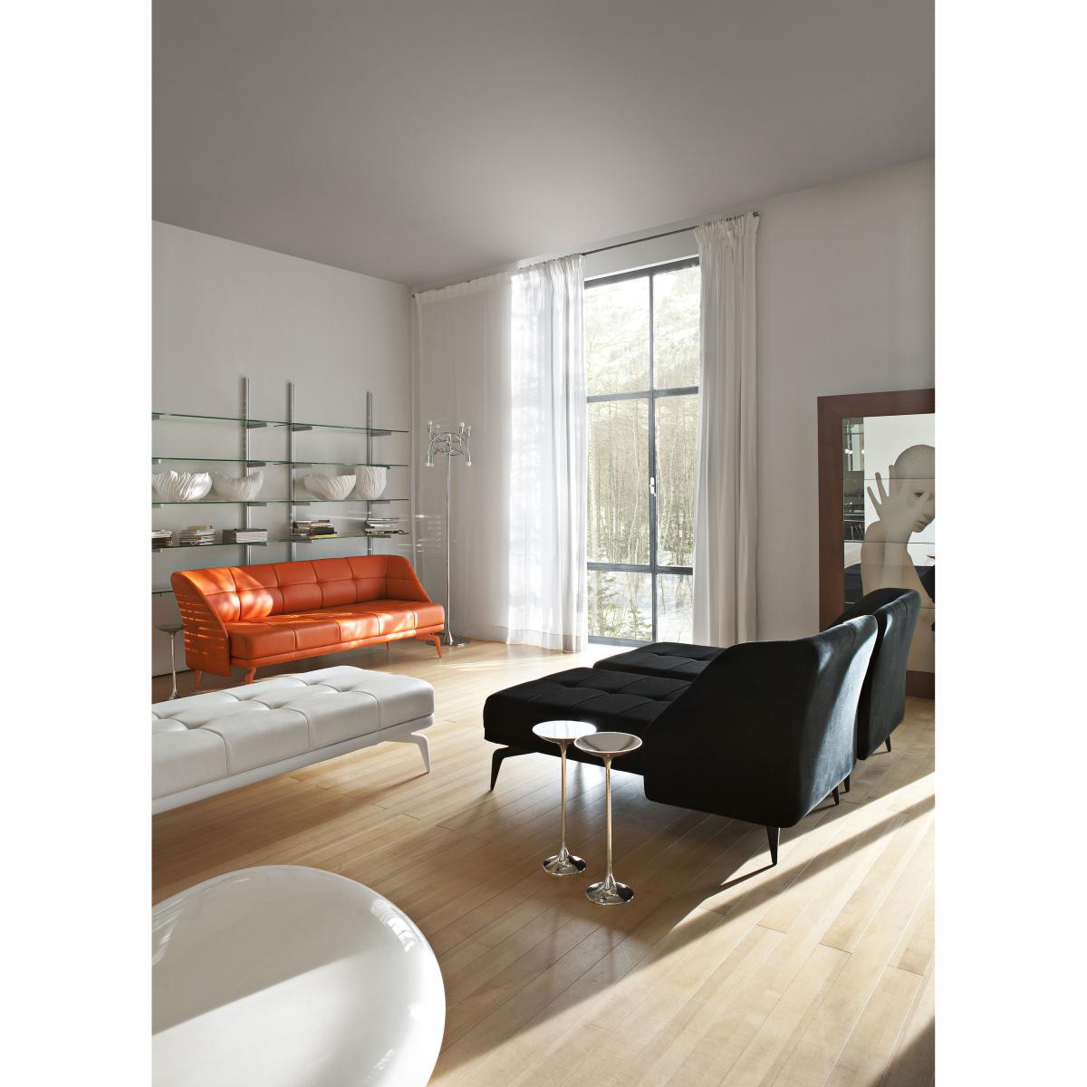 Left or right daybed. Wooden and fibreglass structure with painted aluminium feet and velvet or leather fixed cover.