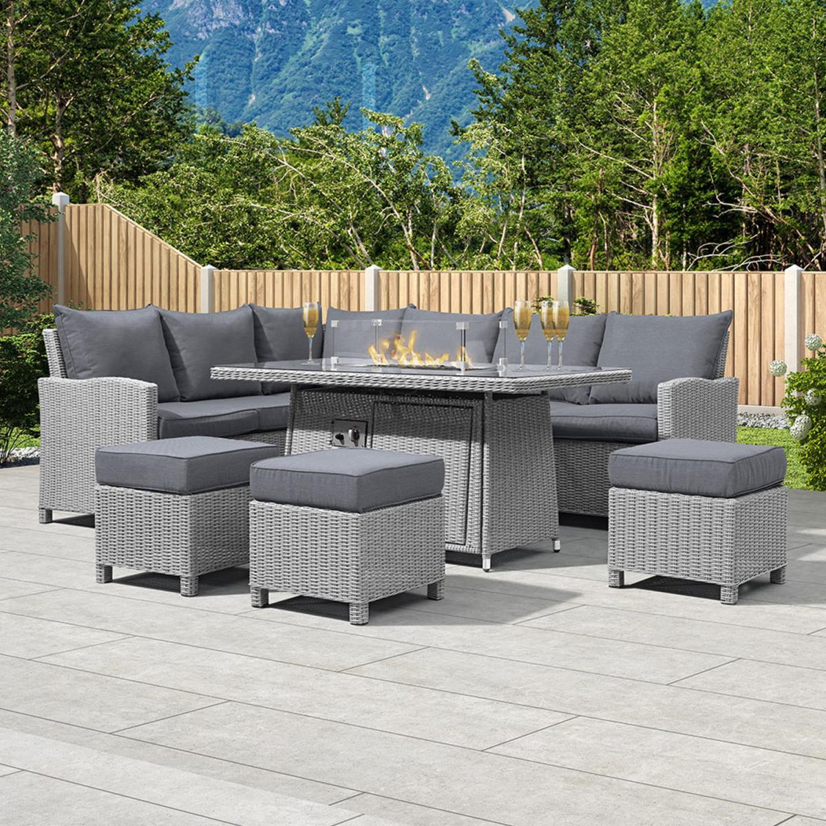 The Nova - Left Hand Ciara Firepit Corner Dining Set - White Wash is the ideal choice for those who want to enjoy their garden all year round. This furniture is ideal for entertaining all year round. This is because the stunning Heritage rattan dining table includes a firepit in the centre of the table. This firepit gives off both heat and light, allowing you to warm your guests and extend your party well into the evening as well as use your garden all year round. This set also comes with a spacious left-handed corner sofa group, as well as 3 padded footstools which can be used to put your feet up or double up as extra seating. The furniture is crafted using rustproof powder coated aluminium frames as well as a 7mm PE synthetic rattan weave which is fully weather proof and can be left outside all year round, enduring temperatures of +40°C and -20°C. This set comes with padded cushions throughout which help to improve the comfort of the furniture. Whilst these cushions are not fully weatherproof, they will survive a light shower and can be cleaned easily should spills occur. We do, however, recommend storing the cushions indoors when not in use. Set Includes: 1 x 3 Seater Left Hand Sofa Piece 1 x 2 Seater Right Hand Sofa Piece 3 x Padded Footstools 1 x Firepit Casual Dining Table Key Features: Padded Cushions Throughout Tempered Safety Glass Powder Coated Aluminium Frames 100% Weatherproof PE Rattan.