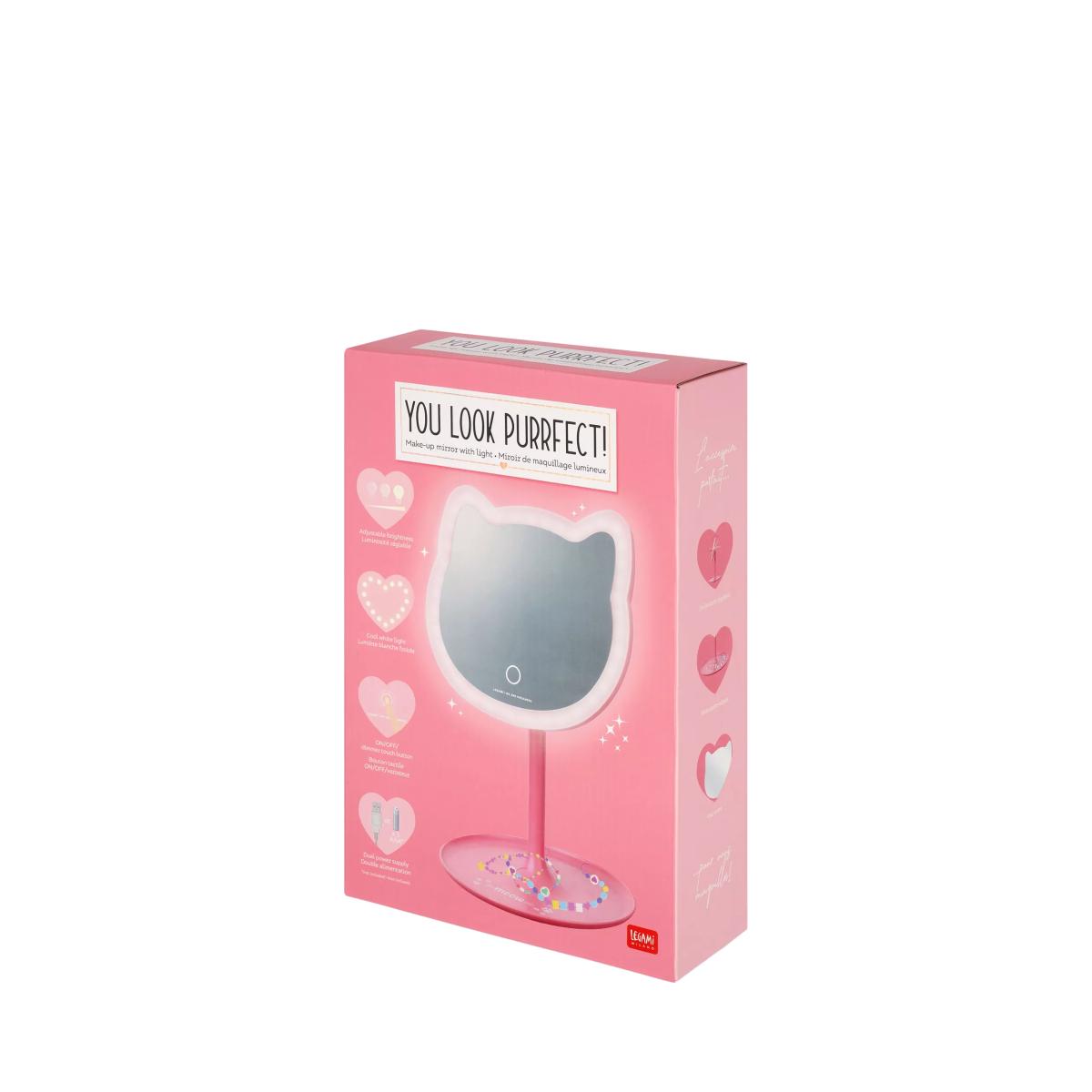 Look at yourself like you'd look at a kitten wanting a cuddle! Embrace your kittenish charms with the Make-up Mirror with Light - You Look Purrfect! from Legami. Illuminate your features with the light, place your jewellery and make-up on the handy tray at the base and get ready to purr! Dual power supply: 3 x AAA batteries (not included) and USB cable (included). ON/OFF/dimmer touch button.