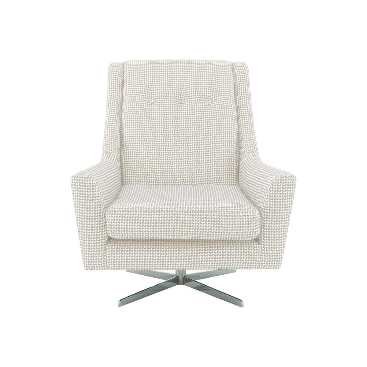 Fresh modern style, legendary comfort – that’s the Legend collection. The sofas, chairs and footstools have soft modern lines and polished chrome legs, and are upholstered in family friendly flat weave fabric in a choice of beautiful neutrals and bolds. Choose relaxed pillow backs or clean lined classic backs, then complete the look with some reversible accent scatters in a choice of vibrant contemporary patterns, available to buy separately. The legendary comfort comes from the sprung seats and backs with foam flex and supersoft foam topper seat cushions and luxury blown fibre back cushions. Made exclusively for Furniture Village. The Legend fabric designer swivel armchair has a high back, elegant silhouette and chic button detailing. High end contemporary style in a choice of fabric upholstery. Why you’ll love it. Chic, contemporary designer style. High back, finished with three buttons. Low, curved arms. Polished chrome, star shaped swivel base. Soft yet durable, flat weave upholstery. In a choice of colours and accent patterns. A Furniture Village exclusive. What you need to know. Medium comfort level. Sprung seat and back. Deep FoamFlex™ seat cushion with super soft foam topper. Luxury blown fibre back cushion. The upholstery is soft to the touch yet hardwearing. Finished with neatly tailored piping for durability. Hardwood and composite board frame. Polished chrome finish metal base. Some fabrics can show wear on areas of more use or in direct sunlight. Please read our. Upholstery care guide. For more advice. Part of the contemporary Legend range.