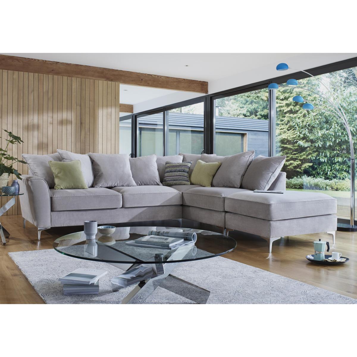 Fresh modern style, legendary comfort – that’s the Legend collection. The sofas, chairs and footstools have soft modern lines and polished chrome legs, and are upholstered in family friendly flat weave fabric in a choice of beautiful neutrals and bolds. Choose relaxed pillow backs or clean lined classic backs, then complete the look with some reversible accent scatters in a choice of vibrant contemporary patterns, available to buy separately. The legendary comfort comes from the sprung seats and backs with foam flex and supersoft foam topper seat cushions and luxury blown fibre back cushions. Made exclusively for Furniture Village. The spacious Legend pillow back corner sofa comes with a versatile large square footstool, which you can use as a chaise end. Relax in contemporary luxury. Why you’ll love it. Fresh up to date pillow back style with indulgent comfort. Contemporary, polished chrome legs. Curved arms. The large footstool also serves as chaise end. Family-friendly fabric upholstery in neutral and bolder shades. Colourful accent cushions, available separately. Nine large, luxurious blown fibre pillow back cushions. Deep FoamFlex™ seat cushions with super soft foam toppers. A Furniture Village exclusive. What you need to know. Medium comfort level. Sprung seat and back. The flat weave fabric upholstery is soft to the touch yet hardwearing. Finished with neatly tailored piping for durability. Reversible scatter cushions, in a choice of vibrant accent patterns, available to buy separately. Hardwood and composite board frame, shaped chrome finish legs. Some fabrics can show wear on areas of more use or in direct sunlight. Plump, turn and rotate seat and back cushions regularly if possible. Please read our. Upholstery care guide. For more advice. Part of the contemporary Legend range.