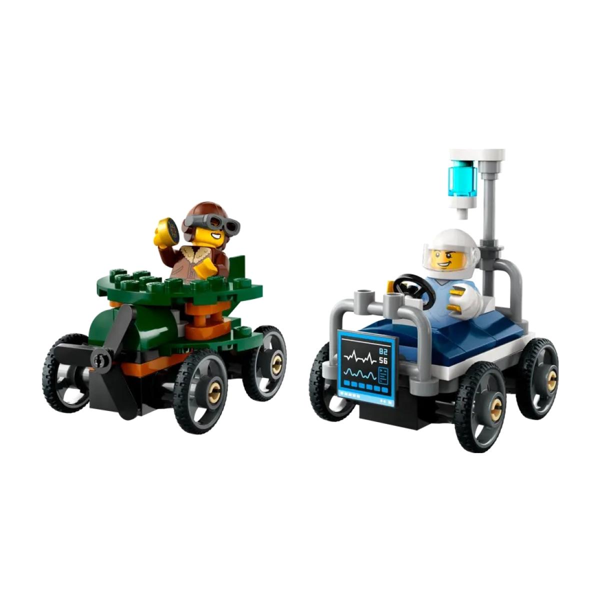 Get ready for a race like no other with the LEGO® City Airplane vs. Hospital Bed Race Car Pack (60459) – a delightfully quirky set for kids aged 5 and up! This hilarious soapbox showdown features two creative race cars: a high-flying aeroplane and a hospital bed on wheels. With a determined pilot and a speedy patient at the helm, it’s anyone’s guess who’ll win the wildest race in town! The set includes two fun minifigures and step-by-step printed building instructions, plus access to the LEGO Builder app for an interactive experience. Kids can zoom in, rotate models in 3. D, and track their progress as they build. Part of the LEGO City range, this imaginative race car pack can be combined with other sets (sold separately) for even bigger adventures and laugh-out-loud racing fun. 70 Pieces Suitable for age 5+ Dimensions: LEGO® City toys for play and display – The airplane soapbox racing car toy in this 70-piece playset measures over 1 in. (3 cm) high, 2.5 in. (6 cm) long and 1.5 in. (4 cm) wide