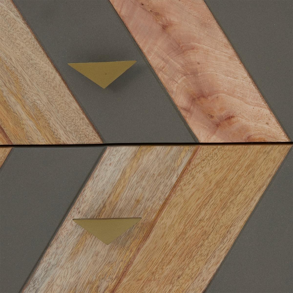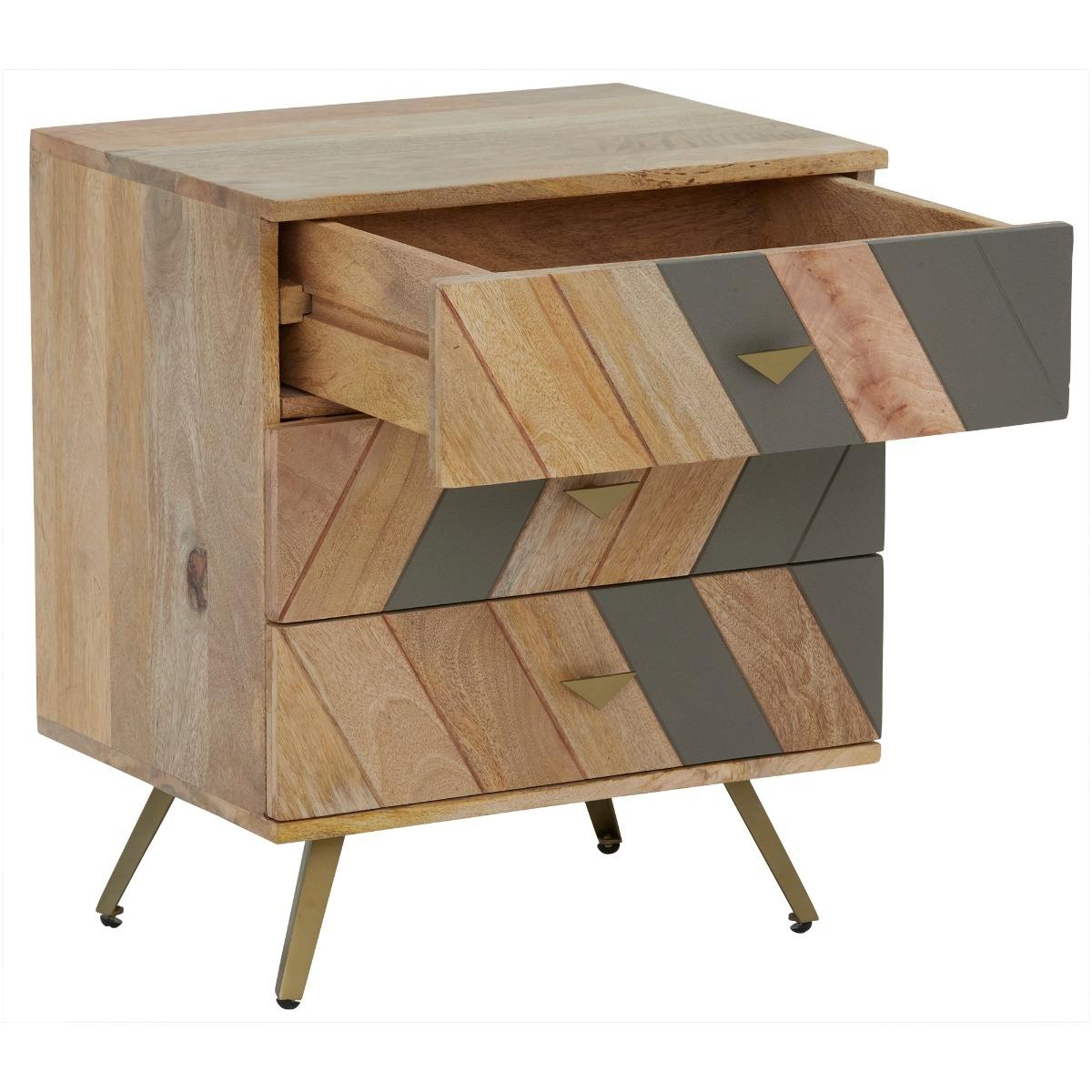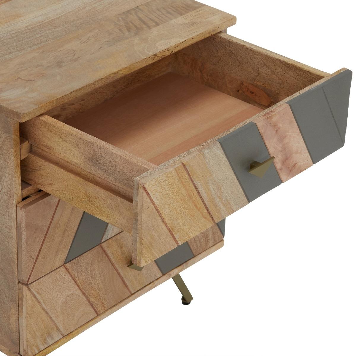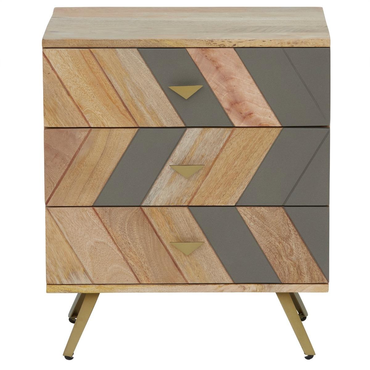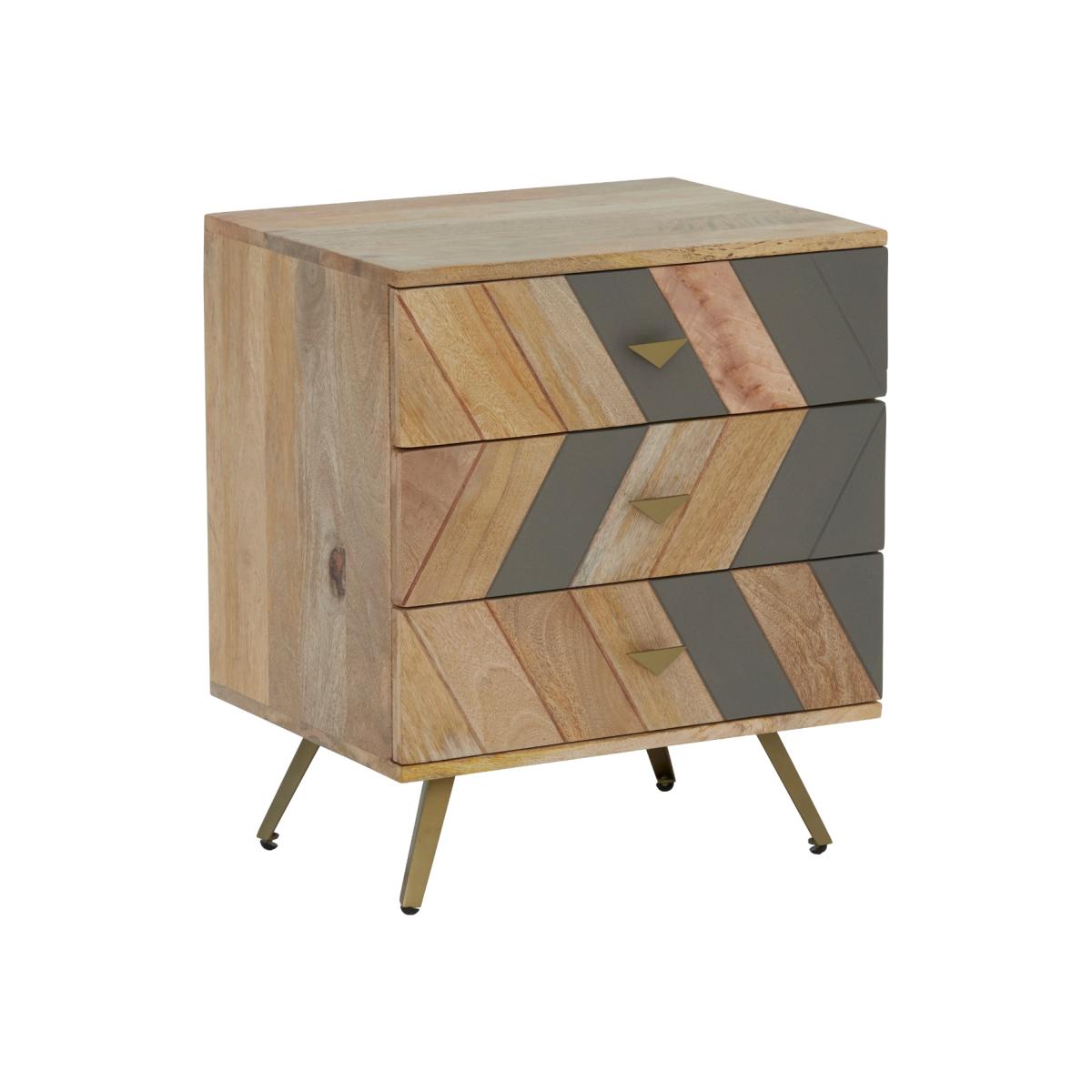 Design. The beautiful Leif 3 Drawer Bedside Table is handcrafted from rustic mango wood with a stunning natural finish to accentuate its unique knots and grains. Artfully bringing urban concrete into the mix to complete its chevron design, the Leif has an on-trend suburban look that is perfect for the modern home. Ideal for bedrooms or perhaps a stylish lamp table in your living space, the Leif’s 3 roomy drawers offer ample storage, with elegant, brass handles and sturdy splayed legs for a graceful finishing touch.