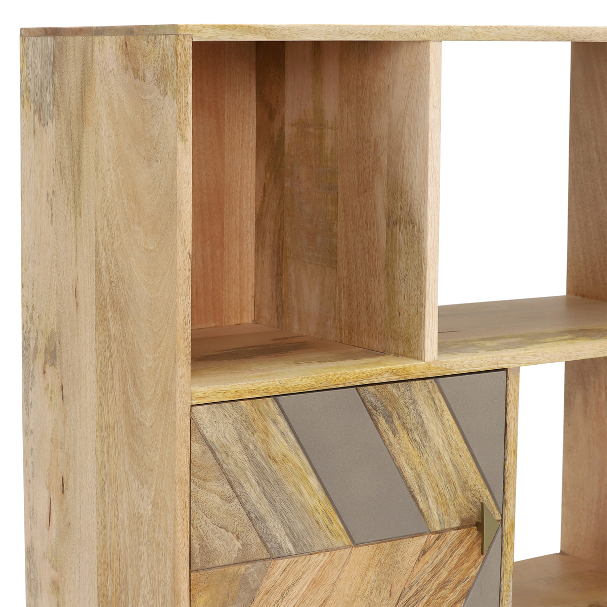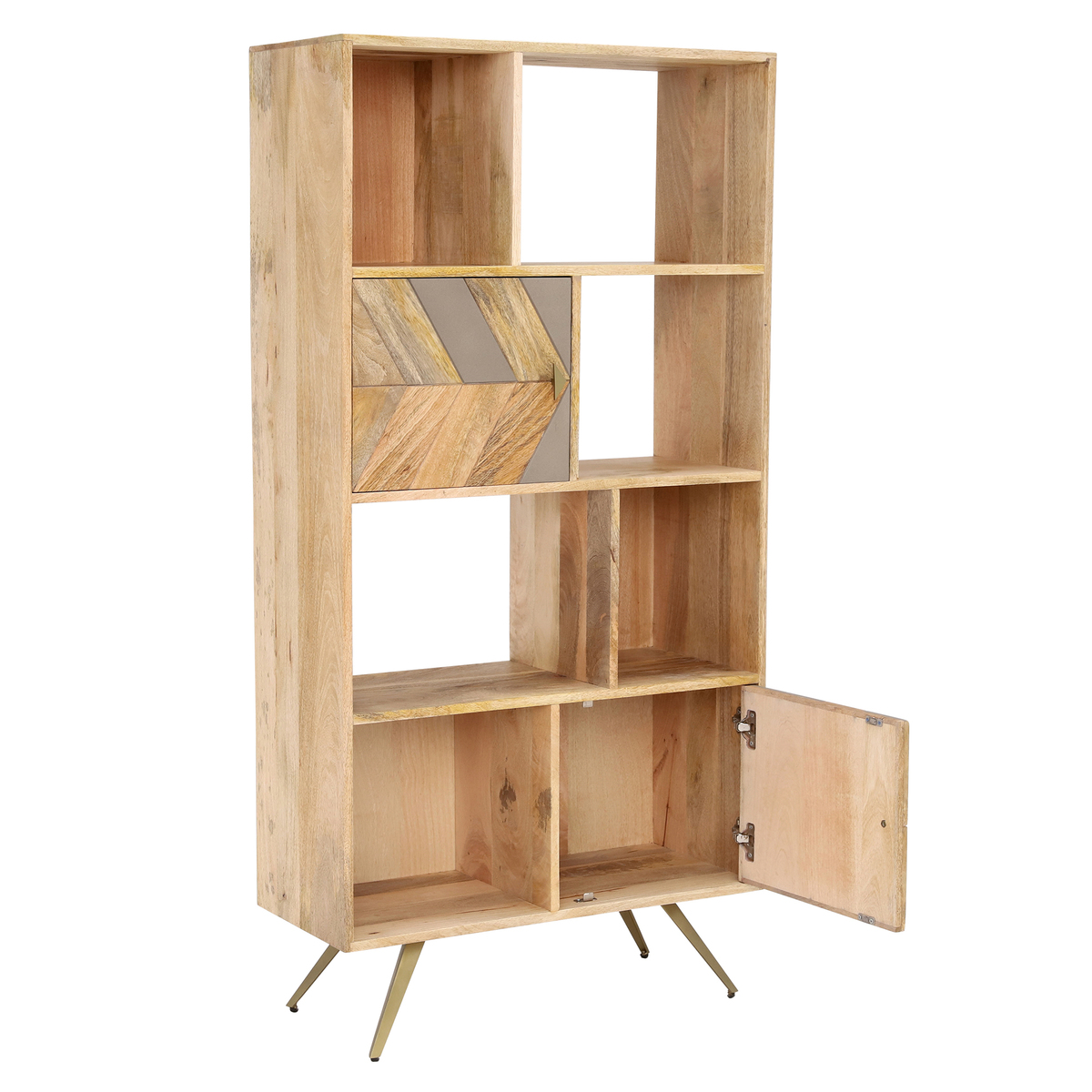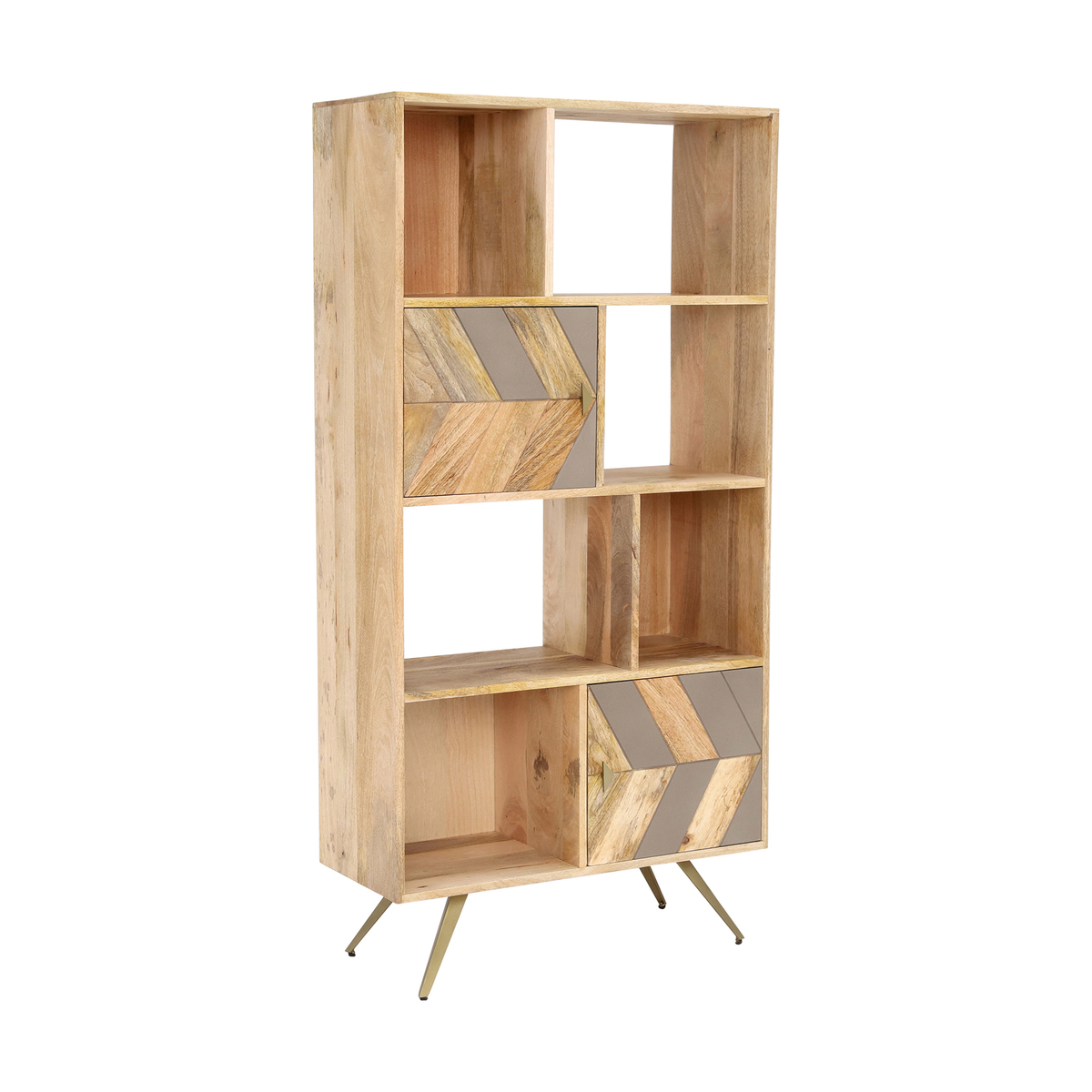 Shake up your space (and your storage) with the modern-rustic Leif Bookcase. With contemporary, splayed legs providing an enviable sense of spaciousness, the Leif features 6 handy shelves of varied sizes that are great for storage and display purposes alike. Including the added perk of 2 roomy cupboards for those slightly less organised items, the doors include the Leif's staple chevron patterning that beautifully brings together natural mango wood and urban concrete for a fresh and airy finish.