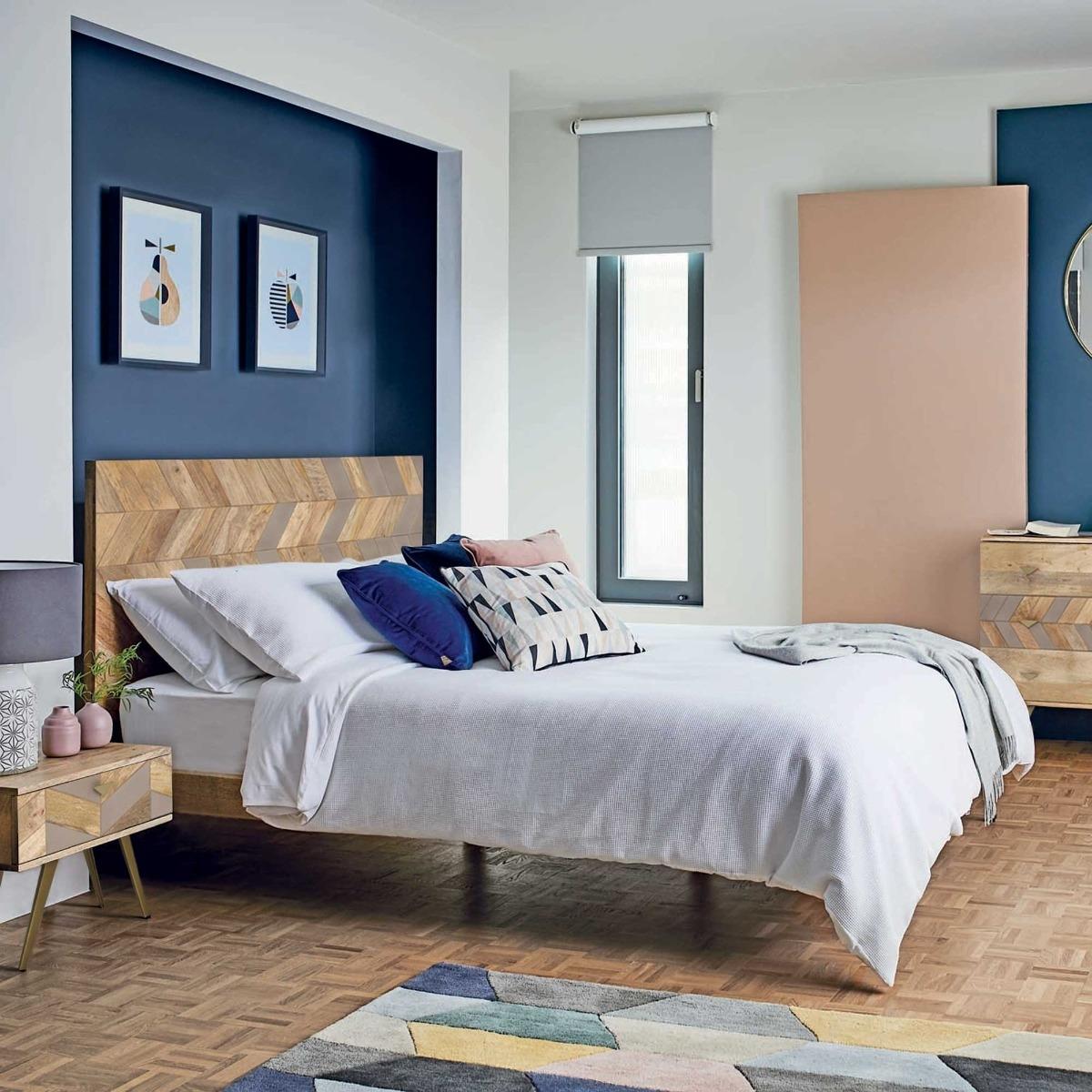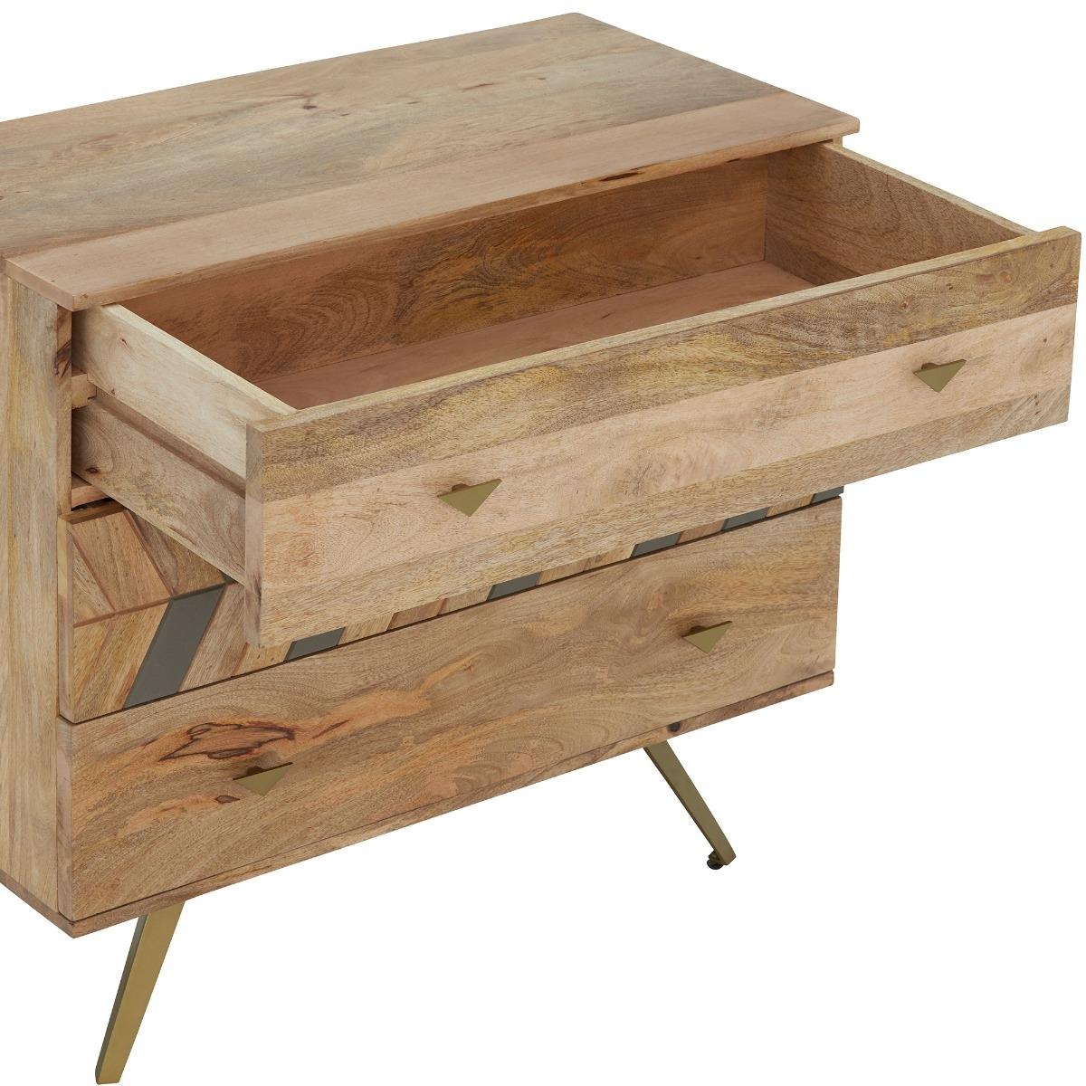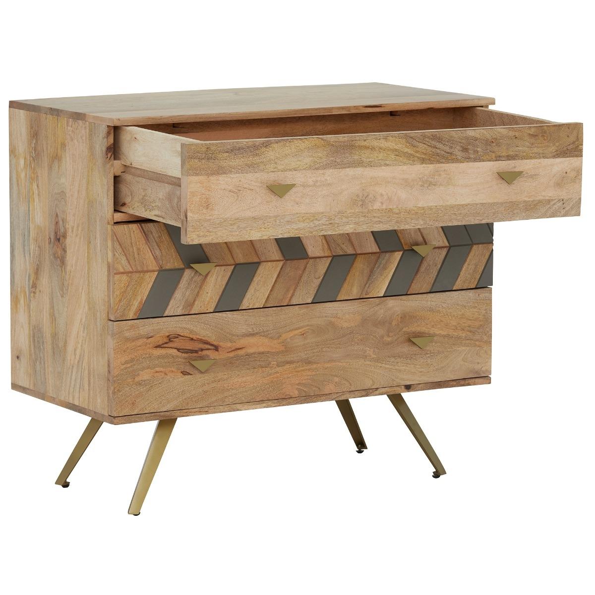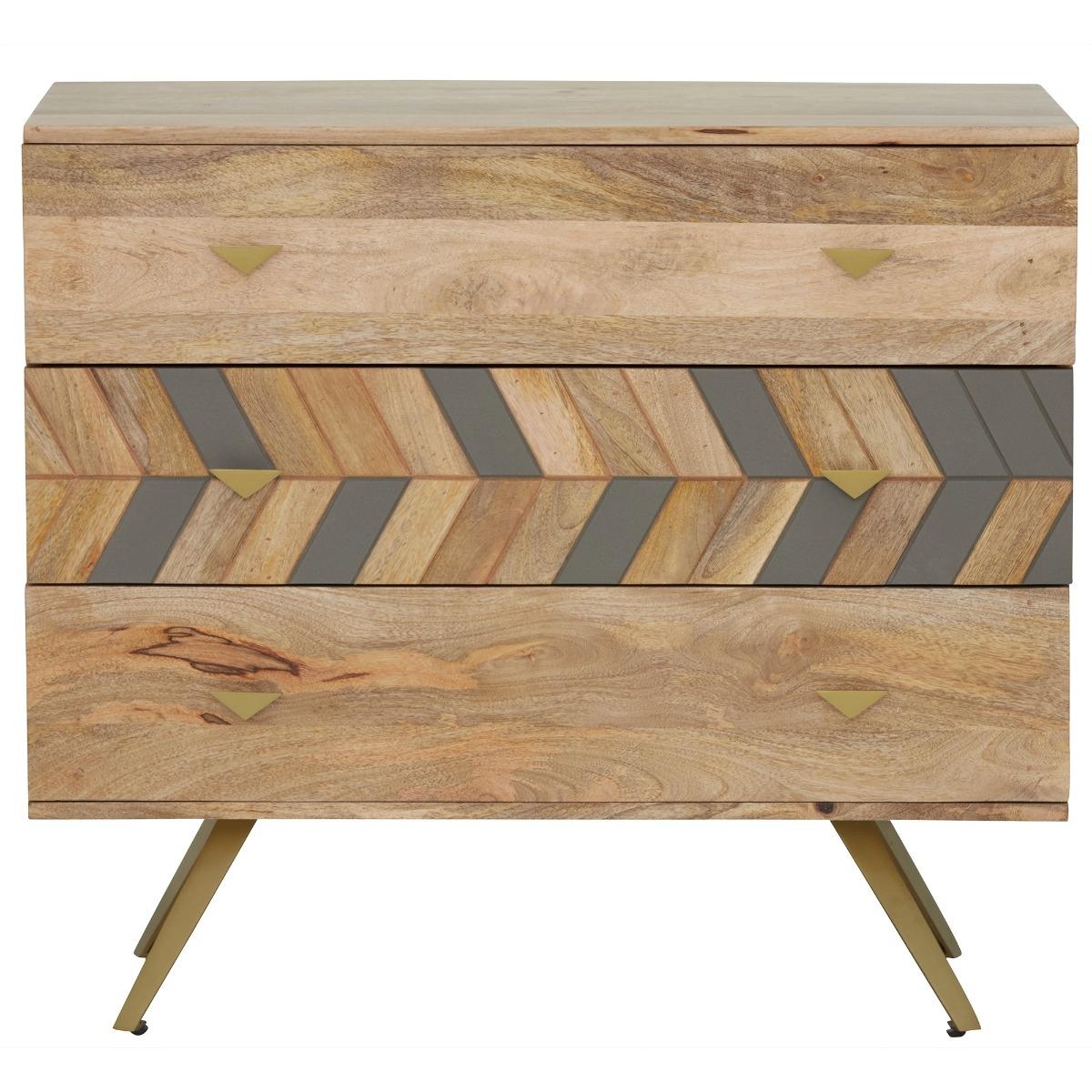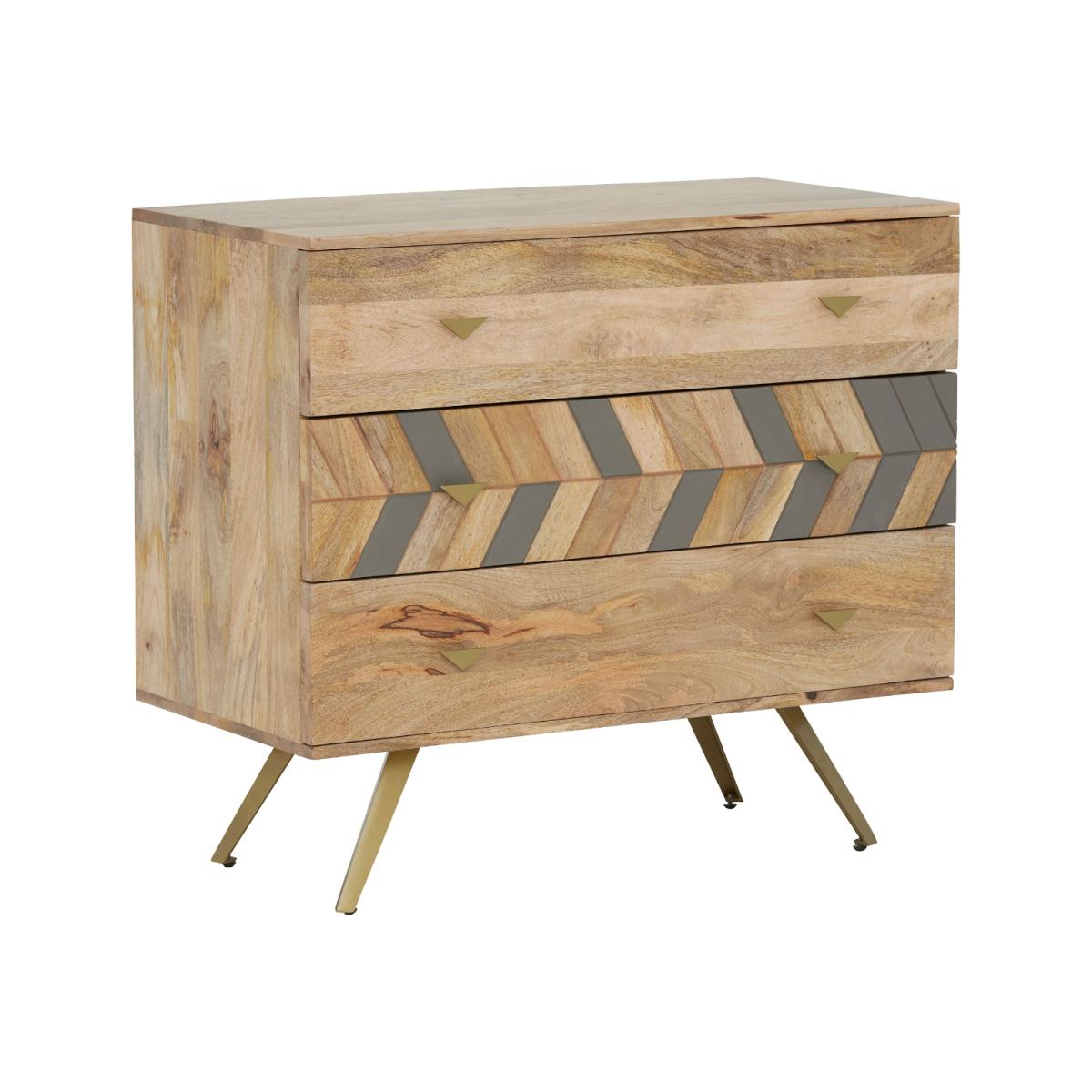 Design. With its clean and simple silhouette yet elegant and traditional detailing, the Leif Chest of 3 Drawers is a perfect combination of contemporary and classic. In a rich brass finish, the splayed metal legs and geometric handles provide on-trend modern glamour, whilst one drawer front is detailed with a traditional parquet design and cool concrete inlays. The chest is made from mango wood with a charmingly natural finish, enhancing the unique grains, textures and colours of the timber. Beautifully matched with the coordinating Leif wardrobe, bed and bedside table, it is a timeless and eclectic piece that will be admired for years to come.