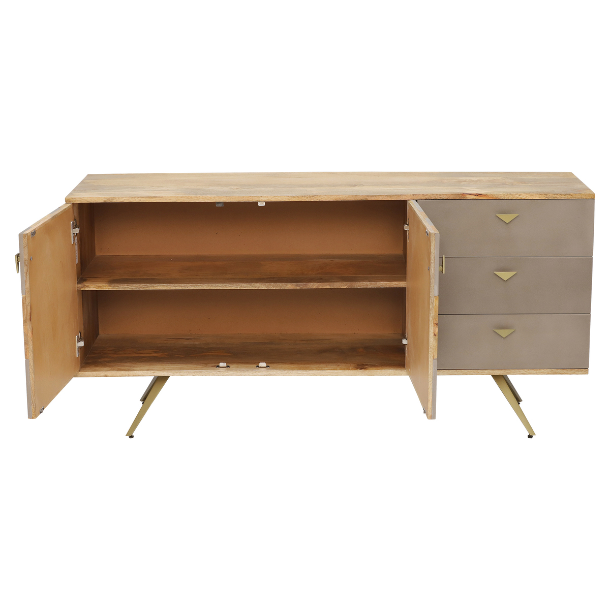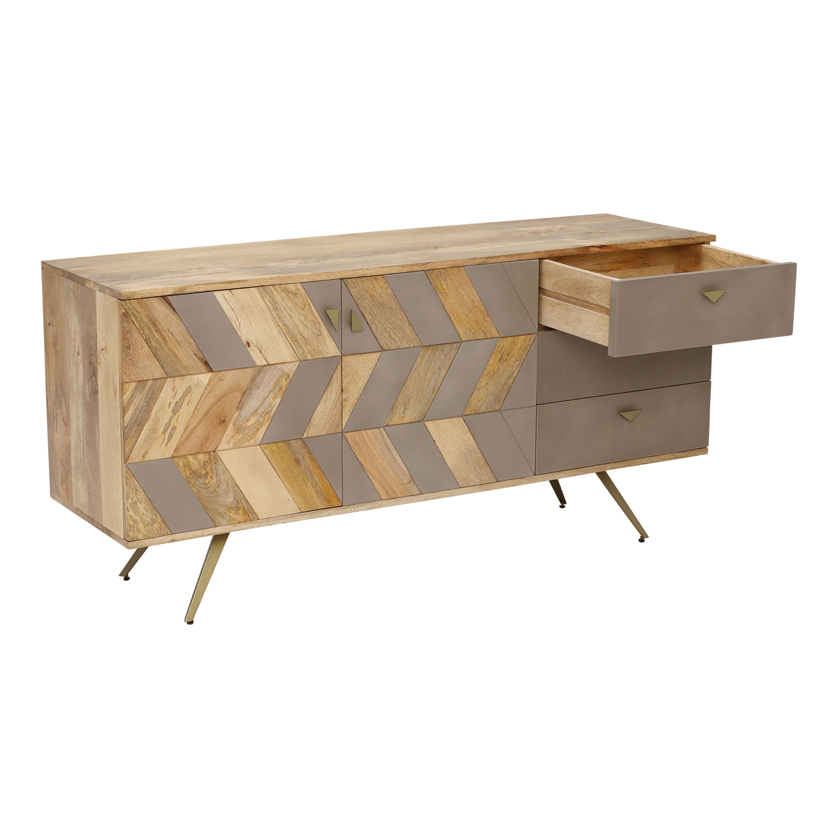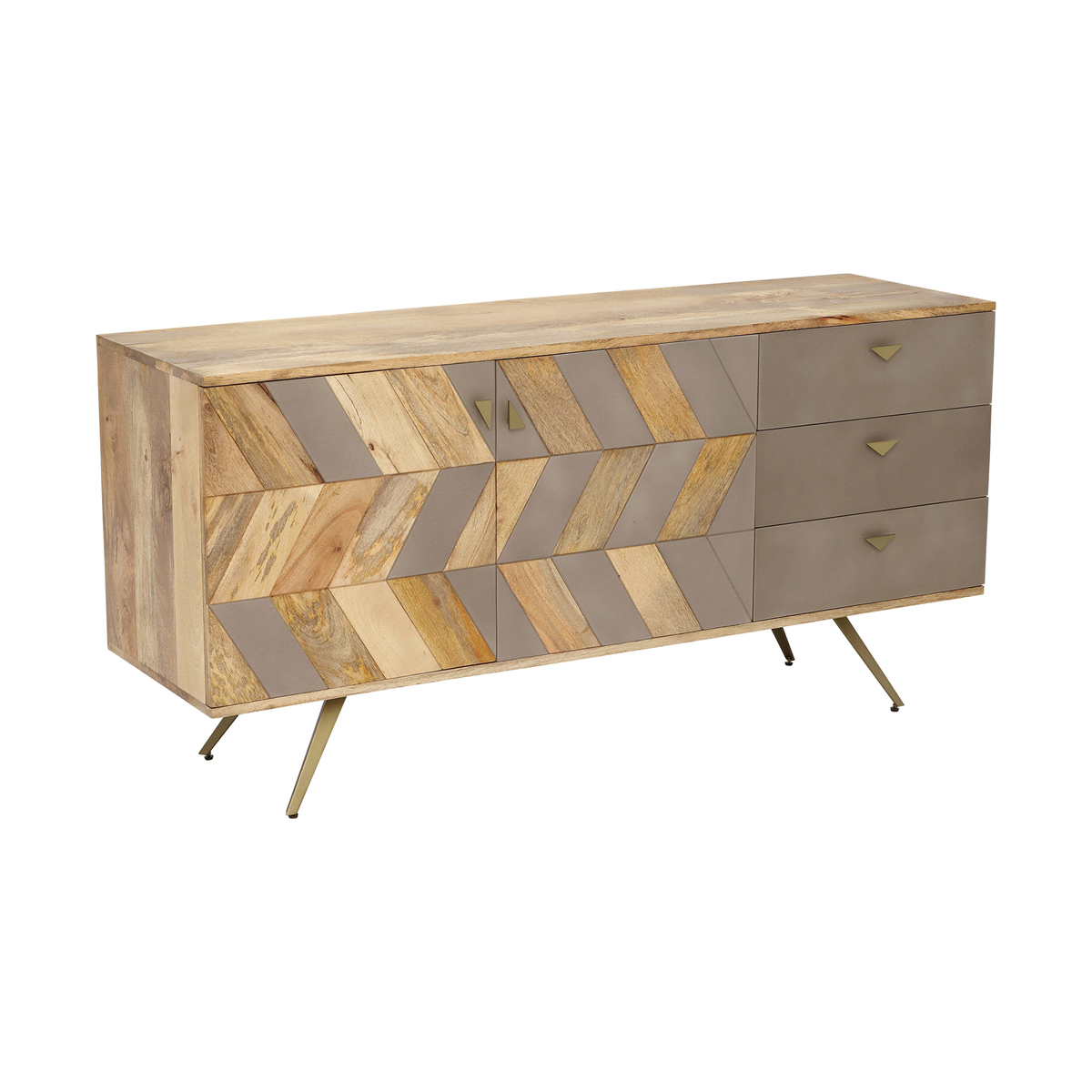 Beautifully blending the natural qualities of mango wood with the smoothness of concrete, the Leif sideboard is a versatile statement piece that sits suitably in both modern and industrial settings. Its bold shapes, clean lines and stylish parquet doors evoke classic mid-century sophistication, whilst brass accents lift the look with a glamorous touch.;Set upon slim splayed legs, the Leif sideboard is sharp yet spacious, with three drawers for easy organisation and two doors enclosing a large compartment with a fixed shelf. Surround with rich colours and mixed textures to make the most of its eclectic appeal.