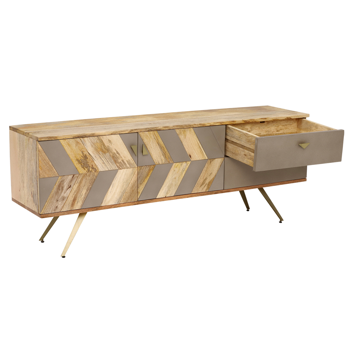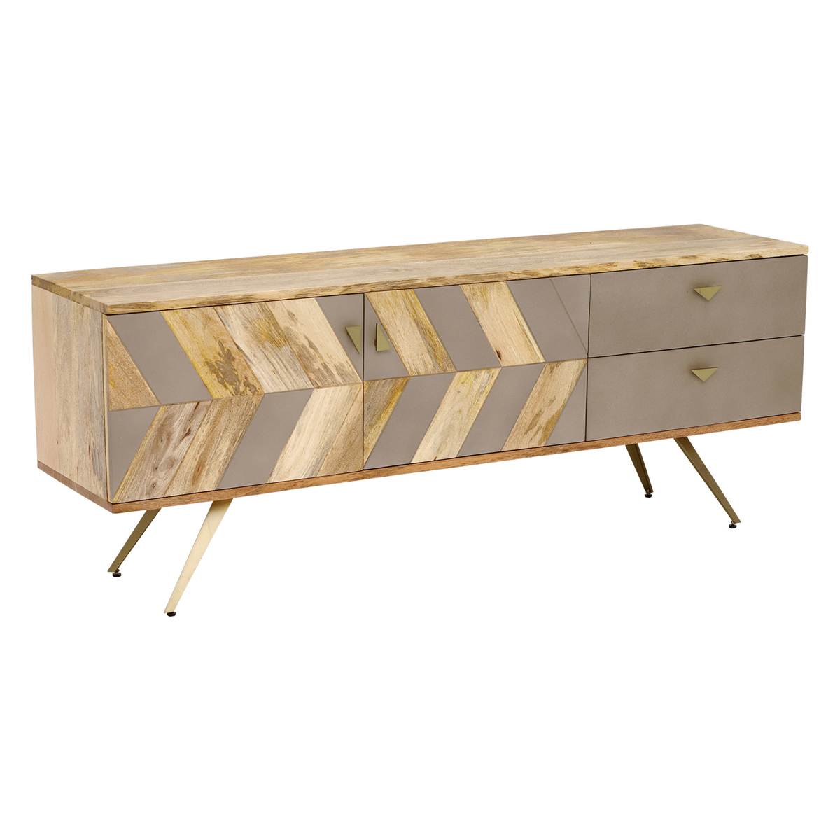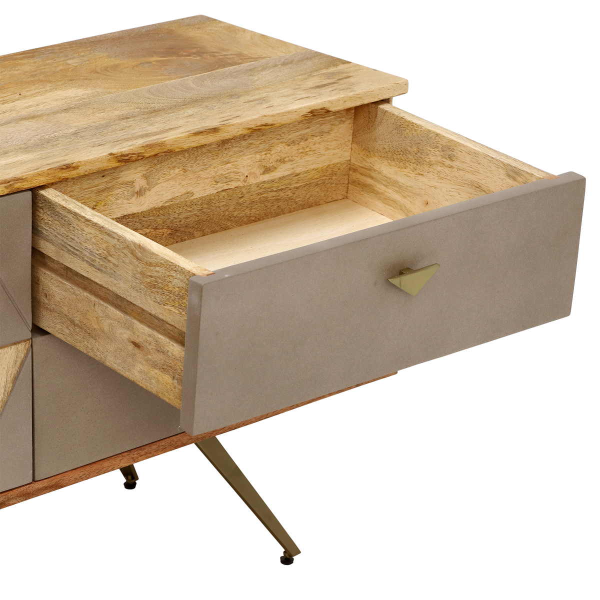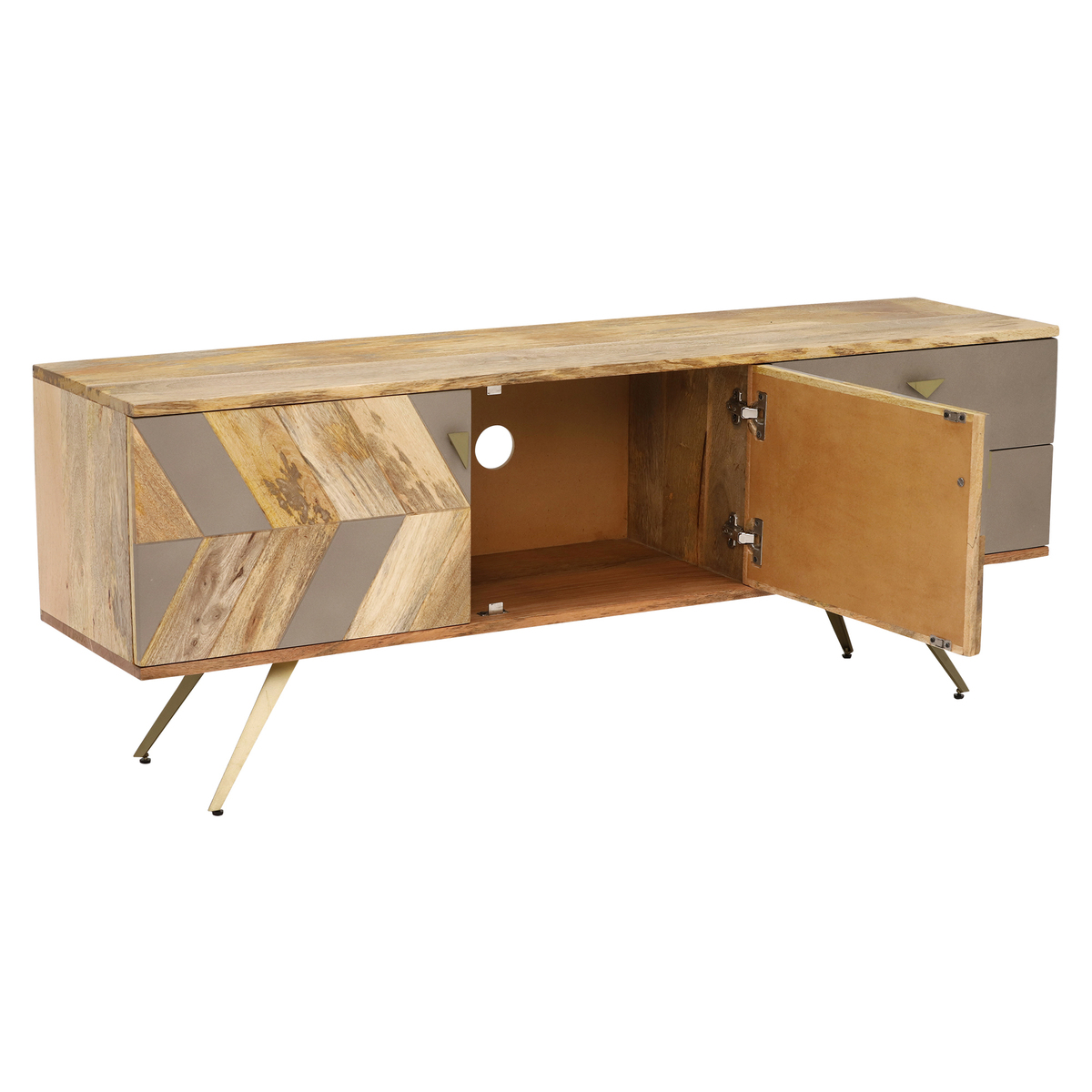 A gorgeous addition to modern or Scandi interiors, the Leif TV Unit showcases the natural beauty of Mango Wood and the contemporary versatility of concrete. Set upon splayed legs in a stylish brass finish, it features a simple silhouette enhanced by parquet doors and geometric brass handles. Adding depth and dimension, this combination of colours, grains and textures makes the TV stand perfect for both warm and cool interiors.;Spacious up top with room for decorative accessories, the Leif contains a large compartment behind double doors, as well as two drawers for all of those remotes, manuals and entertainment essentials. Sure to take the leading role in your living room, it is twice as stunning when matched with the coordinating coffee table.