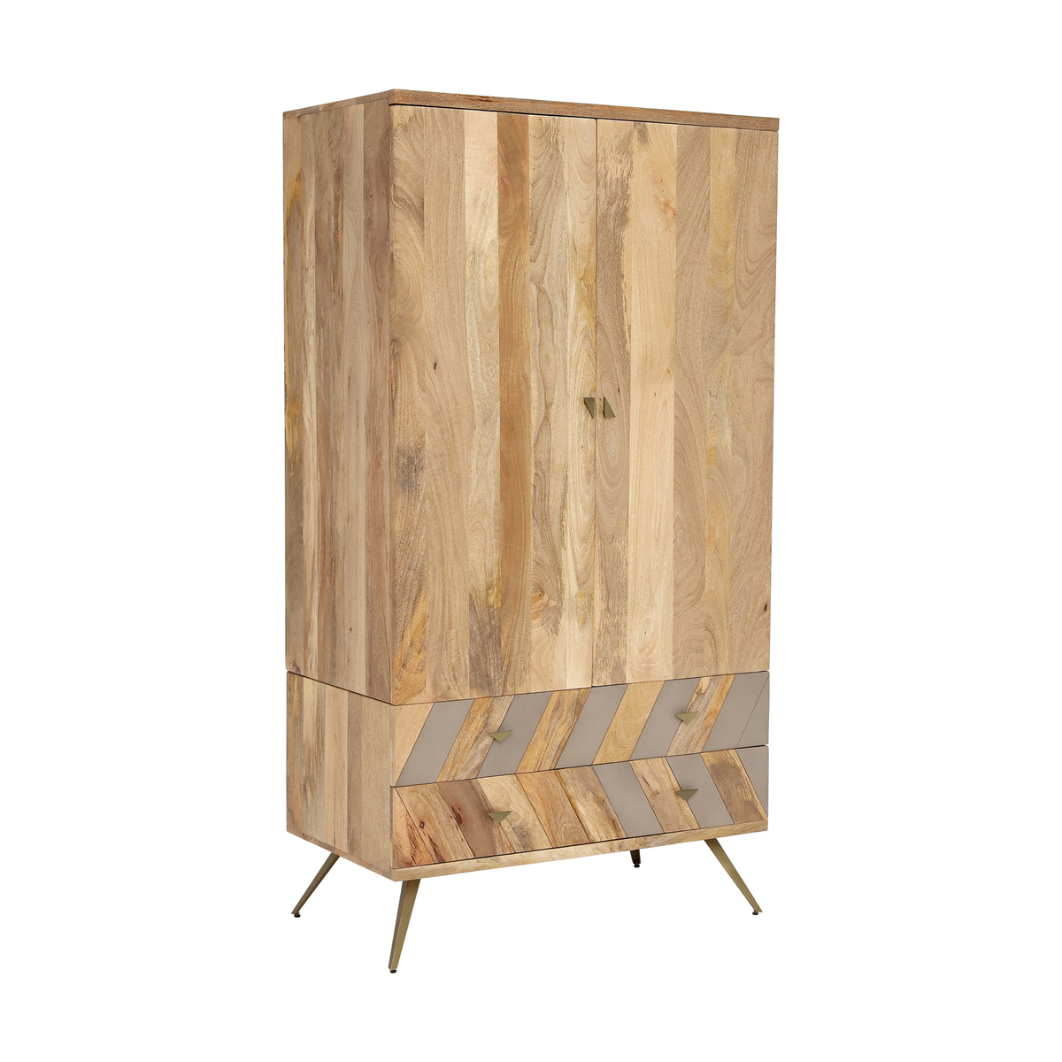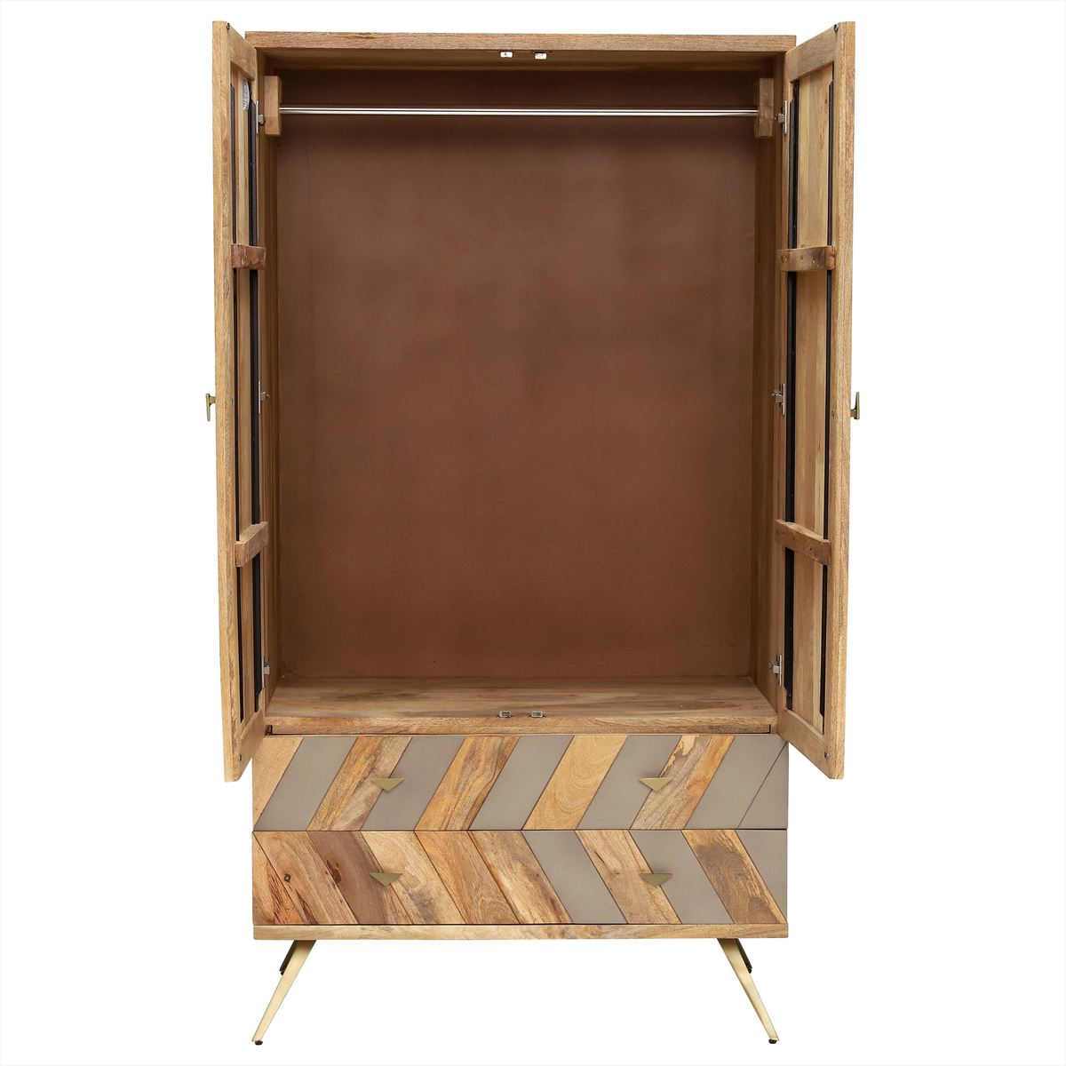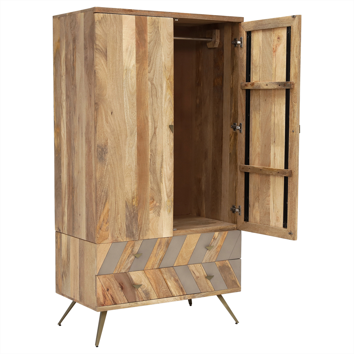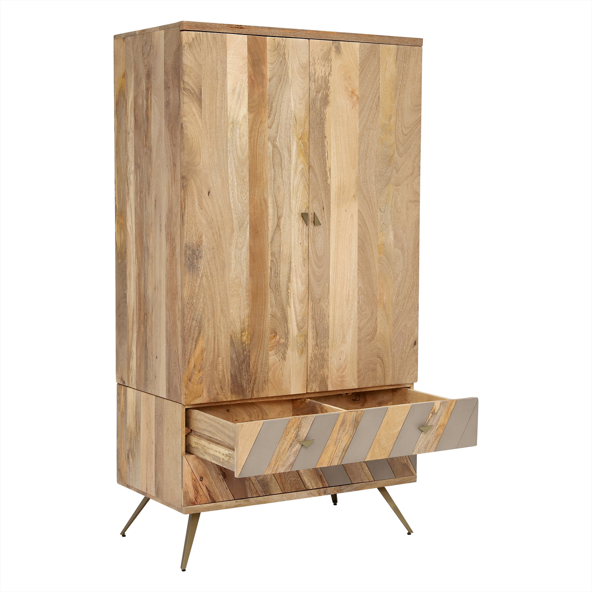 Making use of rich Mango Wood in a natural finish, the Leif wardrobe combines rustic charm with minimalist design and contemporary style features.;Its simple shape keeps things clean, whilst cool concrete inlays and traditional parquet patterns give the drawers a touch of intrigue. The wardrobe’s handles and legs are finished in a warm, on-trend brass hue, brining the look to life and delivering subtle glamour. Light and airy, yet suitably spacious, the Leif contains a large compartment with fixed hanging rail behind two hinged doors, as well as two handy drawers at the base.;Stylish and relaxed, it can be combined with the coordinating bed frame, chest of drawers and bedside table for an effortlessly unified look.