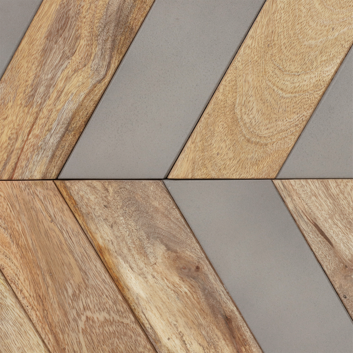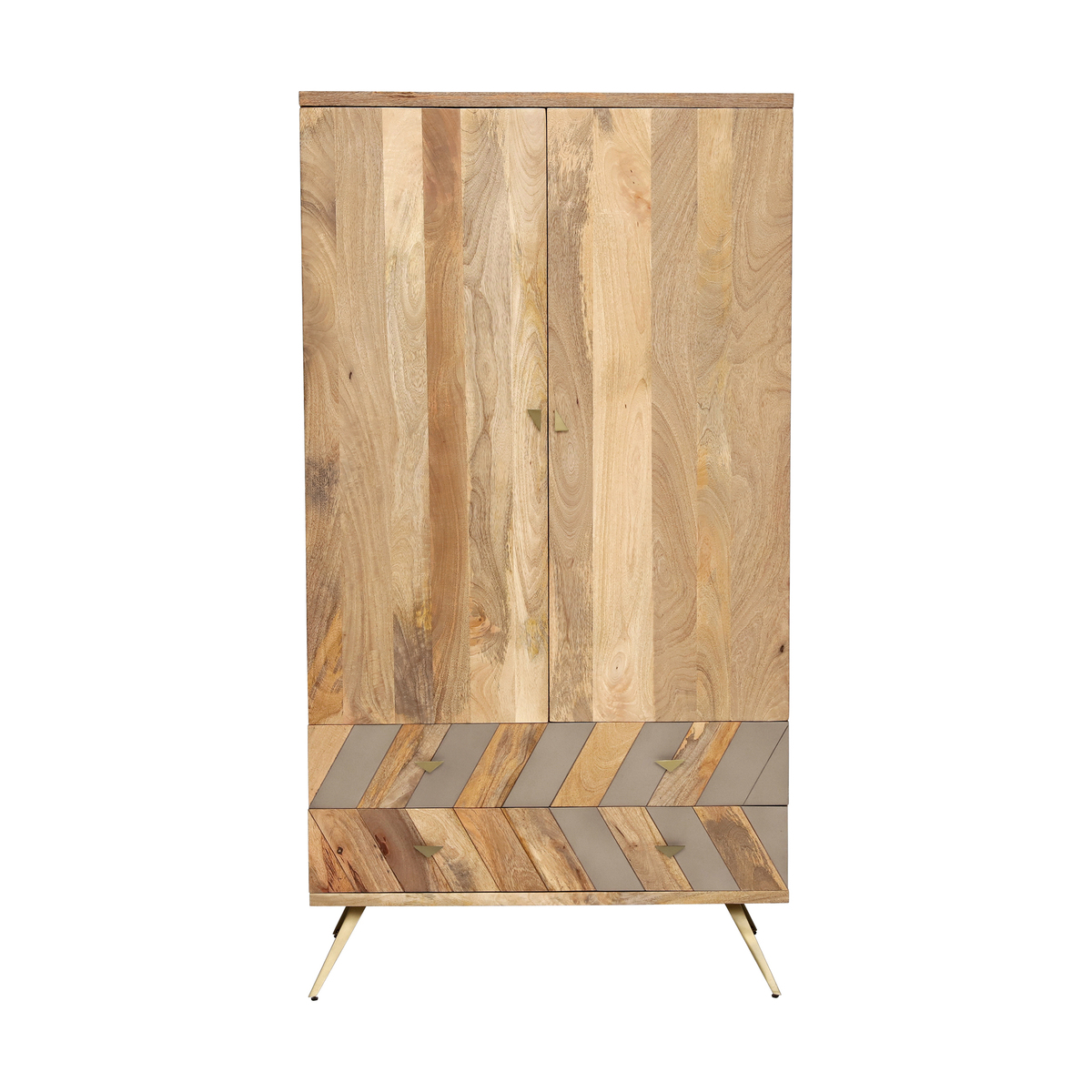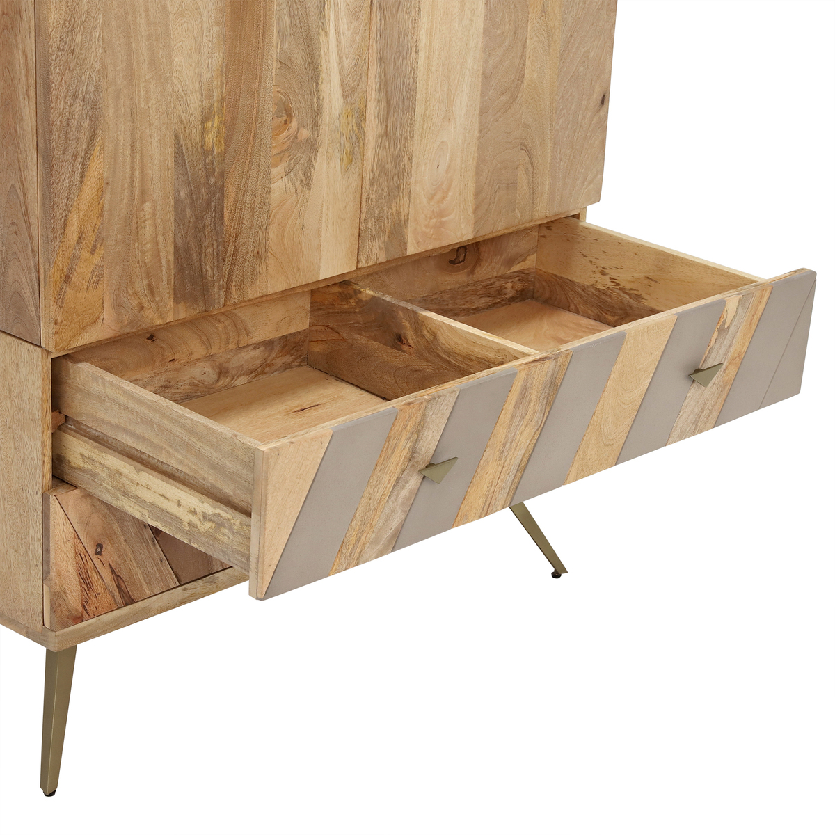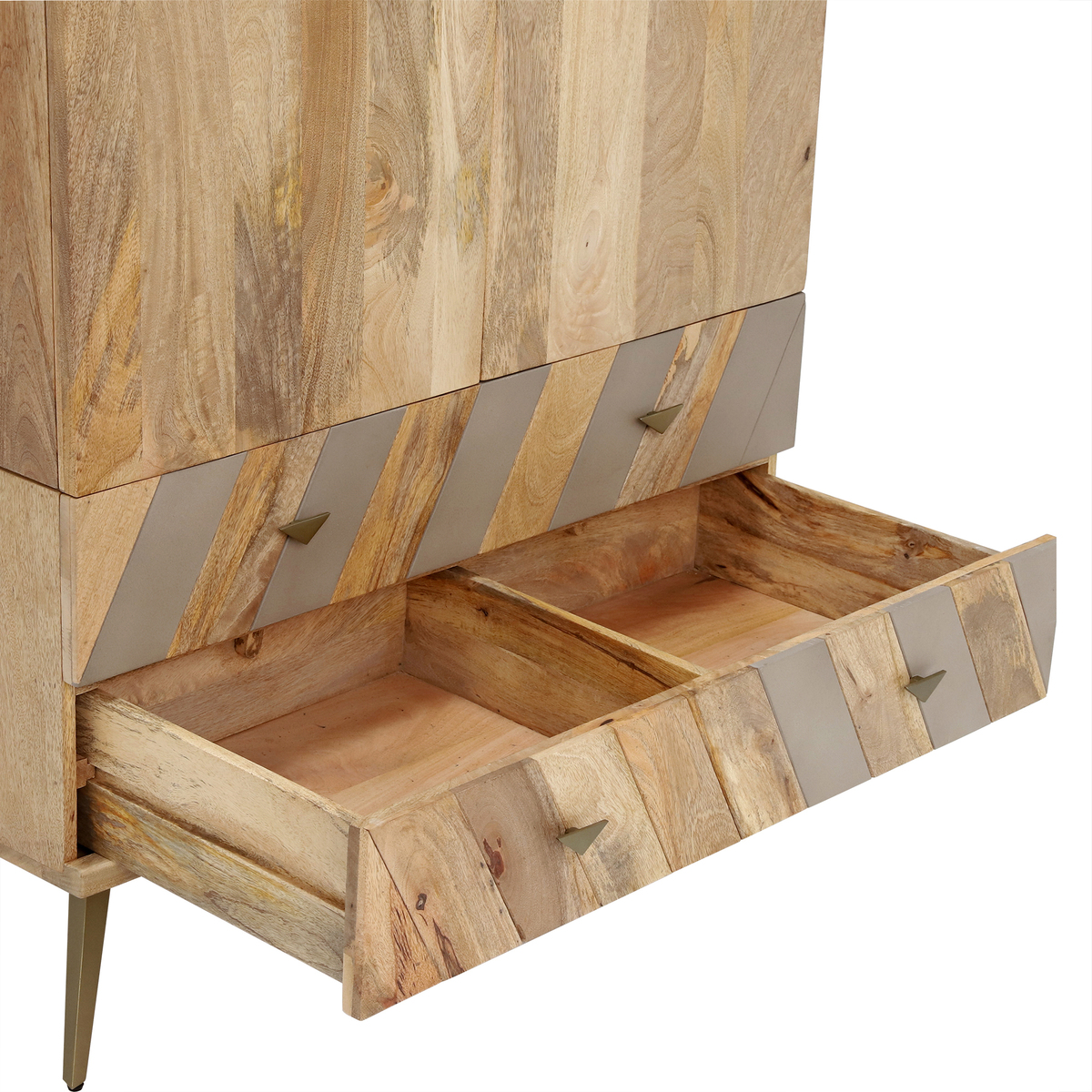 Making use of rich Mango Wood in a natural finish, the Leif wardrobe combines rustic charm with minimalist design and contemporary style features.;Its simple shape keeps things clean, whilst cool concrete inlays and traditional parquet patterns give the drawers a touch of intrigue. The wardrobe’s handles and legs are finished in a warm, on-trend brass hue, brining the look to life and delivering subtle glamour. Light and airy, yet suitably spacious, the Leif contains a large compartment with fixed hanging rail behind two hinged doors, as well as two handy drawers at the base.;Stylish and relaxed, it can be combined with the coordinating bed frame, chest of drawers and bedside table for an effortlessly unified look.