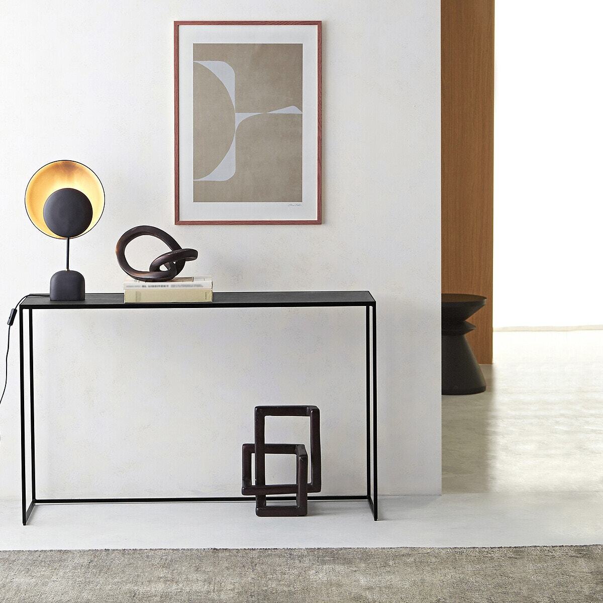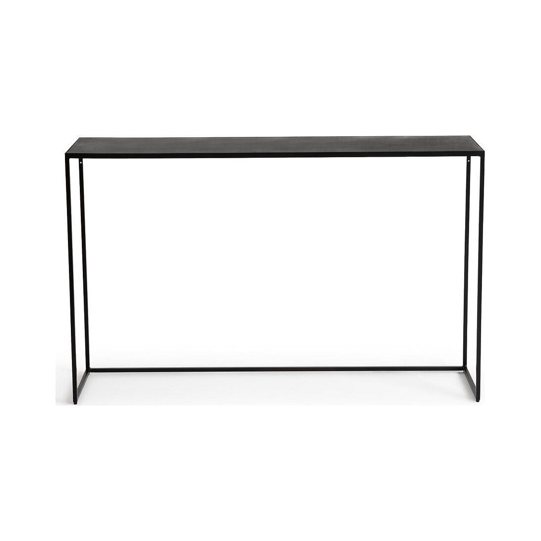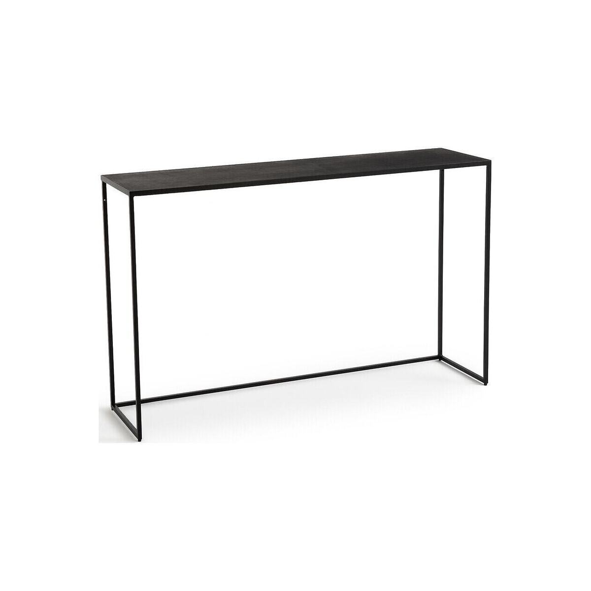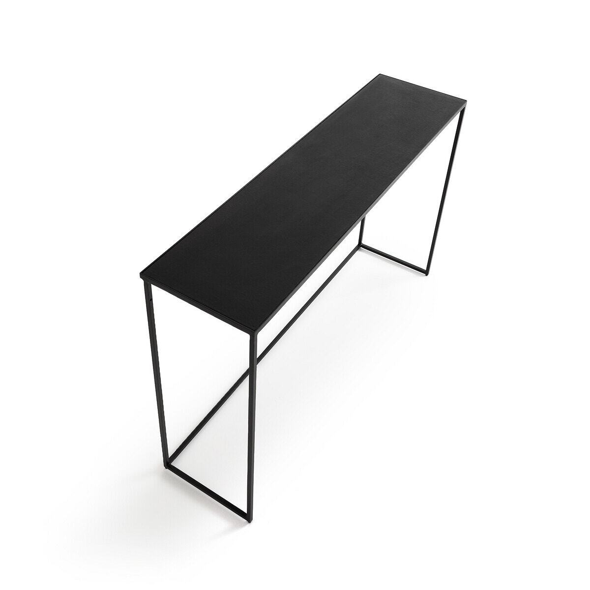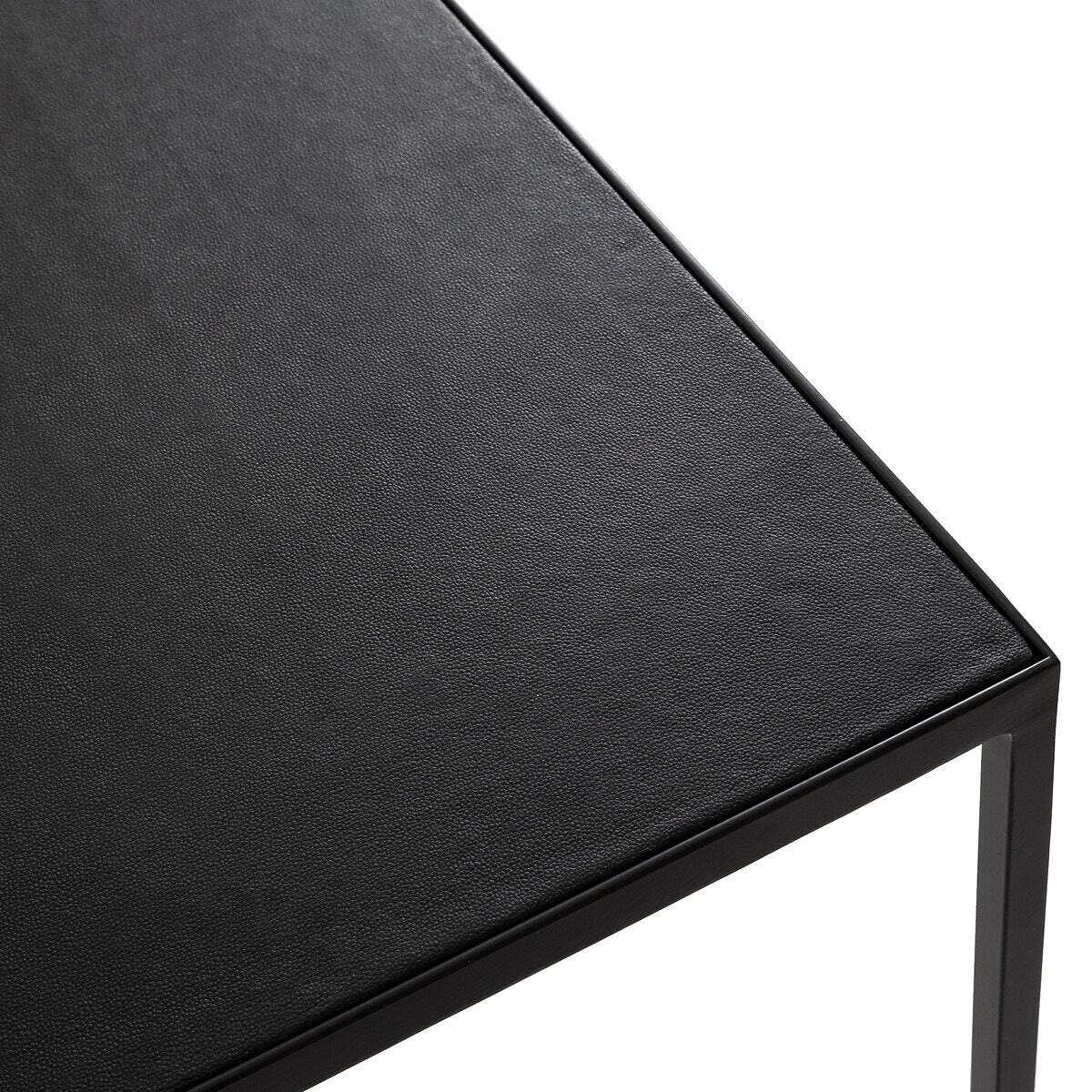 With its top covered in genuine Italian leather and its thin black metal base, the Leland console is a refined and modern piece of furniture.