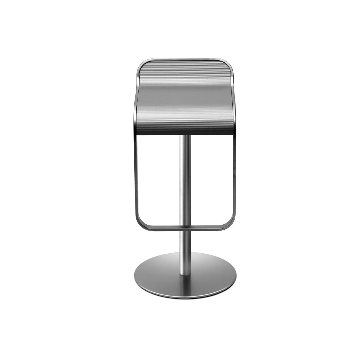 Stool with swivel seat and adjustable height with gas spring. Metal frame mat chromed and base in zinc-plated metal covered by a stainless steel sheet. Seat in curved wood, or in laminate with grooves. Designed by Shin & Tomoko Azumi, the bar stool Lem has become a real design classic. Whether in a bar, on a fair or at home - Lem always provides an elegant and comfortable seating. The bar stool rotates and due to its gas spring it is adjustable in height. The base frame consists of high-quality mat chromed metal. The seat is in Aluminium (grey) laminate with grooves.
