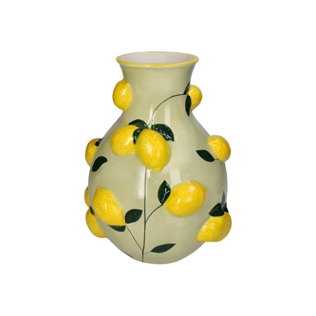 I love this lemon and stoneware vase for its playful yet sophisticated character. Its vibrant yellow lemons add a pop of colour that works beautifully in both modern and traditional interiors, especially those with fresh, sunny palettes or natural accents. It's versatile enough to hold seasonal blooms or single statement stems, making it a practical choice for centrepieces or decorative bits on a sideboard. I’d suggest pairing it with neutral surroundings to let its colours shine, or mixing with other bold ceramics for an eclectic look. Its size and shape lend well to shelf styling or as a standalone statement piece on a console, bringing a touch of freshness and flavour to any room.