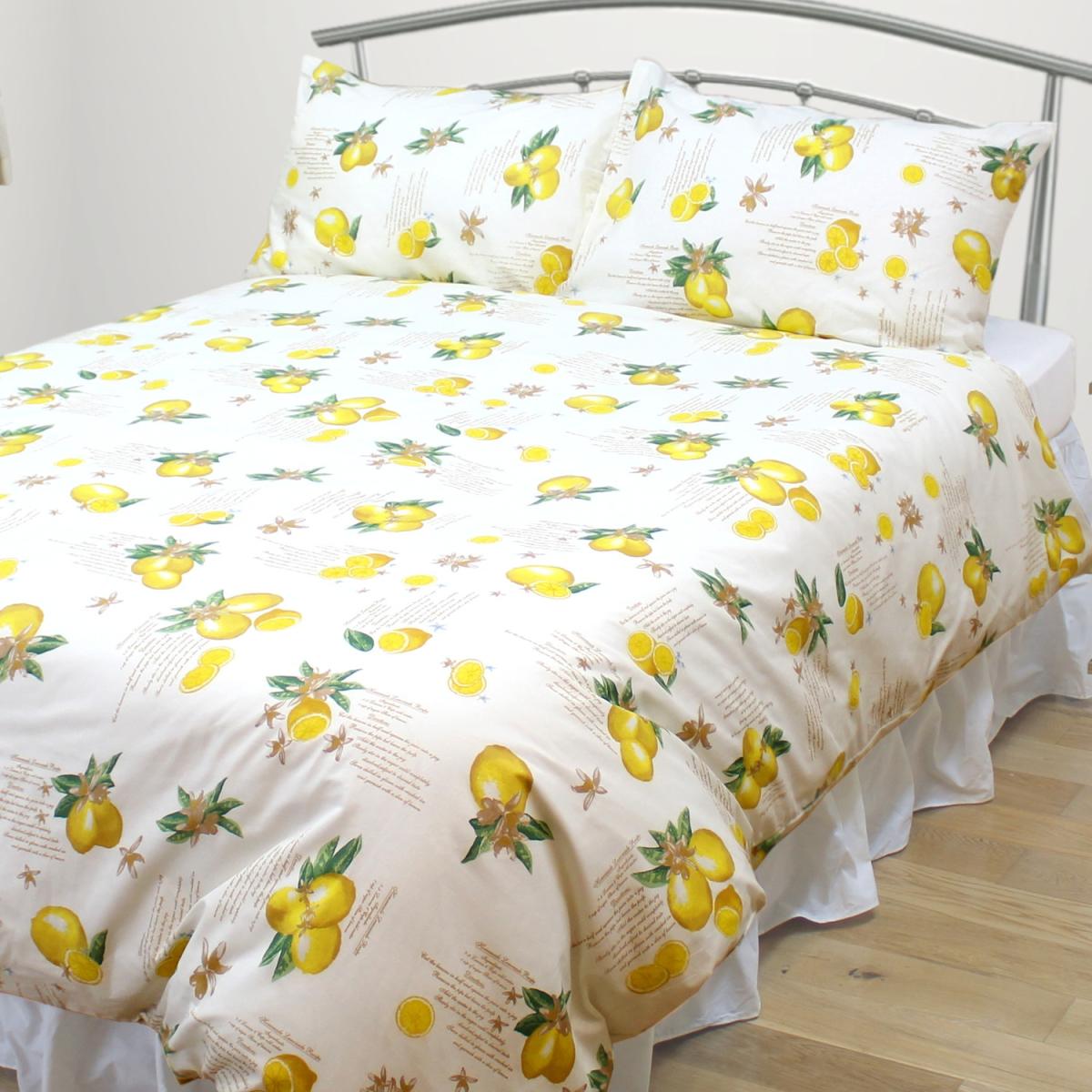 This beautifully printed duvet cover features lemons and script text for lemonade, with flowers in shades of yellow and green, on an off-white ground. Gives a rustic country cottage feel. Matching items such as curtains, tablecloths and seat pads are available separately.