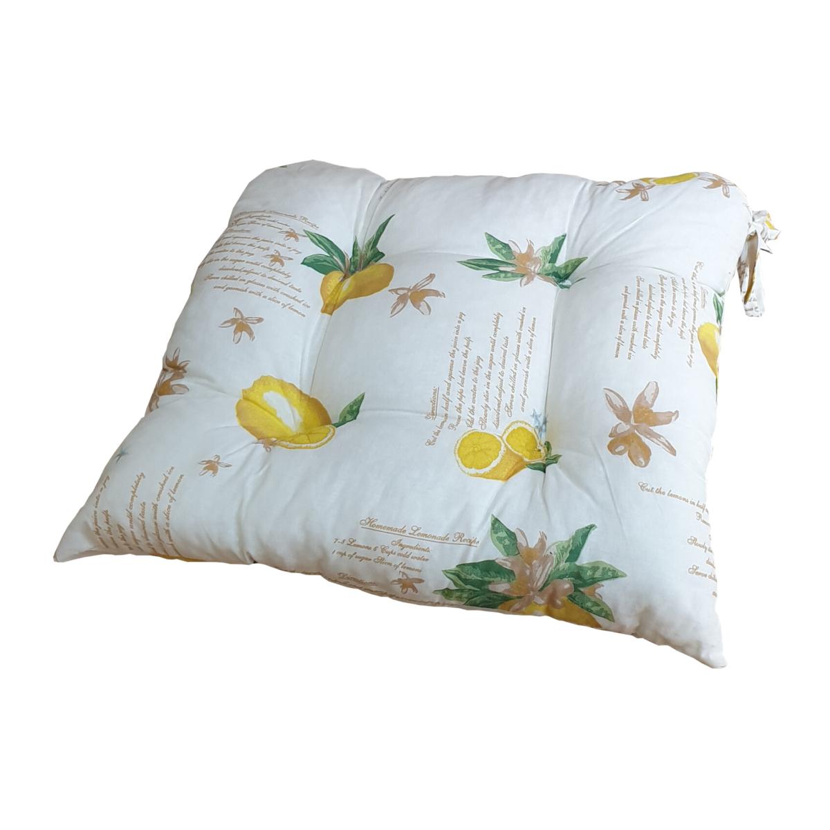 Beautifully printed seat pad featuring lemon-themed design in shades of yellow, green, and beige on an off-white ground. 100% cotton outer material with polyester filling and fabric ties for fastening to furniture. A circular quilting finish provides an elegant touch to your seating.
