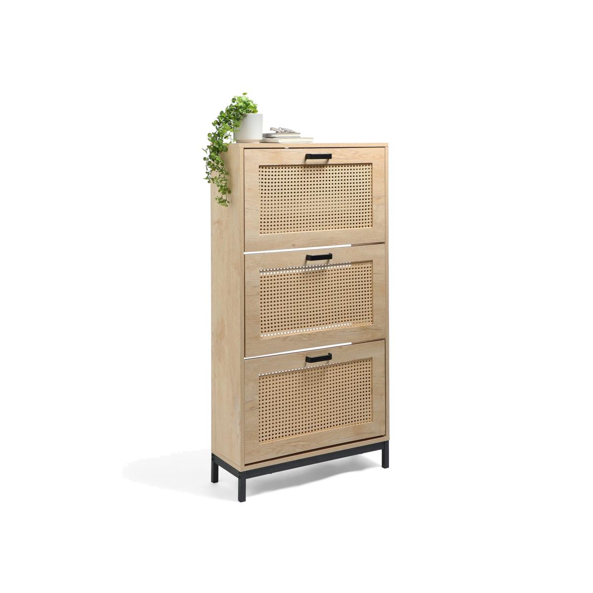 Bohemian textures, Scandi tones, and industrial accents: introduce style into your hallway with the Von Haus shoe storage unit. Crafted from light wood effect MDF, the rattan fronted drawers keep contents contained in rustic style, whilst the black metal frame and handles add a bold finishing touch. Shoe Cupboard with 3 Pull Down Drawers, Lena Range for Hallway and Living Room. Keep not-so-pretty muddies out of sight whilst presenting a sleek aesthetic. Featuring three pull down doors, each compartment includes a removable middle shelf. Store up to 18 pairs of shoes with the shelves inserted, or up to 9 pairs of bulkier boots without. Super slimline, this shoe storage cabinet offers plenty of room for your shoes whilst remaining unobtrusive in your hallway. Browse the Lena range today to weave that boho touch throughout your home, get organised in style.